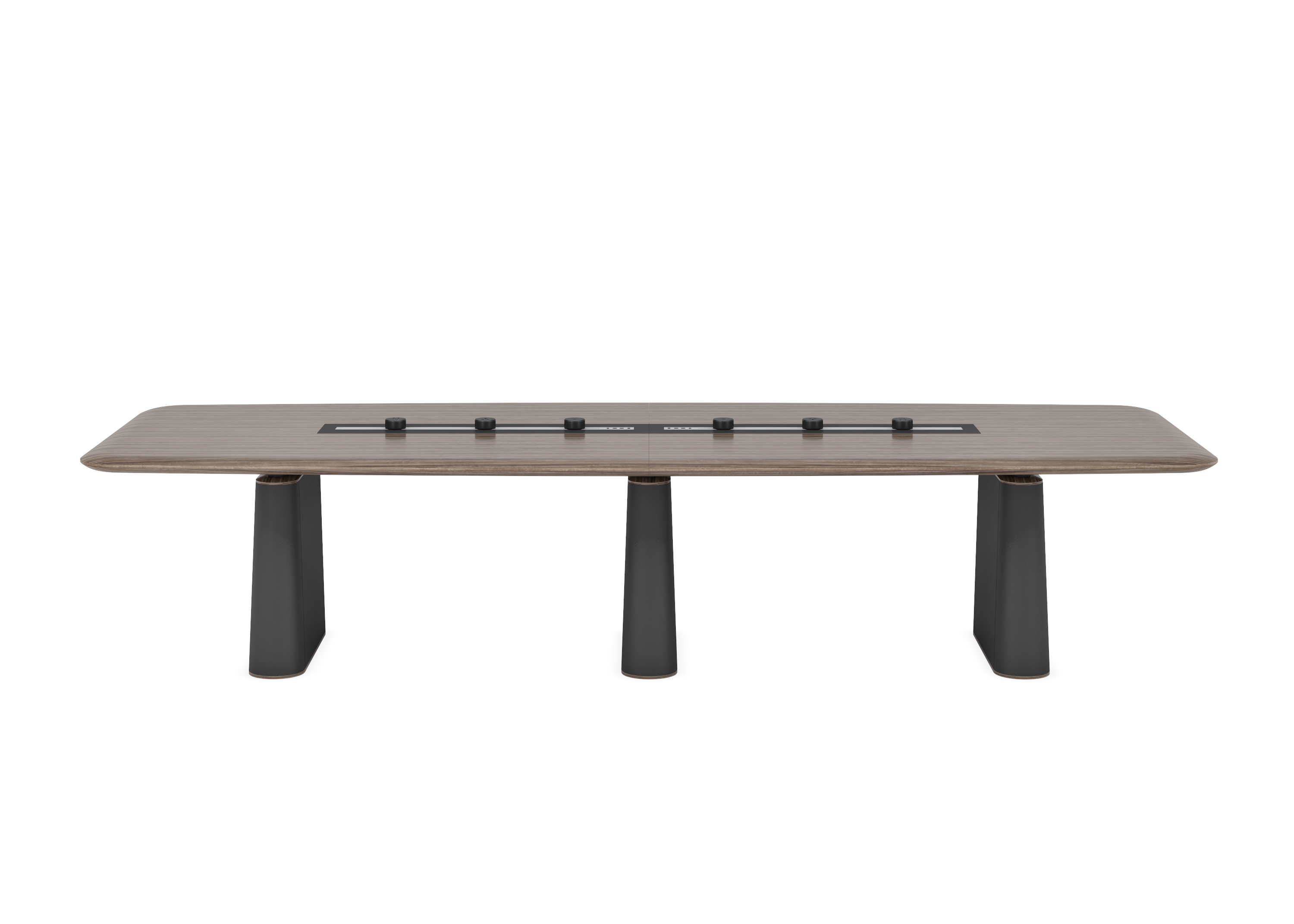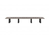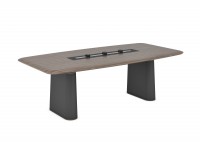 1、台面52mm厚,配电力路轨。2、锥形台脚支撑(台脚上线)。3、台面木皮+实色漆。4、台脚顶,底板木皮,其余实色漆。5、主要基材刨花板和中纤板。