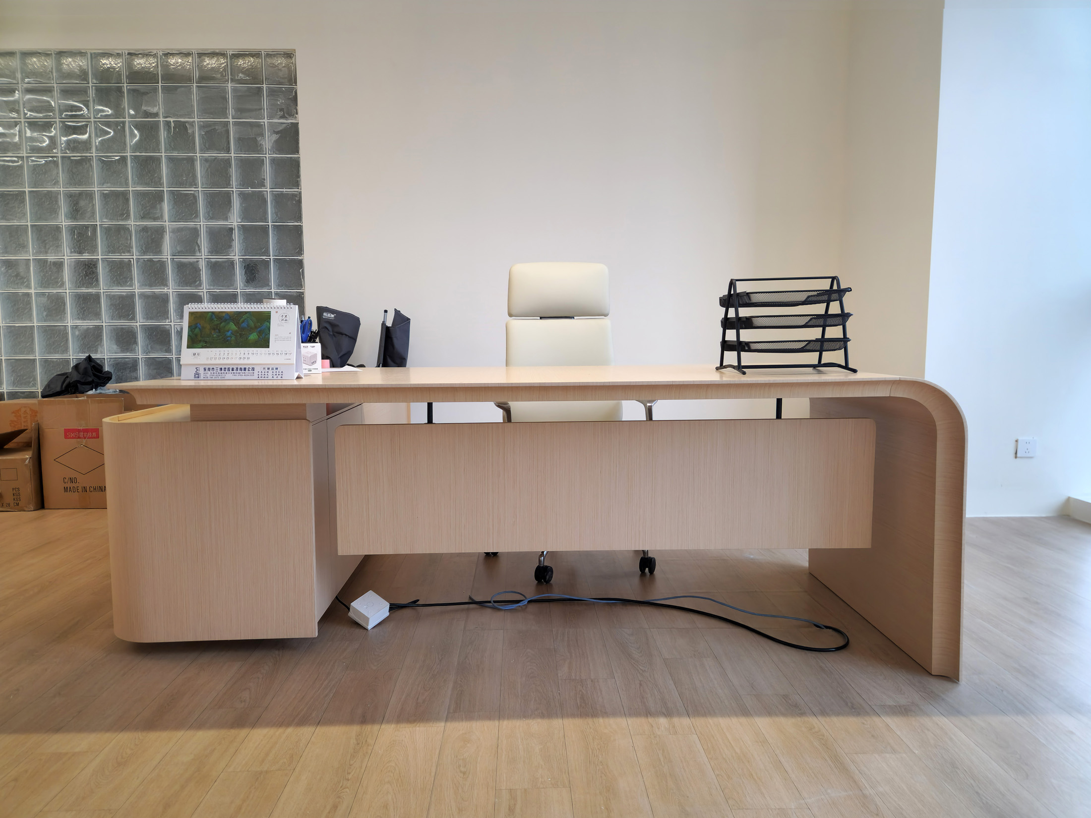 1、主台50mm厚木皮油漆,配集成线盒(配置为2强电+Type (A+C)+电话+网络+高清)黑色/银色可选;2、副柜木皮油漆,抽屉档条为三胺板,副柜配按弹式门。