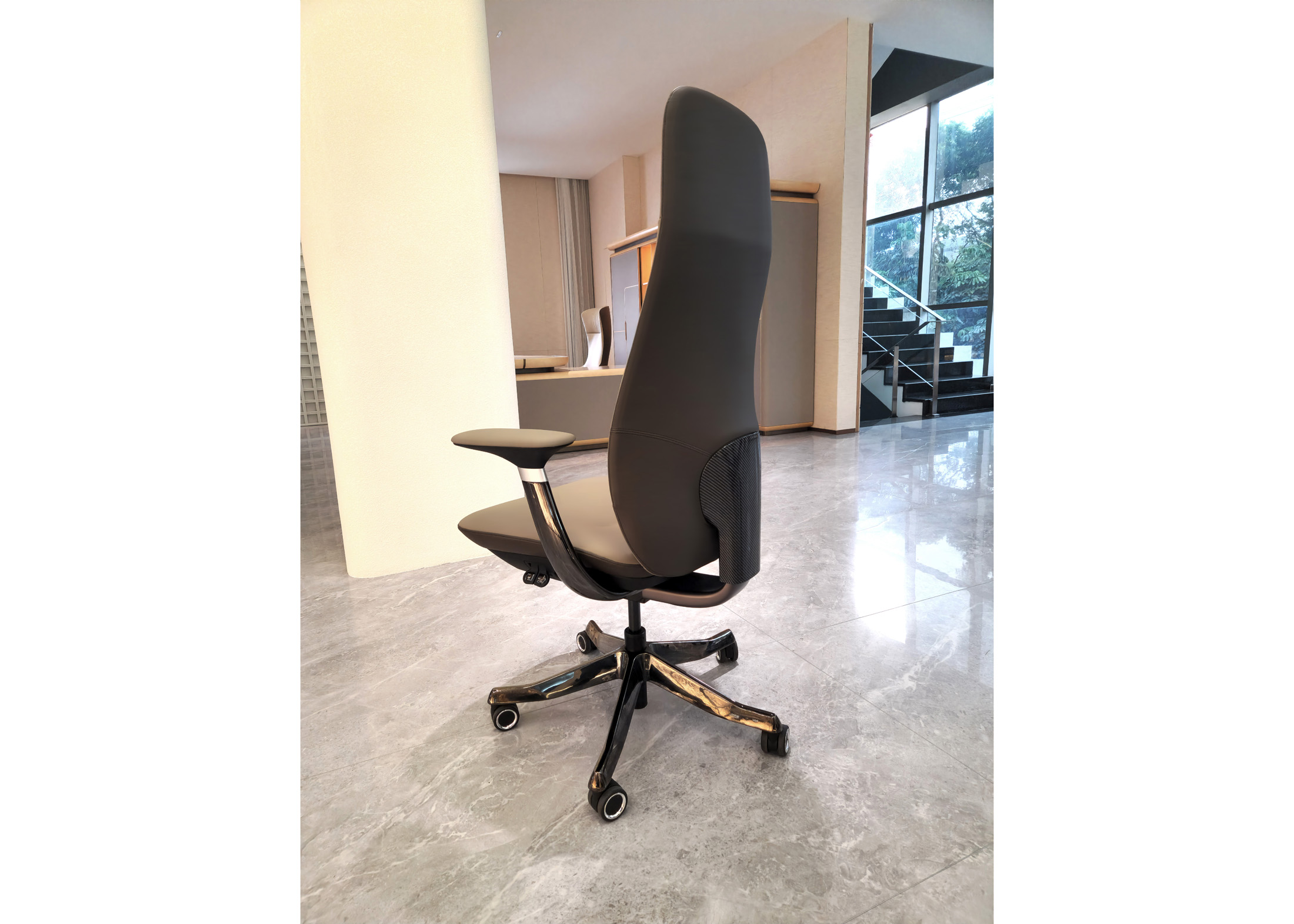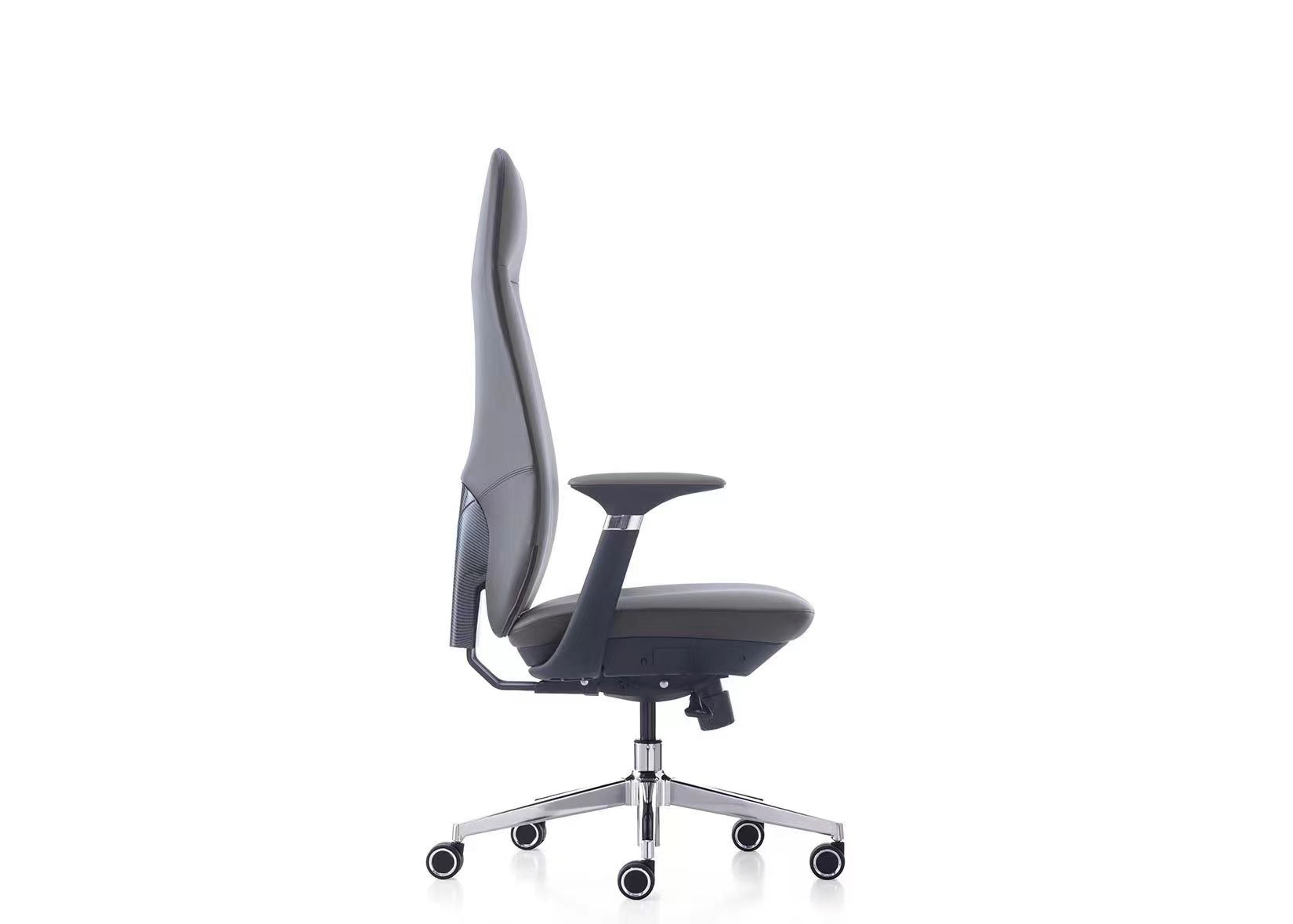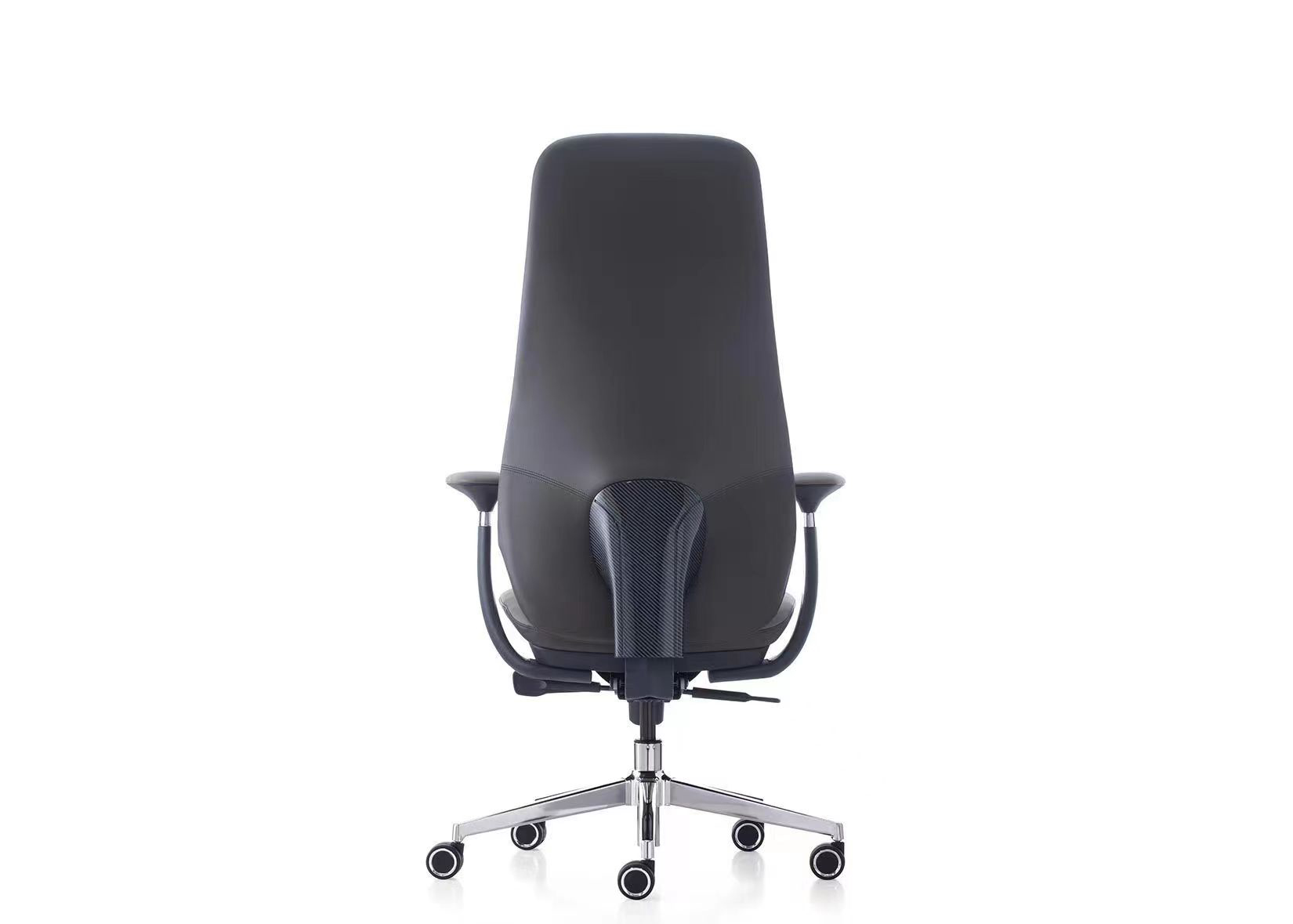 5. Sanhong 4-stage black gas lift. Backrest support in electroplated gunmetal aluminum alloy.