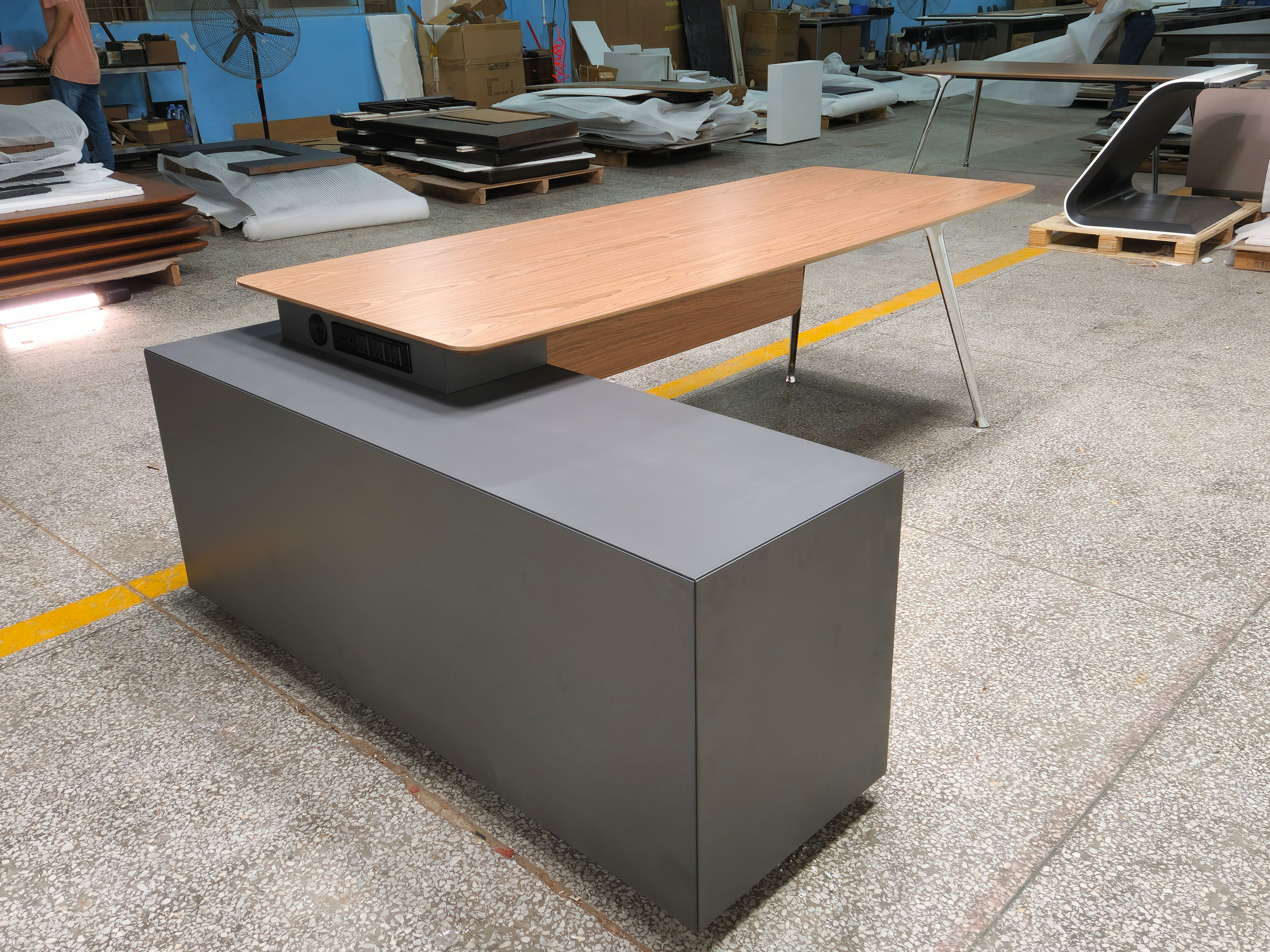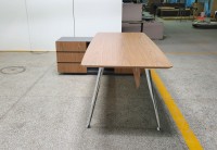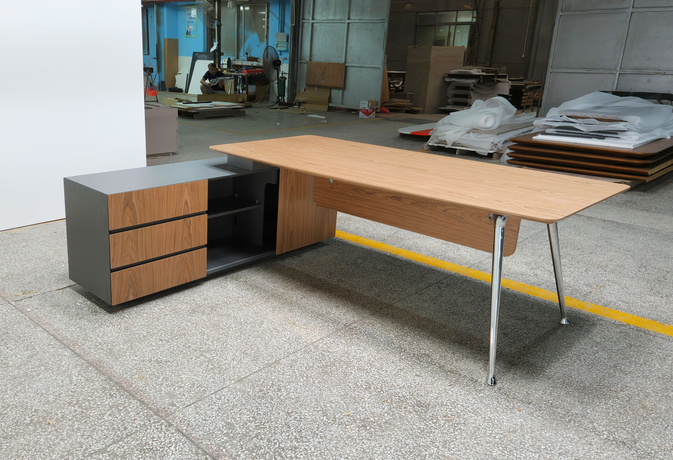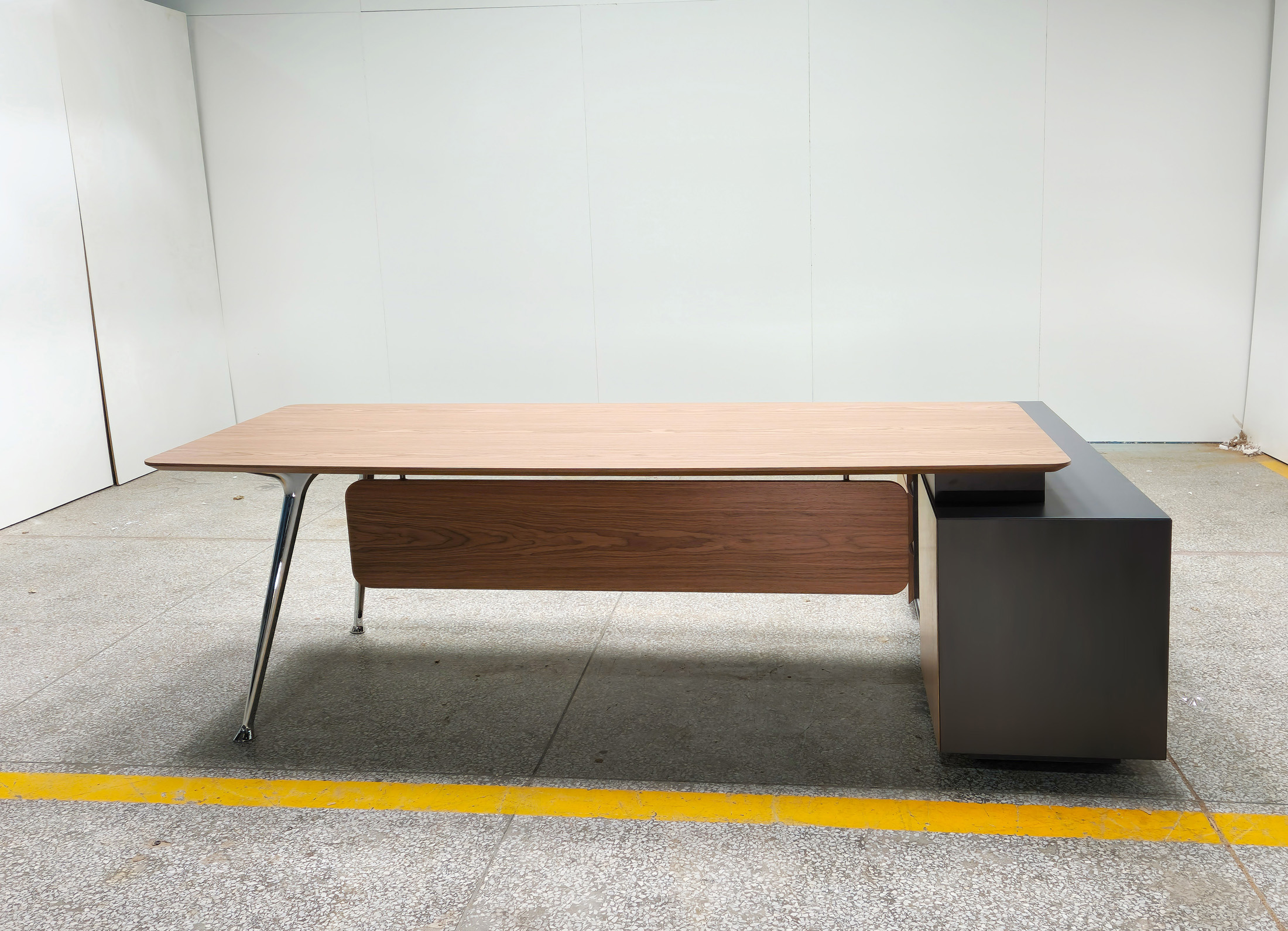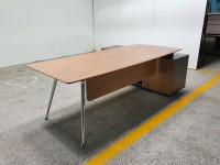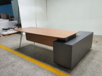 1、台面、挡板、副柜抽面、移门为木纹色,其余为三胺板;2、台底架五金为黑色, 电镀铸铝脚,副柜走线至地面。