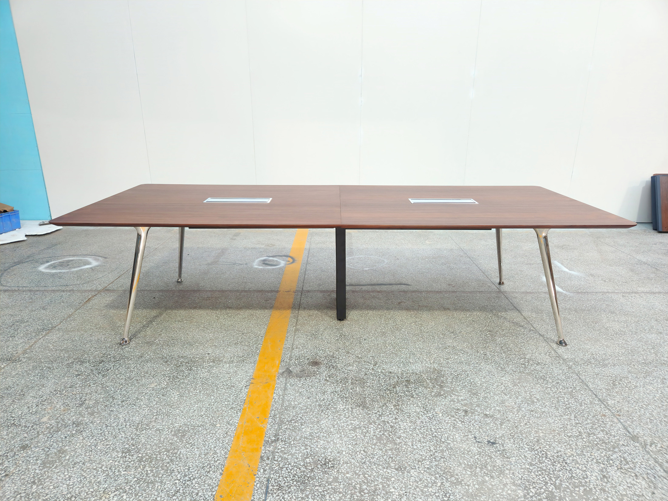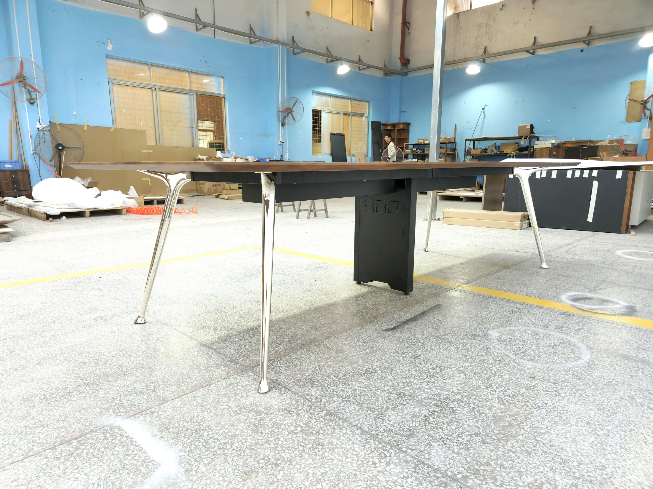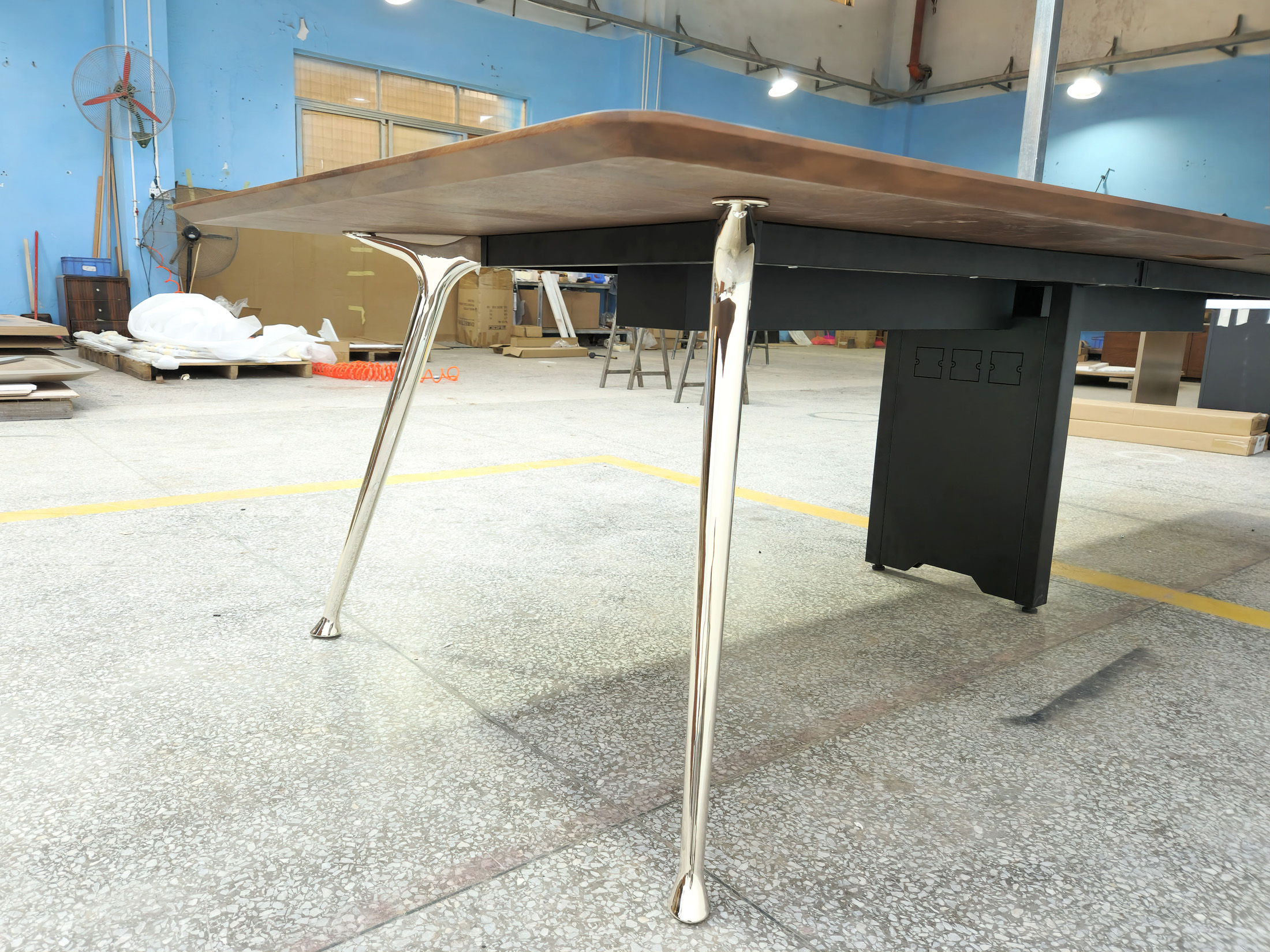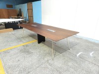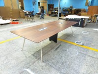 1、台面厚26mm木皮颜色,钢制台架;2、电镀铸铝脚,中脚上线, 拉丝铝线盖,配线兜。