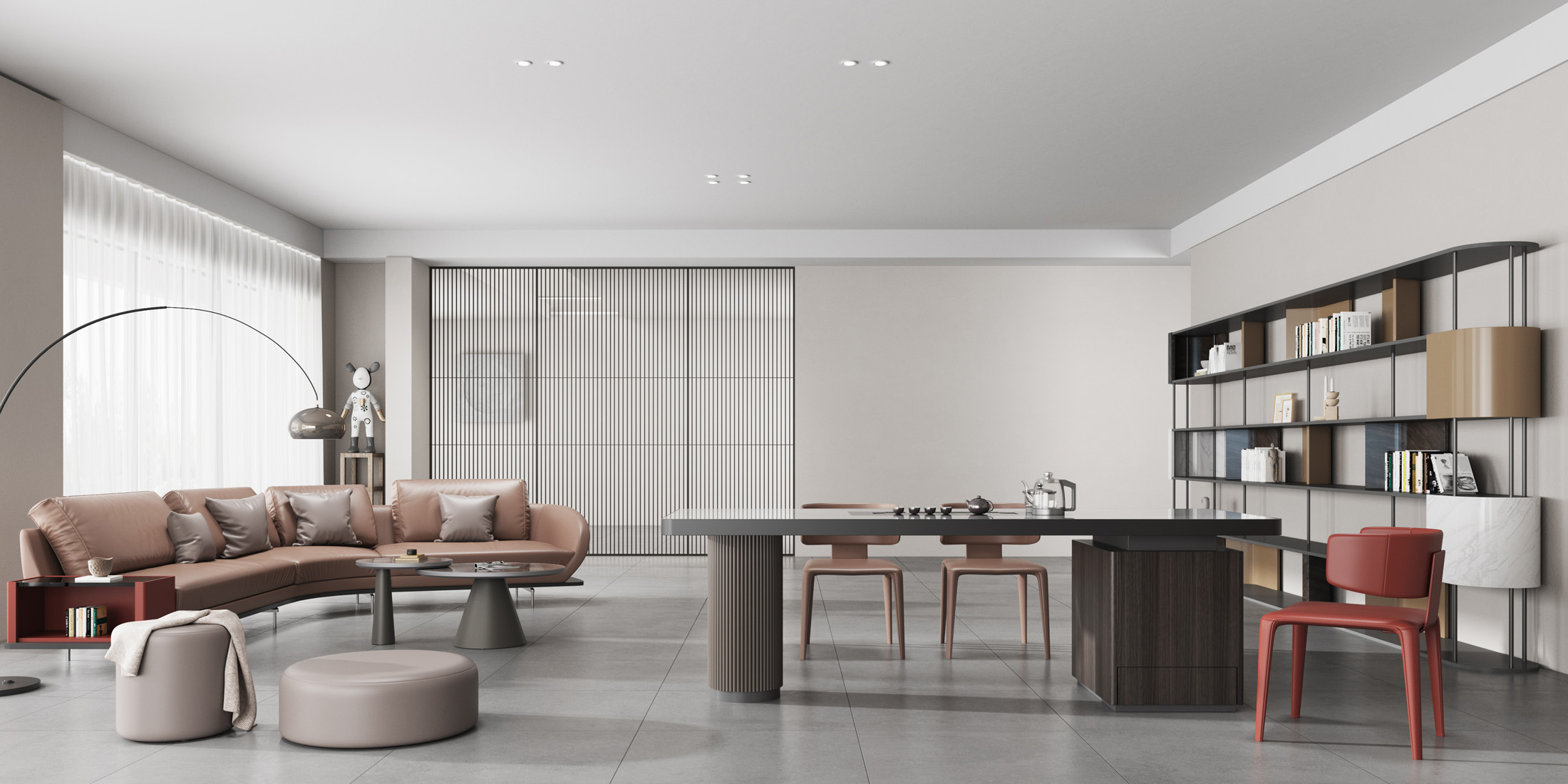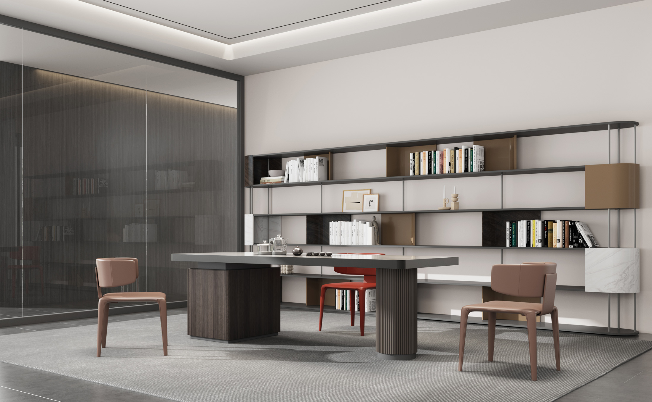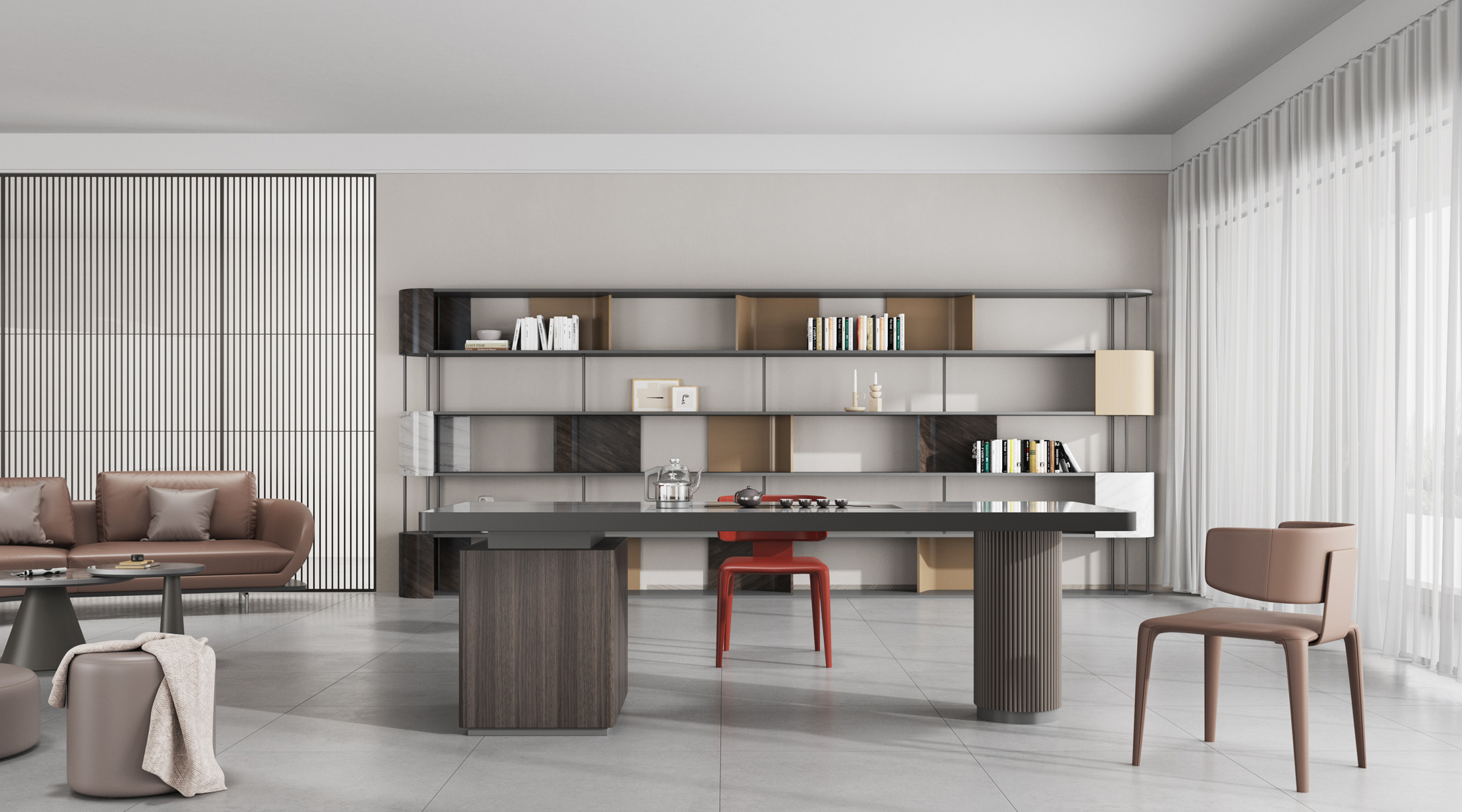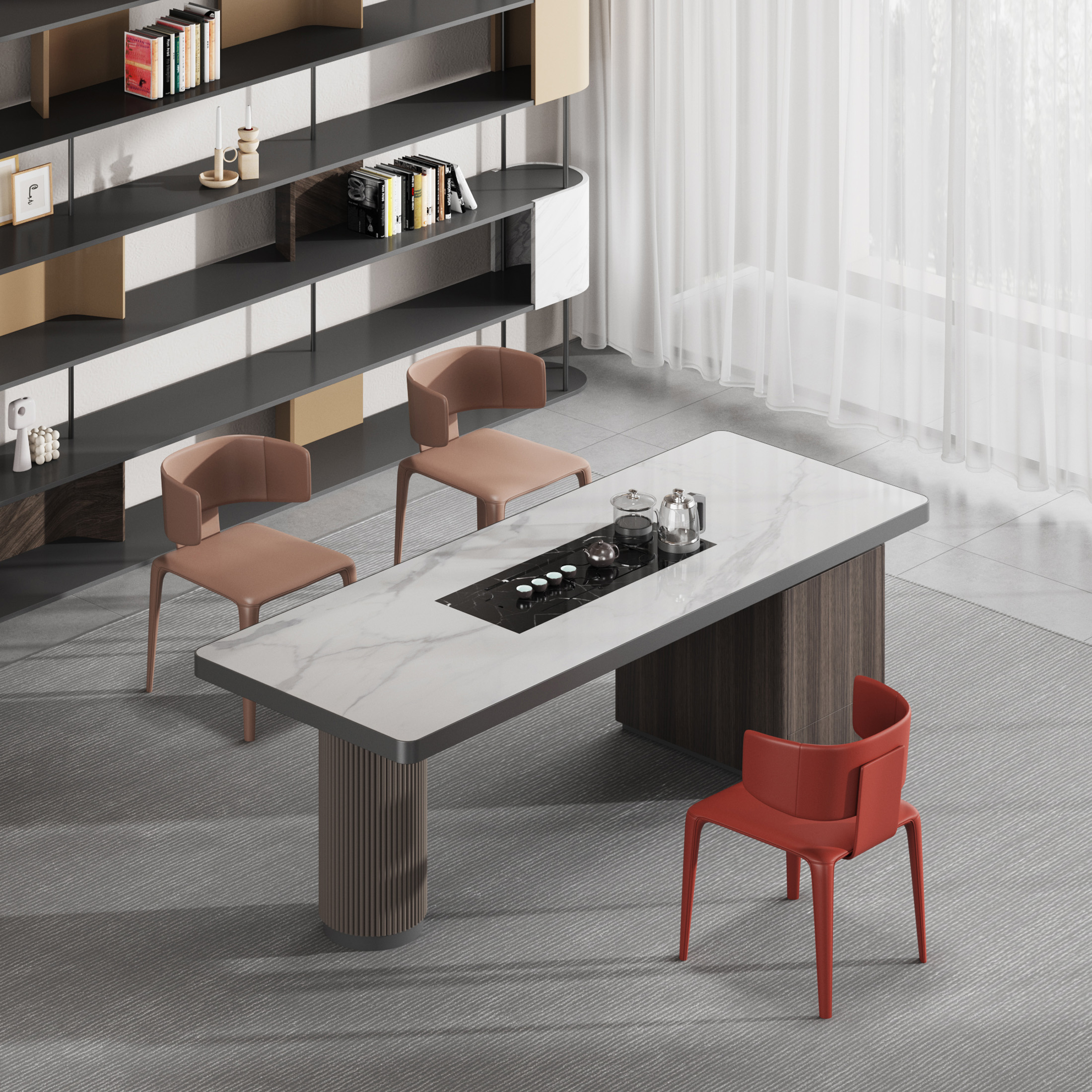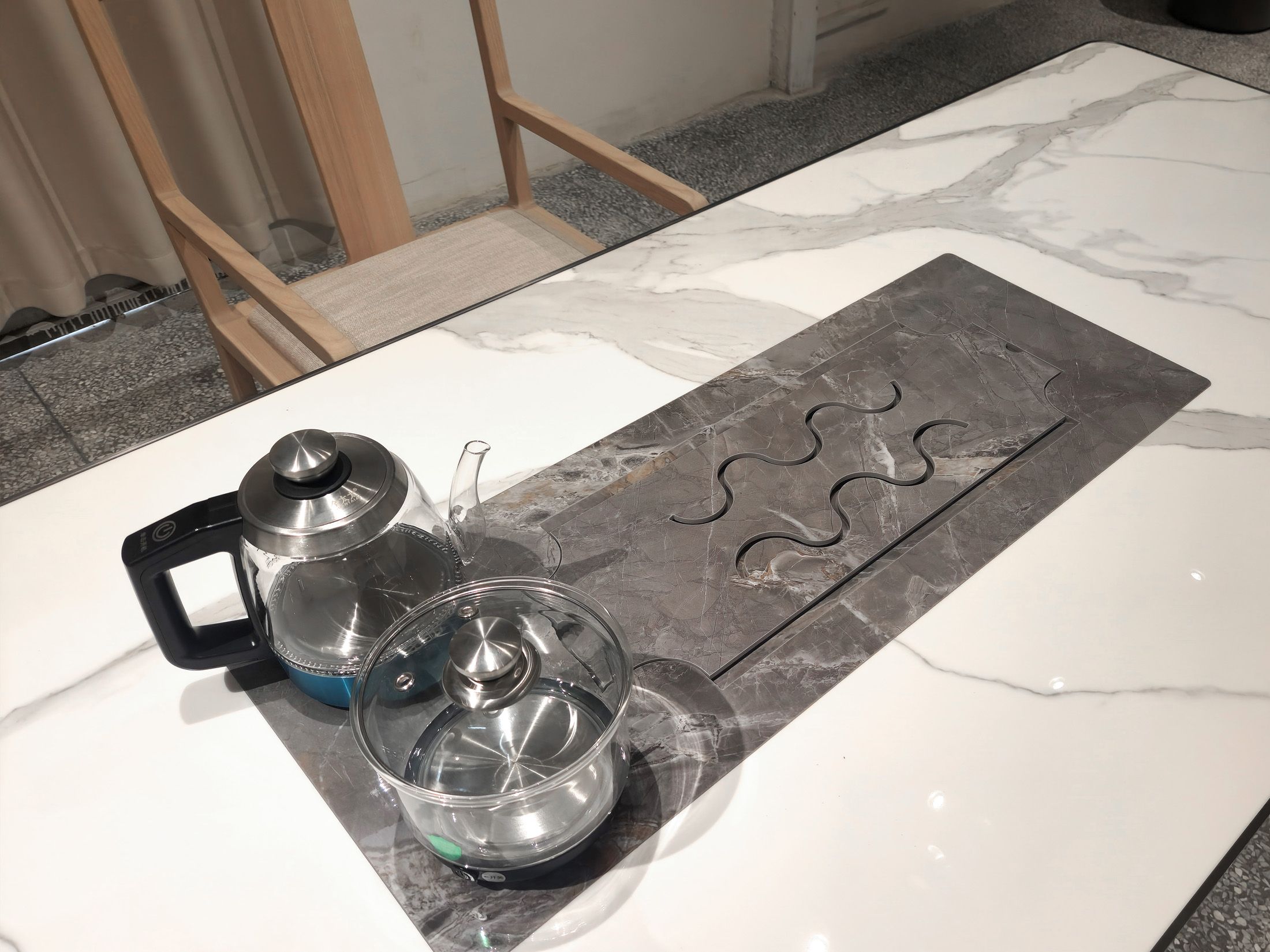 1、台面60mm厚,桌面配岩板一茶盘含烧水壶,电镀拉丝不锈钢边;2、支撑柜内配一个挂式插座(3电2USB);3、波浪圆柱台脚。