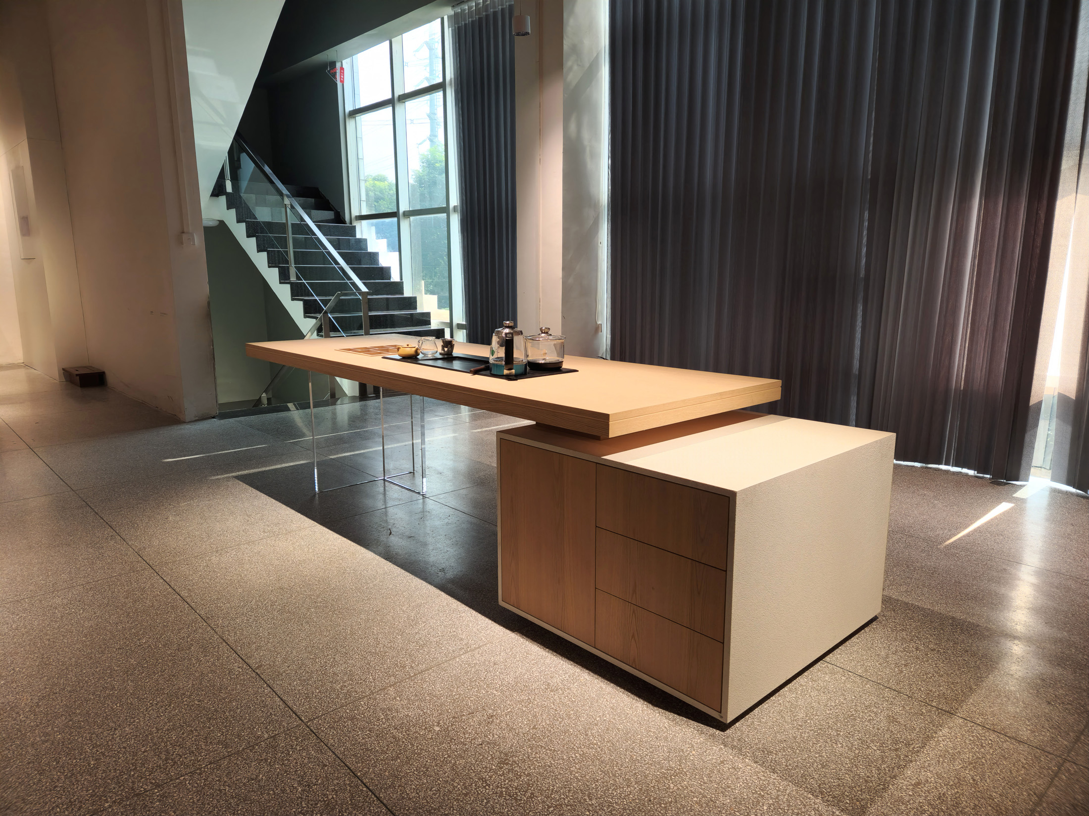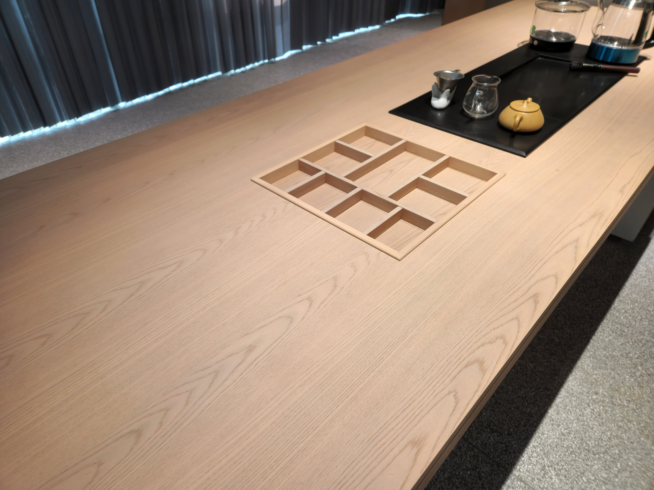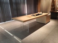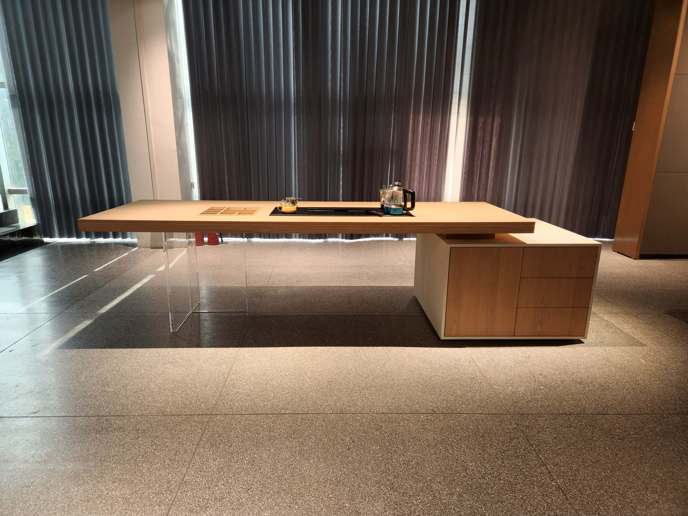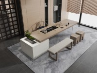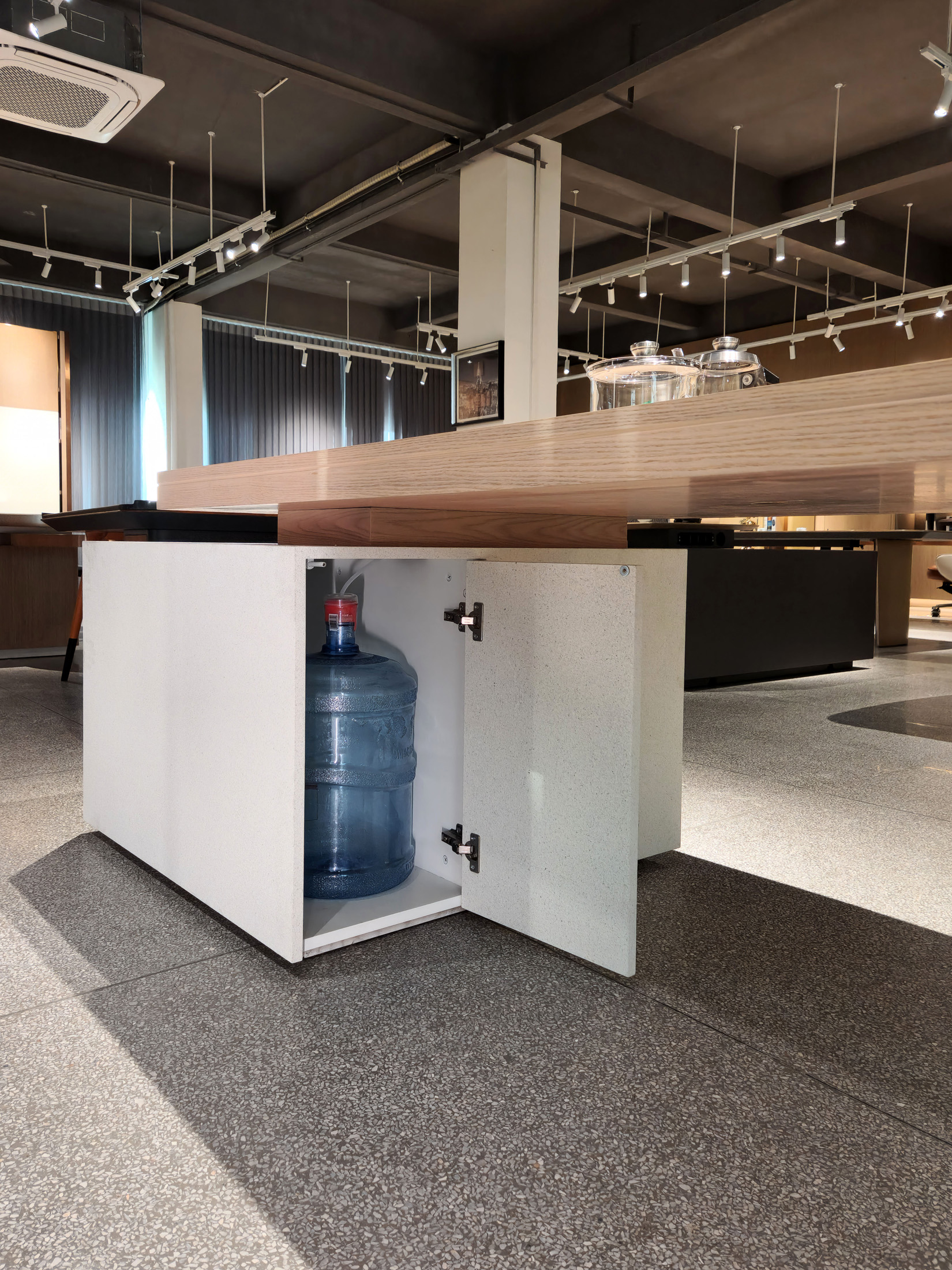 1、台面65mm厚,桌面配桌面配嵌入式食物收纳格,砚石茶盘含 烧水壶(虹吸式上水)2、柜门板和抽屉为按弹式,柜 内配一个挂式插座(3强电2USB)3、25mm厚超白亚克力脚