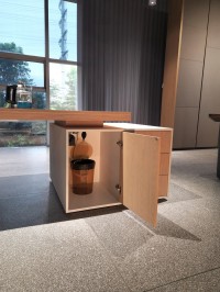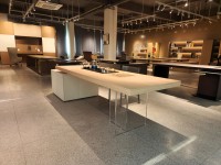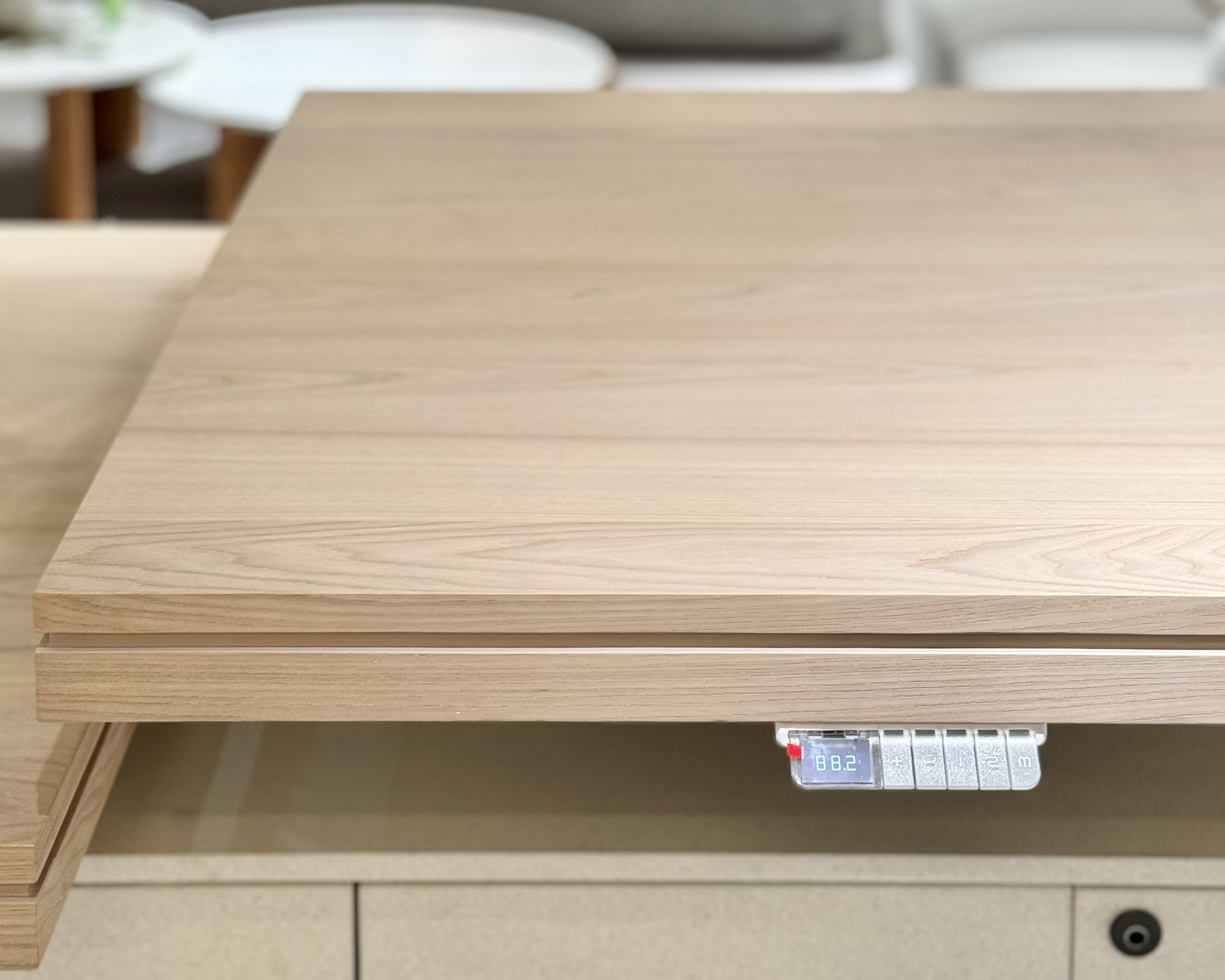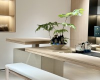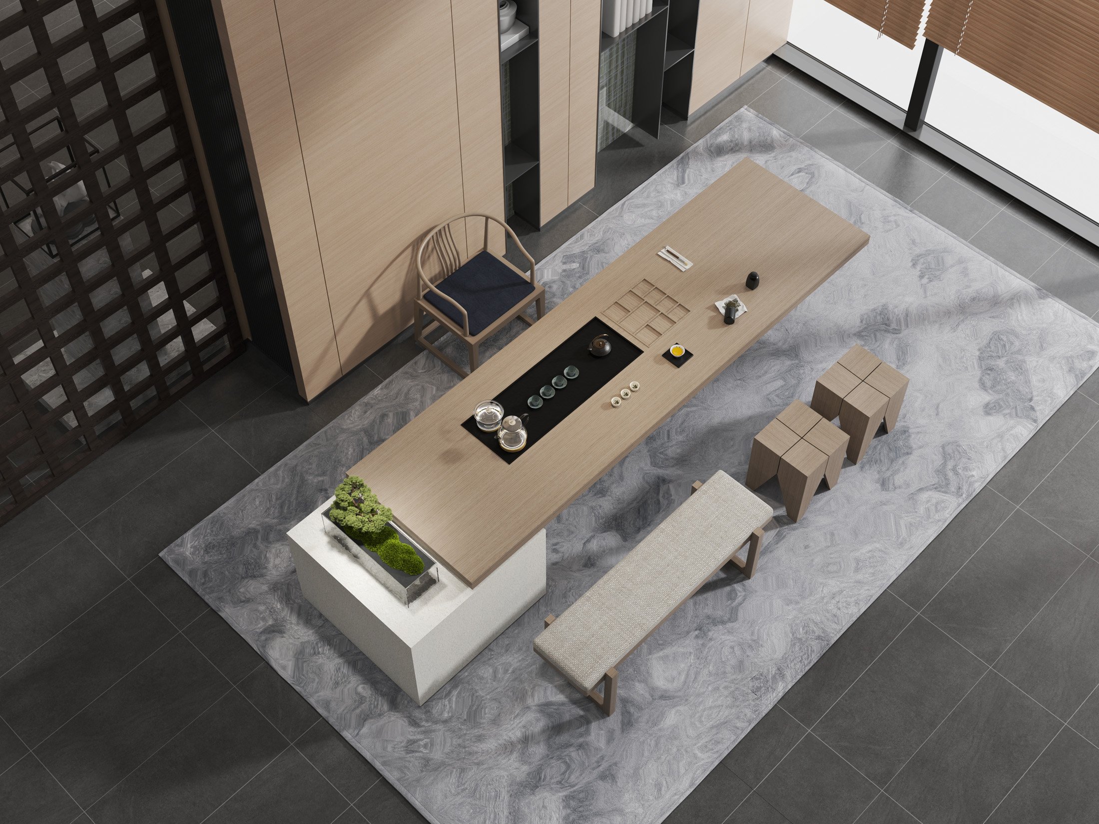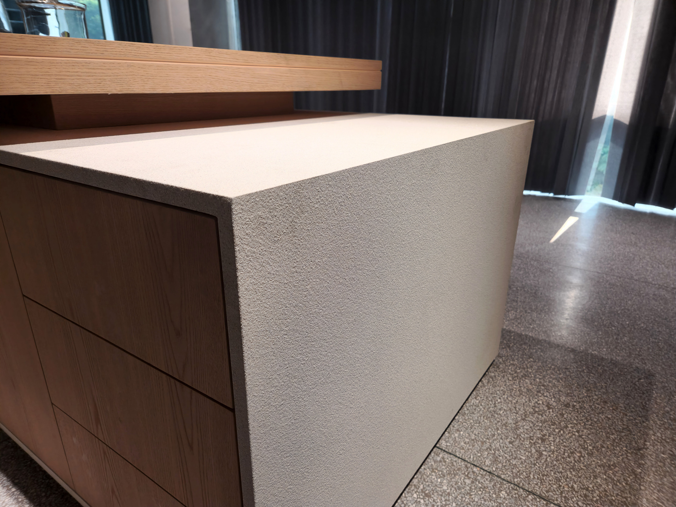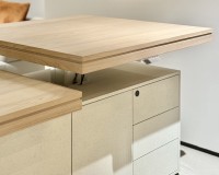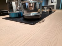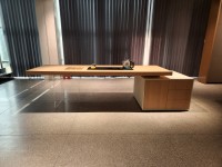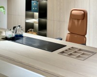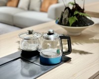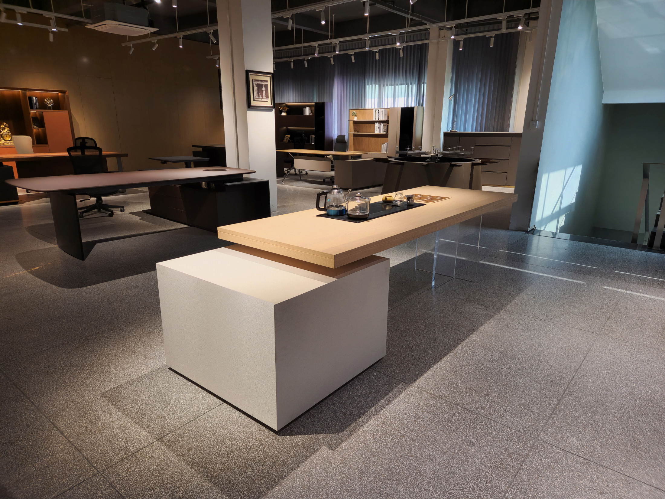 1、台面65mm厚,桌面配桌面配嵌入式食物收纳格,砚石茶盘含 烧水壶(虹吸式上水)2、柜门板和抽屉为按弹式,柜 内配一个挂式插座(3强电2USB)3、25mm厚超白亚克力脚