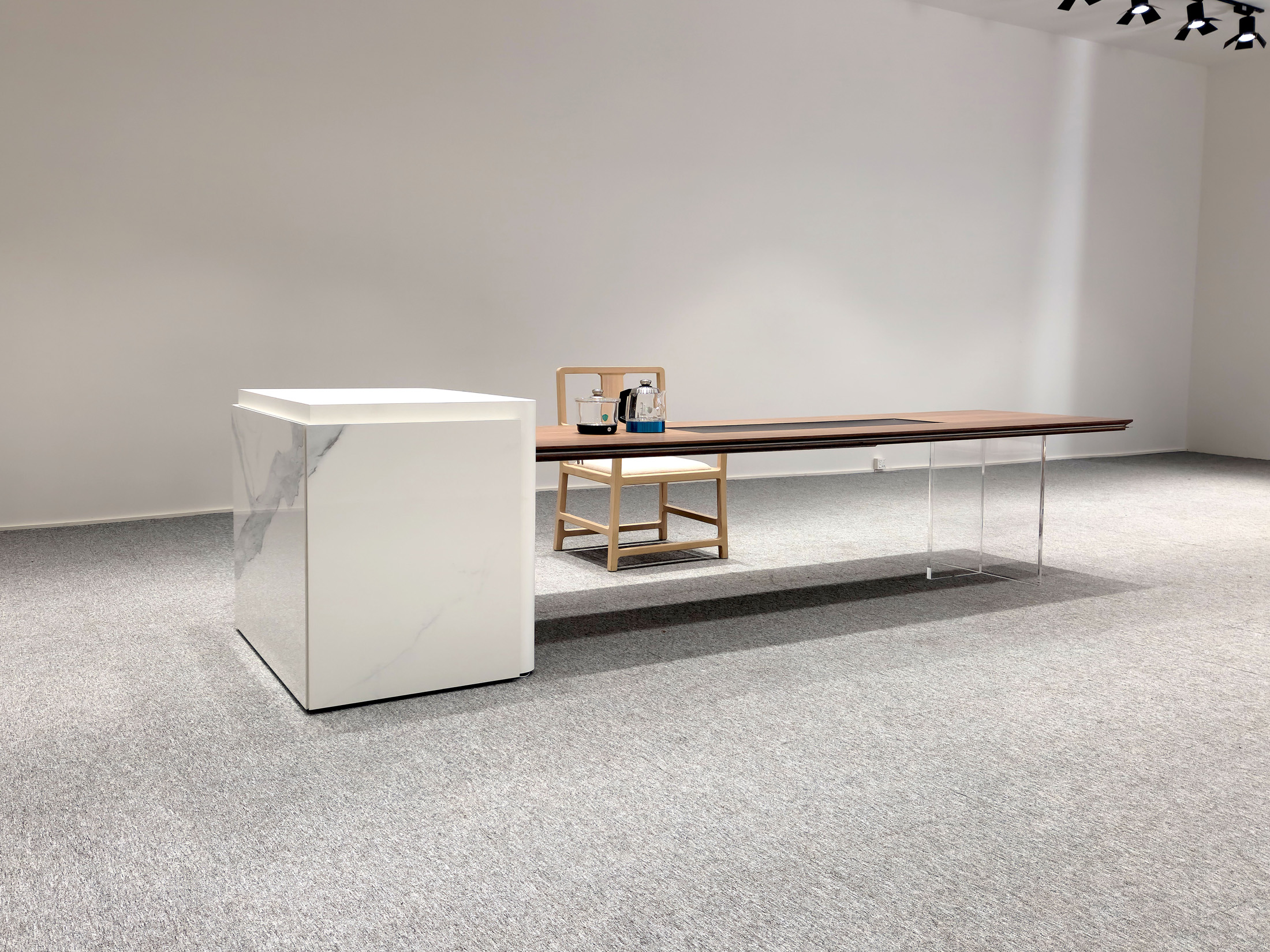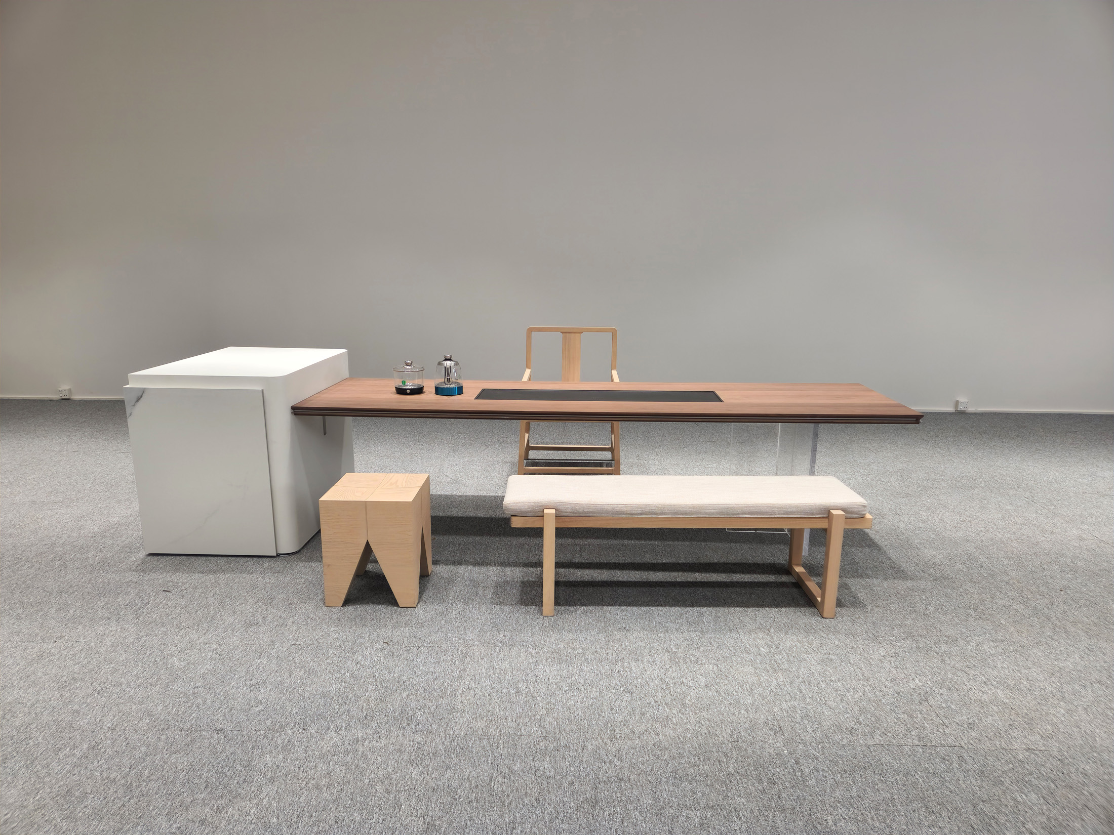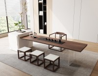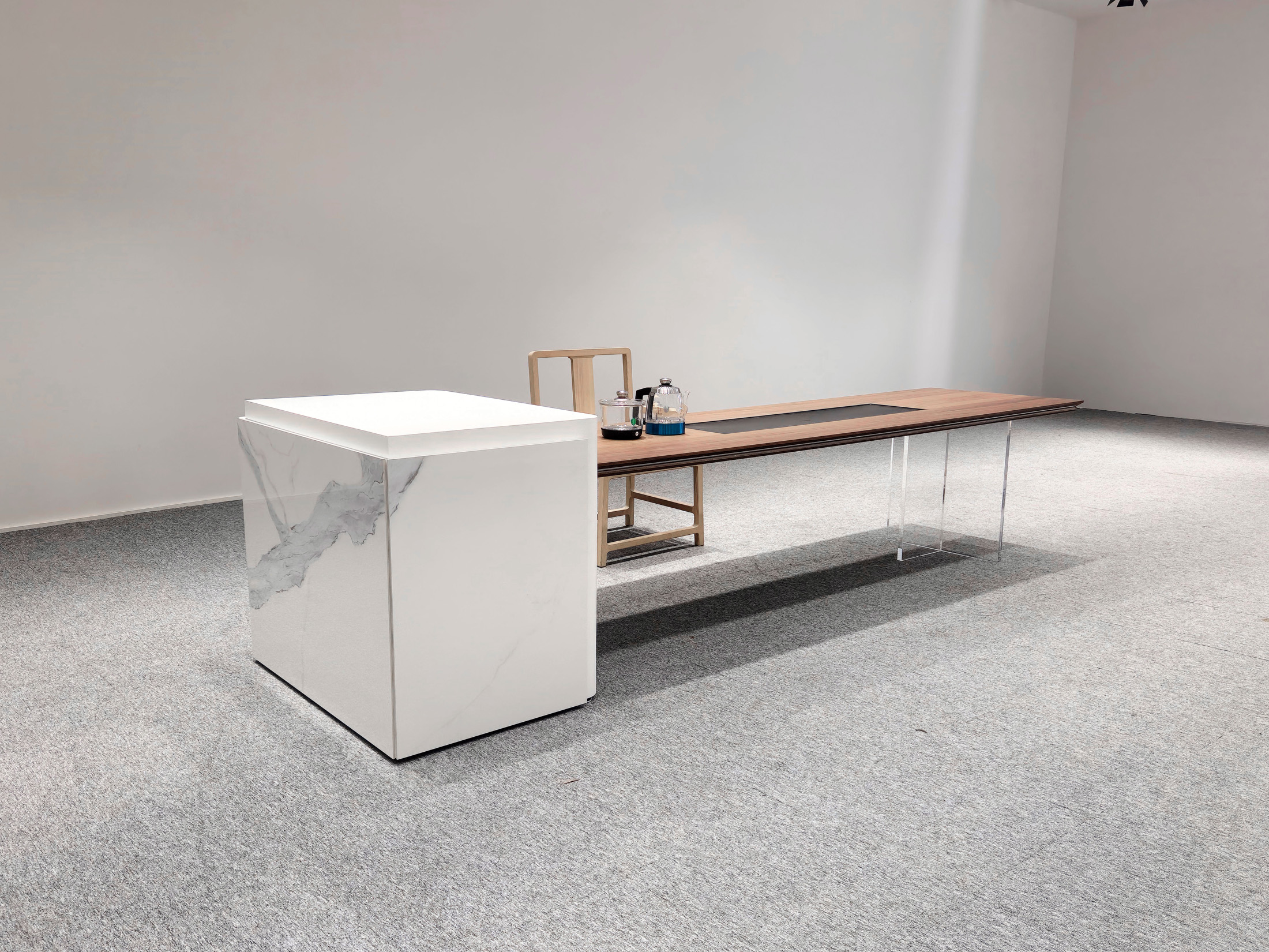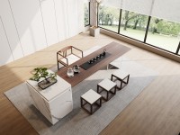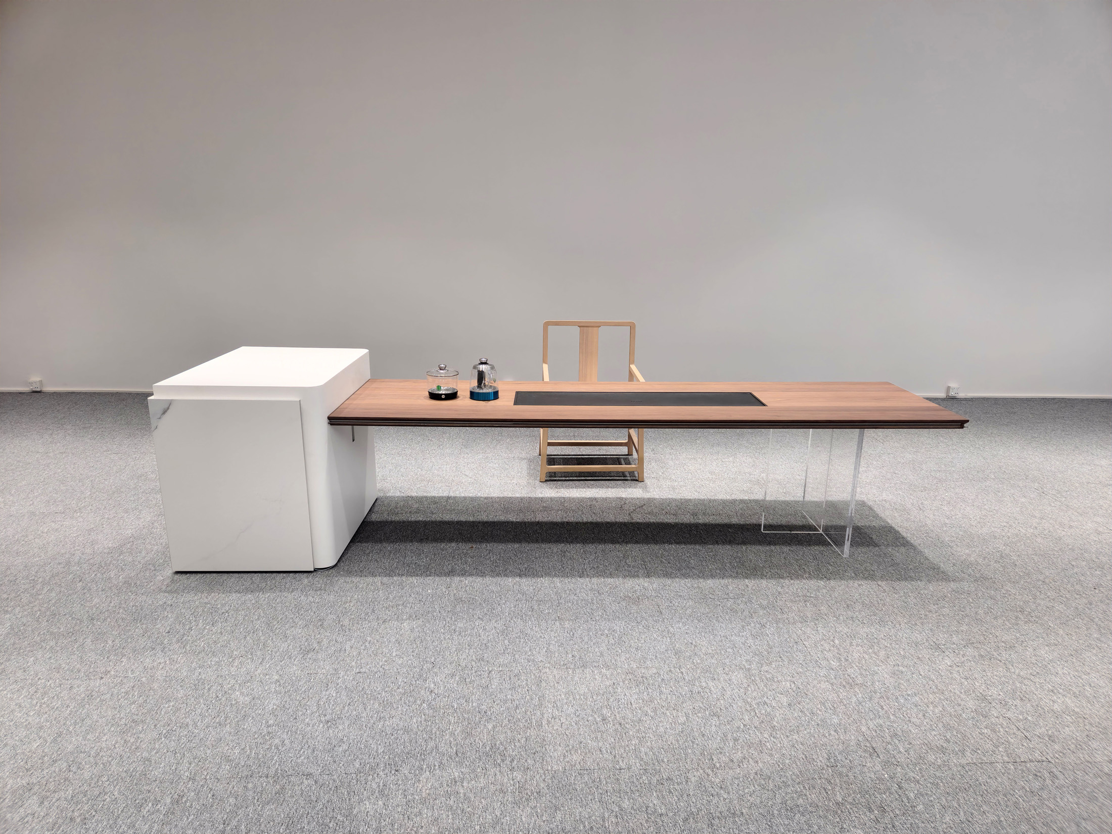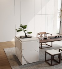 1、台面50mm厚,砚石茶盘含烧水壶(虹吸式上水),台边带不锈钢装饰条和LED灯 ,台面配无线充电;2、柜体带LED灯,柜内配一个挂式插座(3强电2USB);3、25mm厚超白亚克力脚。