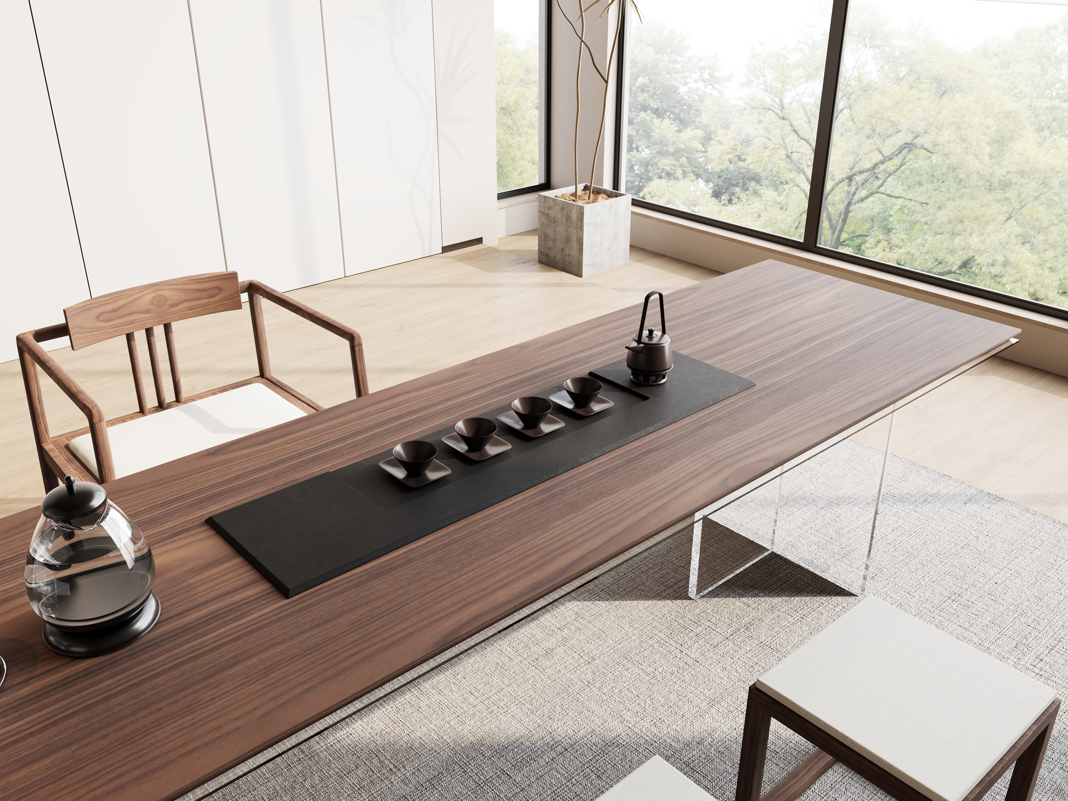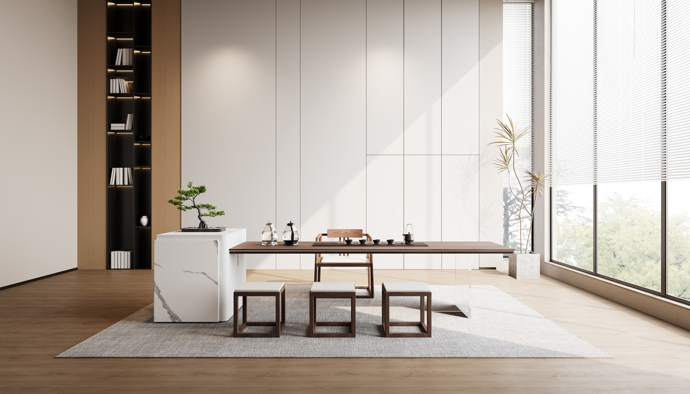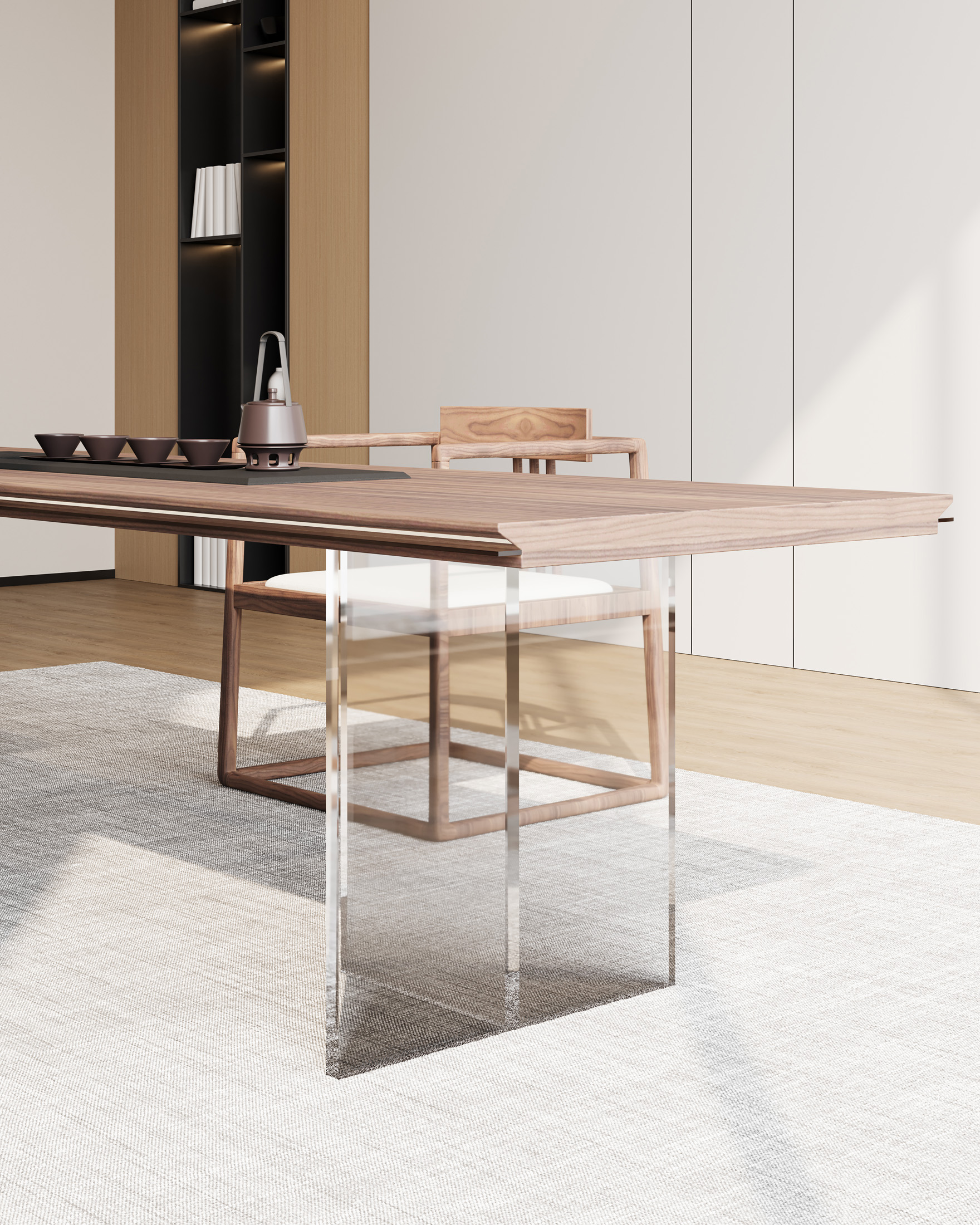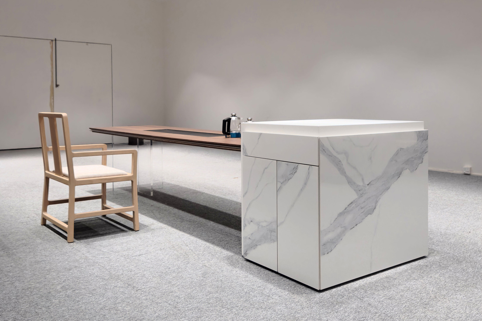 1、台面50mm厚,砚石茶盘含烧水壶(虹吸式上水),台边带不锈钢装饰条和LED灯 ,台面配无线充电;2、柜体带LED灯,柜内配一个挂式插座(3强电2USB);3、25mm厚超白亚克力脚。