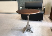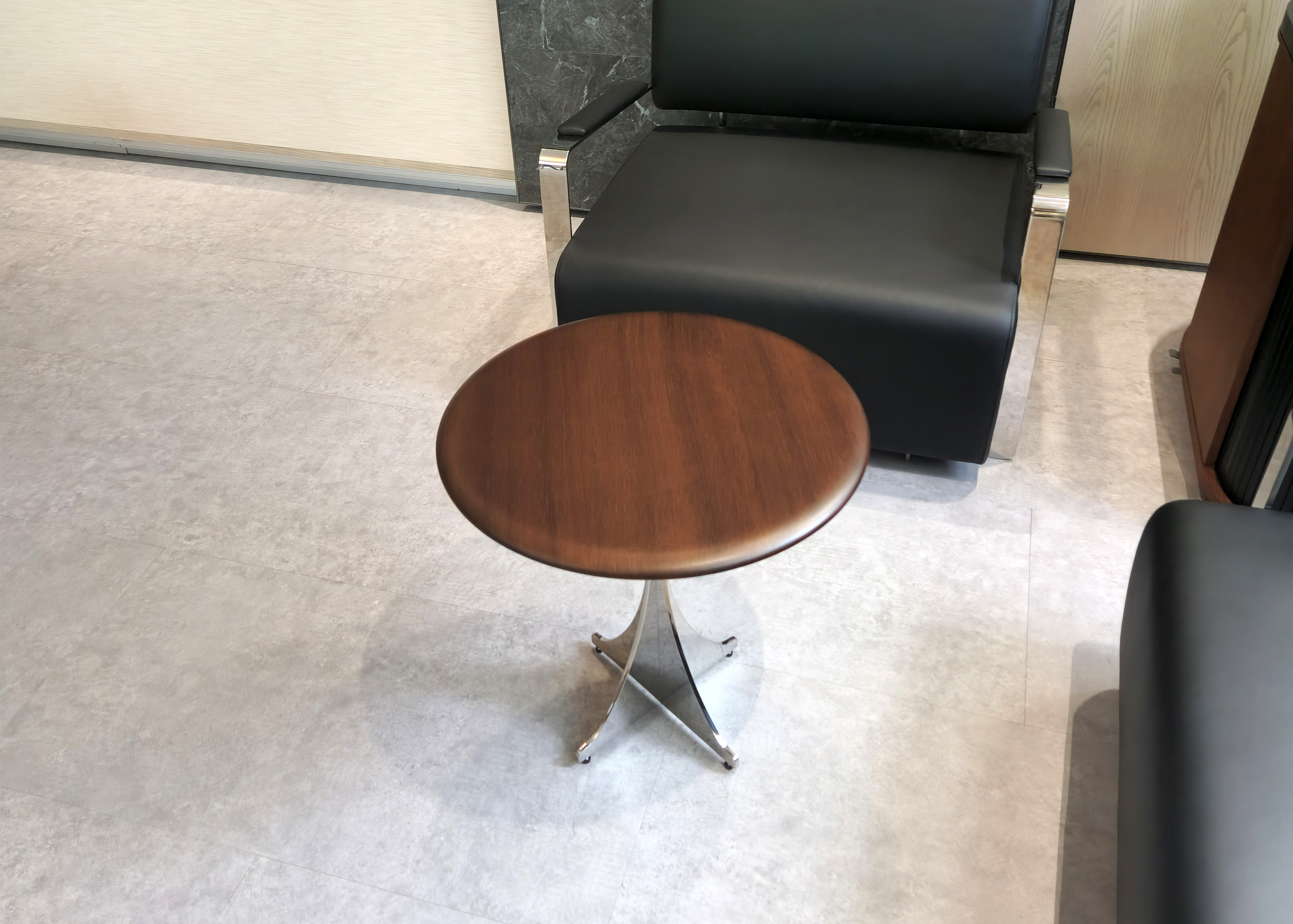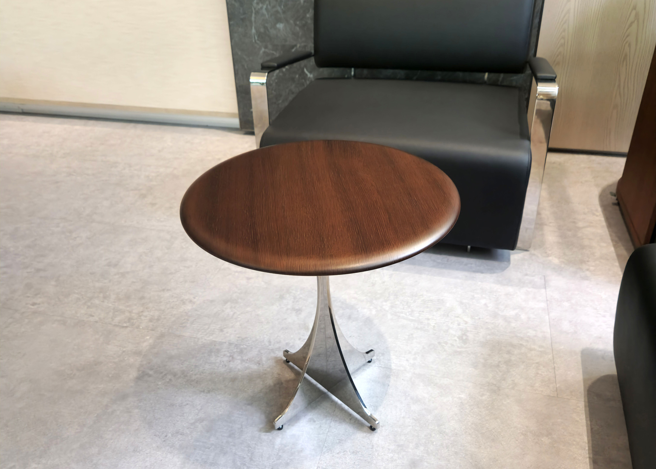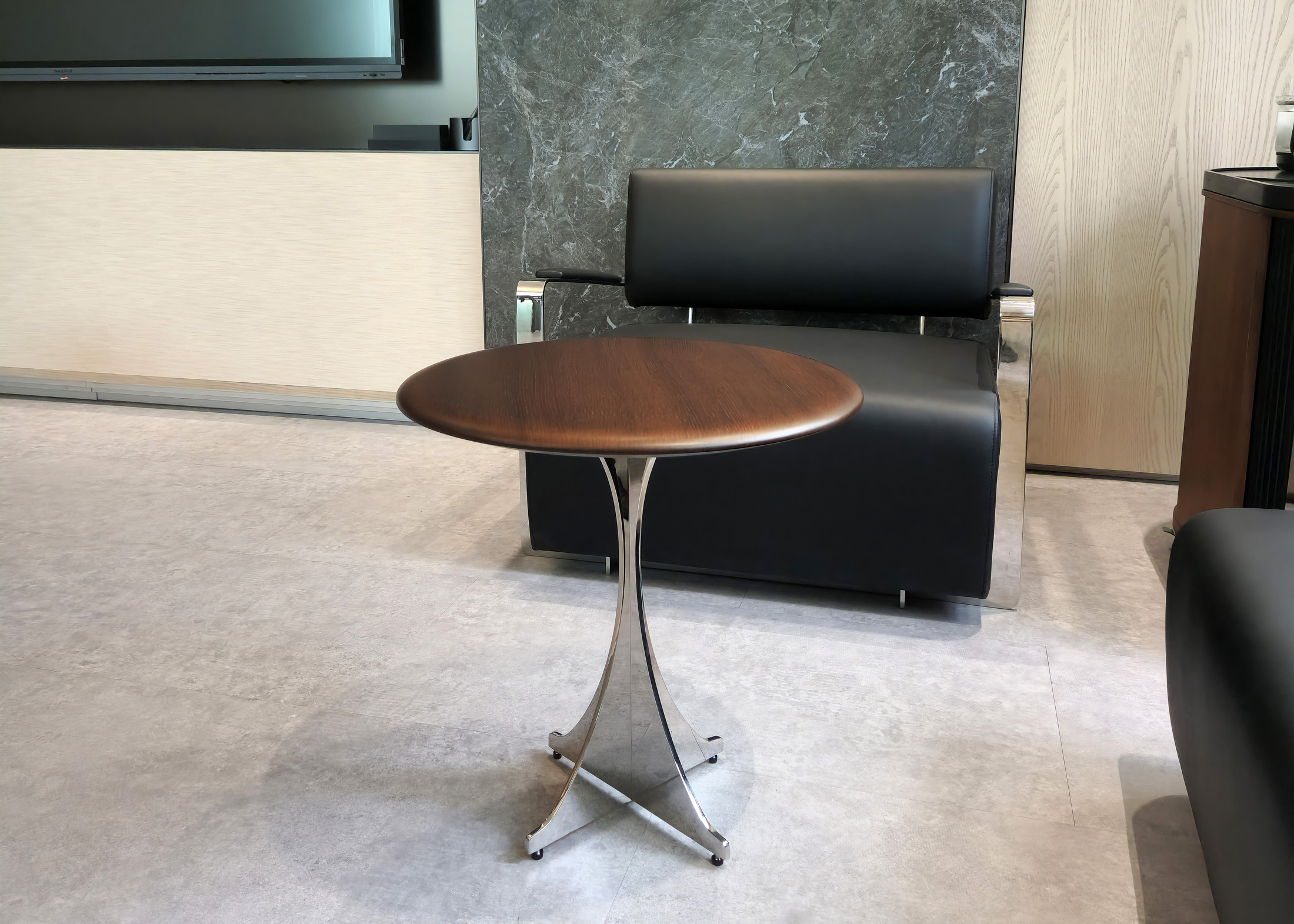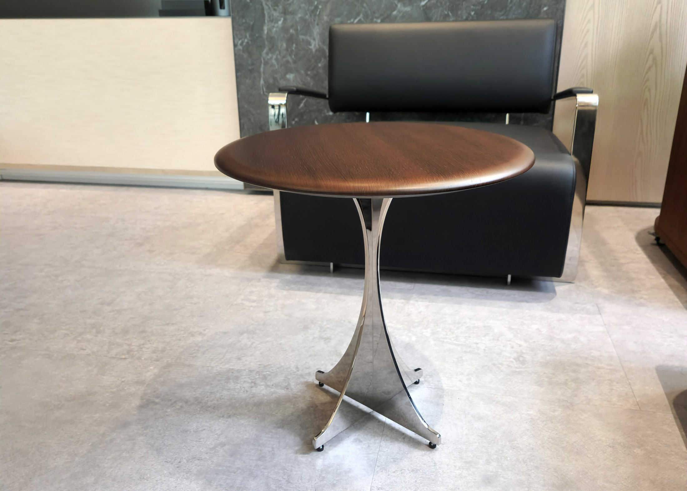 "Tabletop with smoked oak, one-time veneer, mirror-finished stainless steel feet."