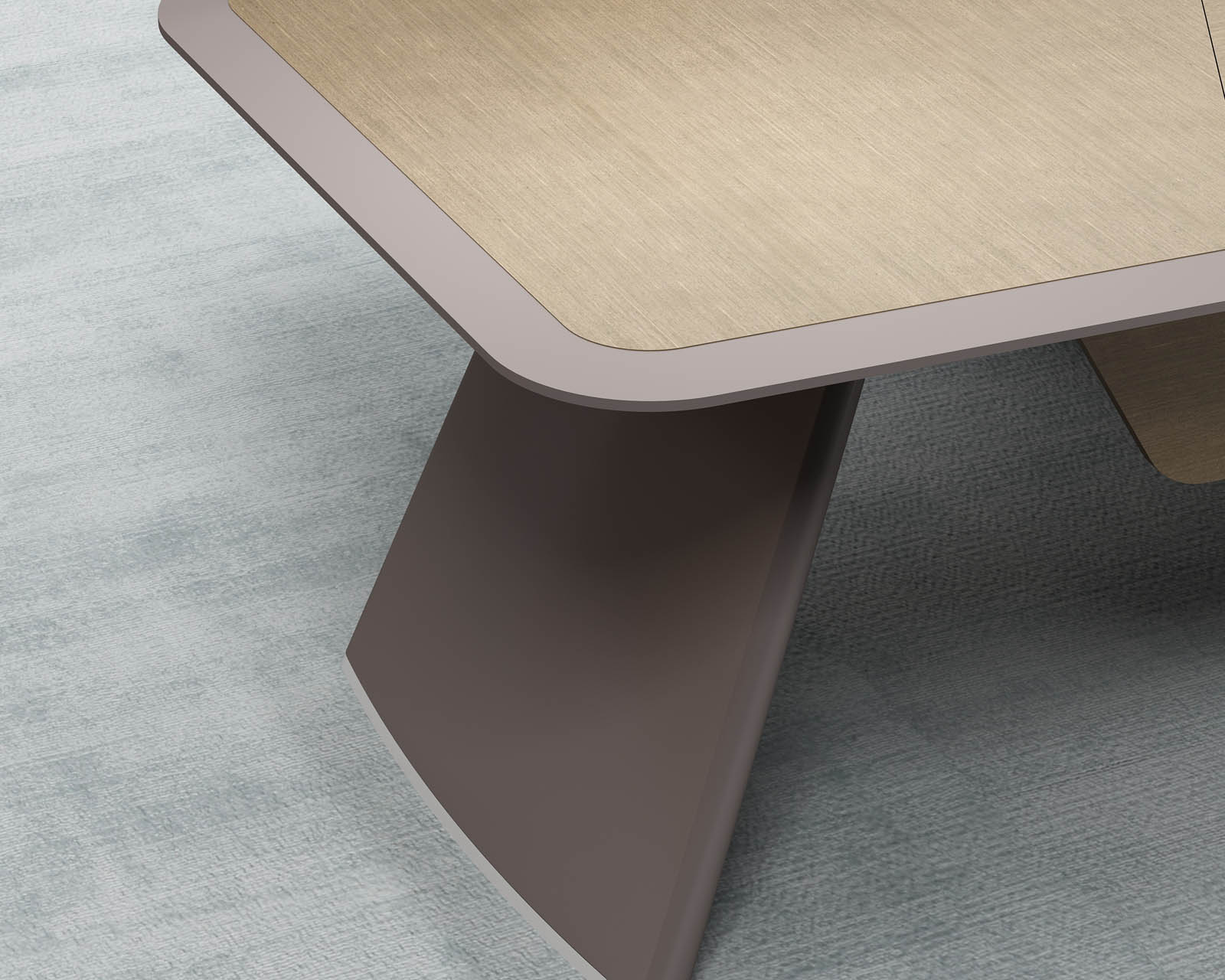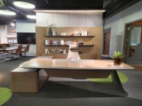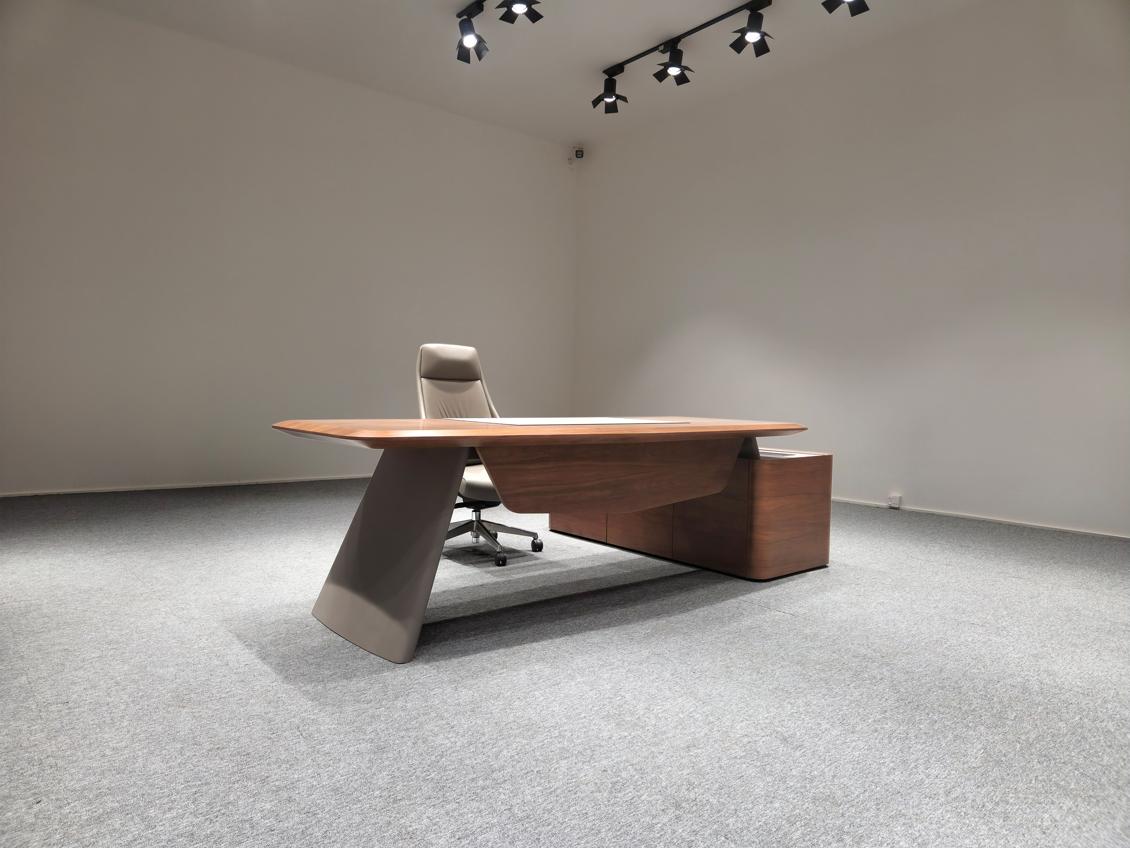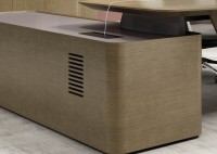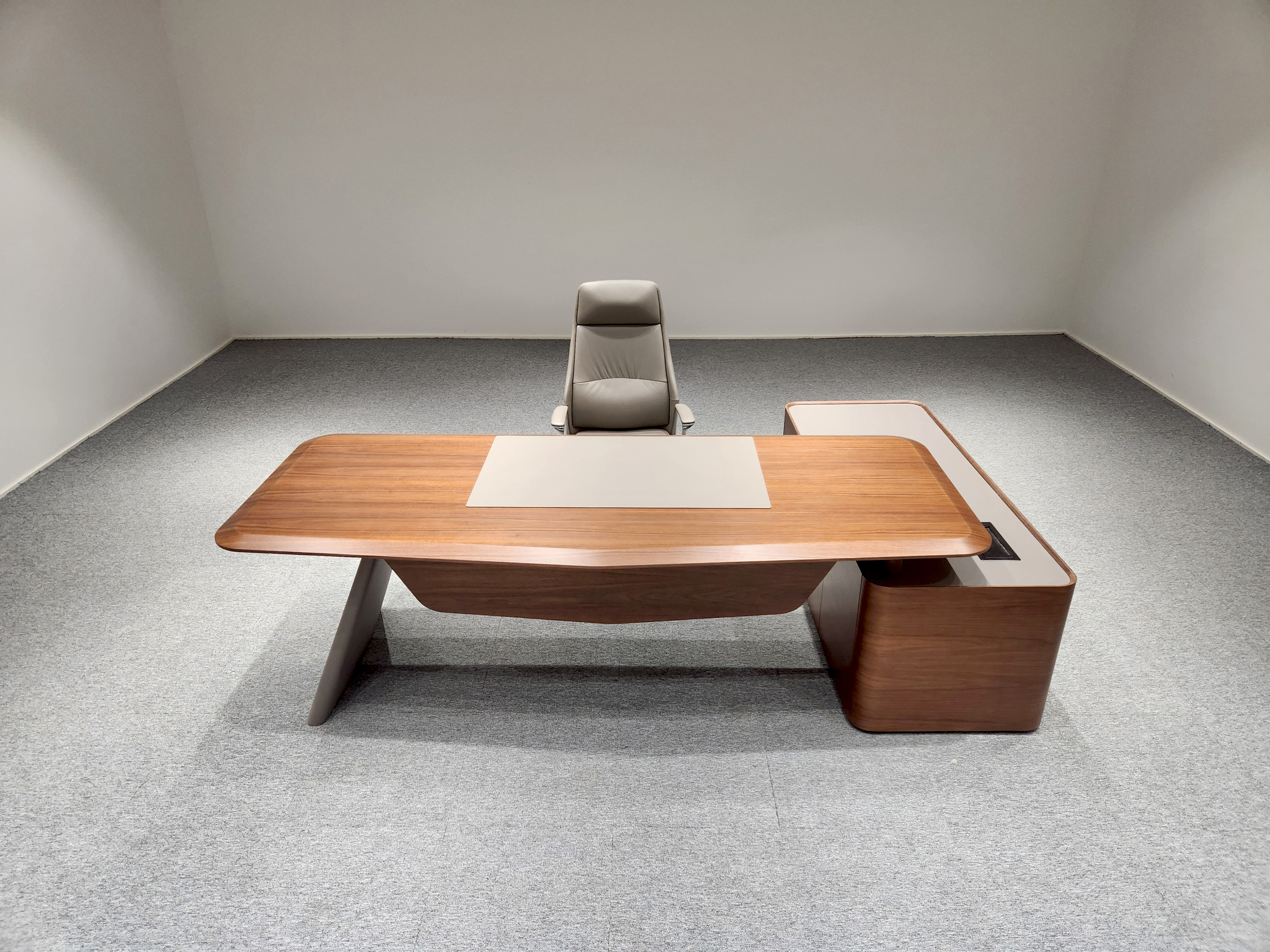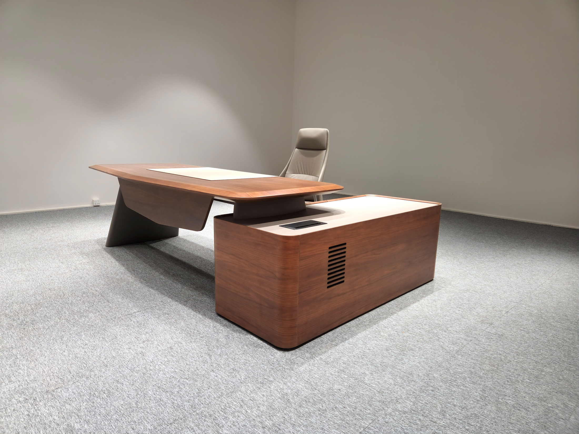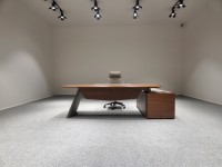 1、台面厚60mm斜边贴木皮,中间皮垫;2、台脚实色漆,实色脚垫,其余木皮,黑色金属台架;3、副柜面板为实色漆带黑色集成线盒,2个抽屉,1机主位,带挡板。