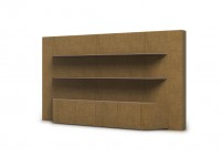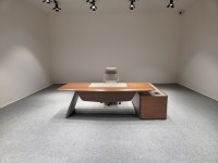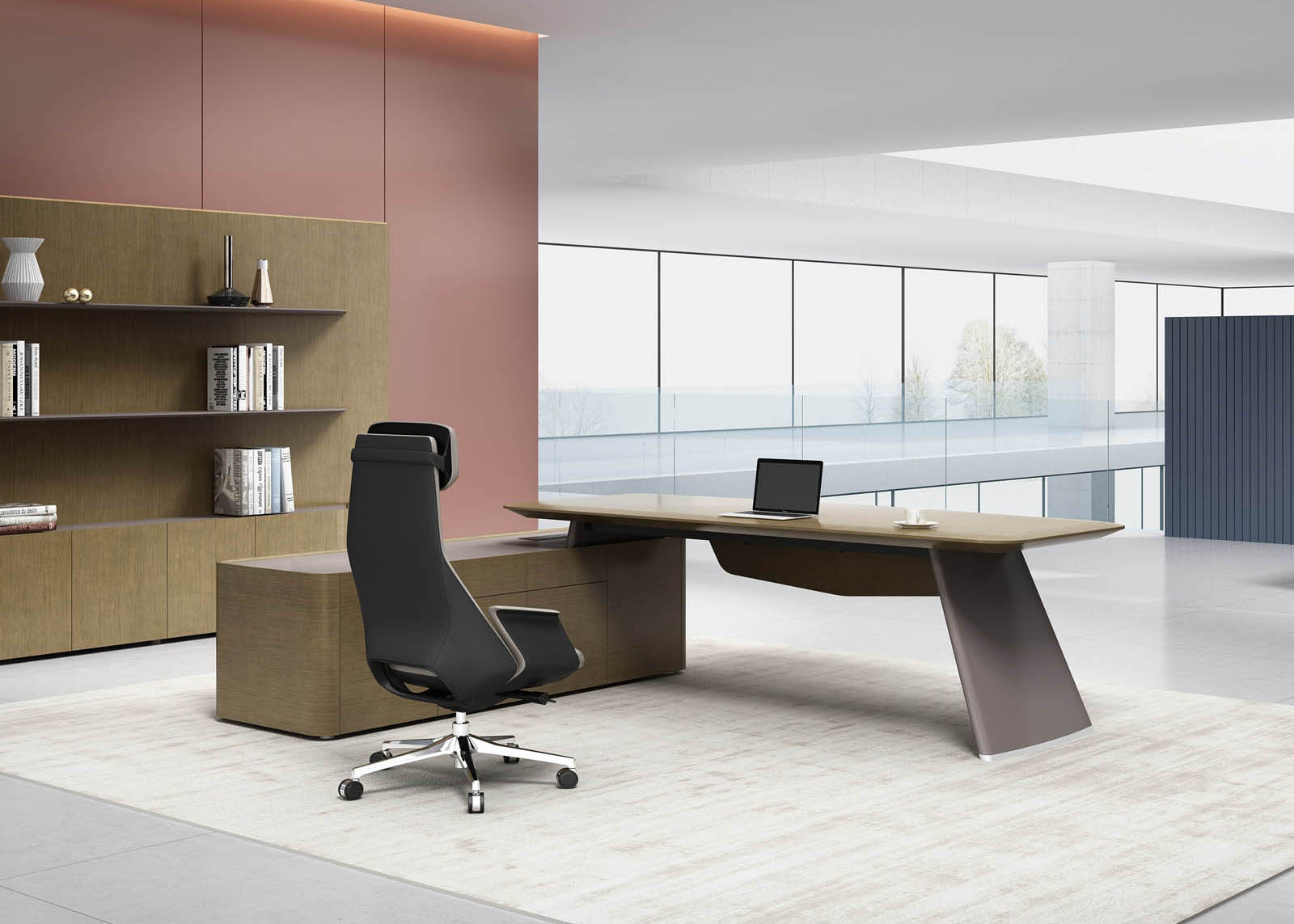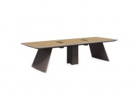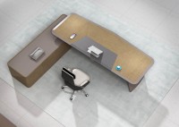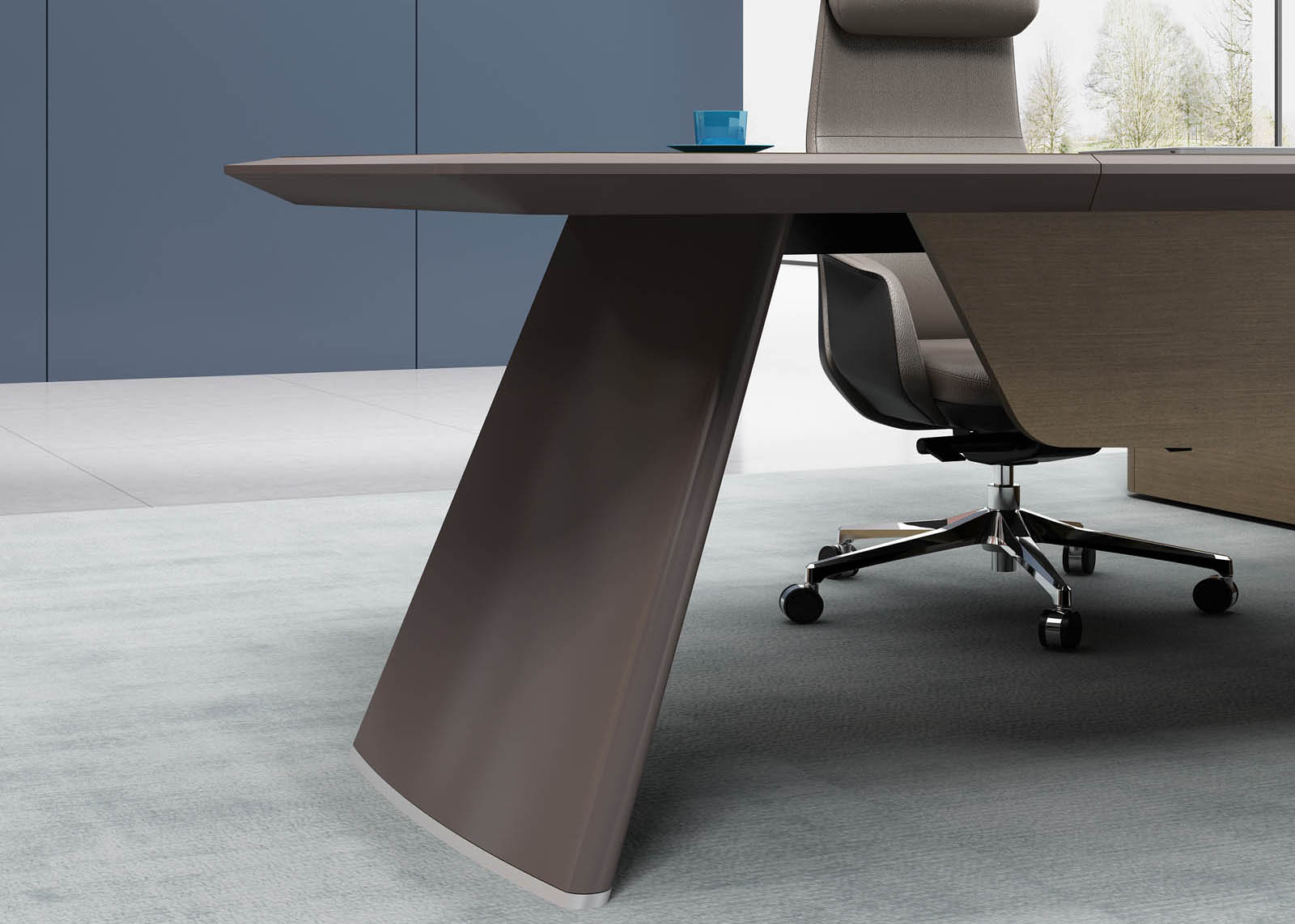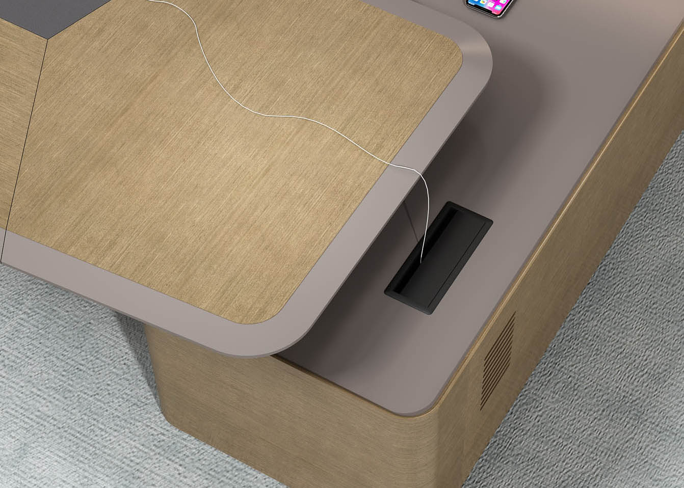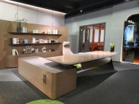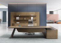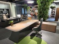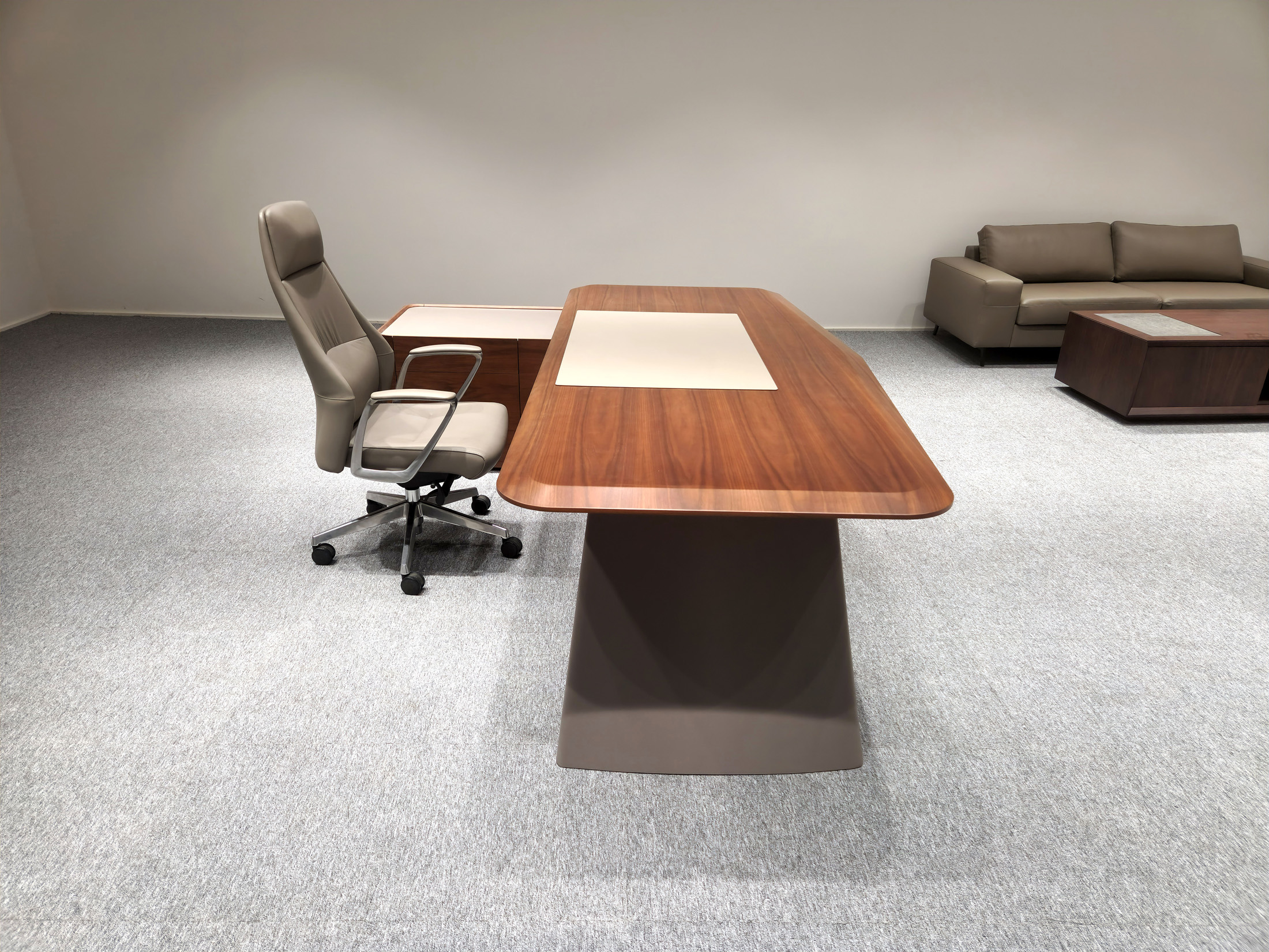 1、台面厚60mm斜边贴木皮,中间皮垫;2、台脚实色漆,实色脚垫,其余木皮,黑色金属台架;3、副柜面板为实色漆带黑色集成线盒,2个抽屉,1机主位,带挡板。