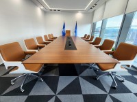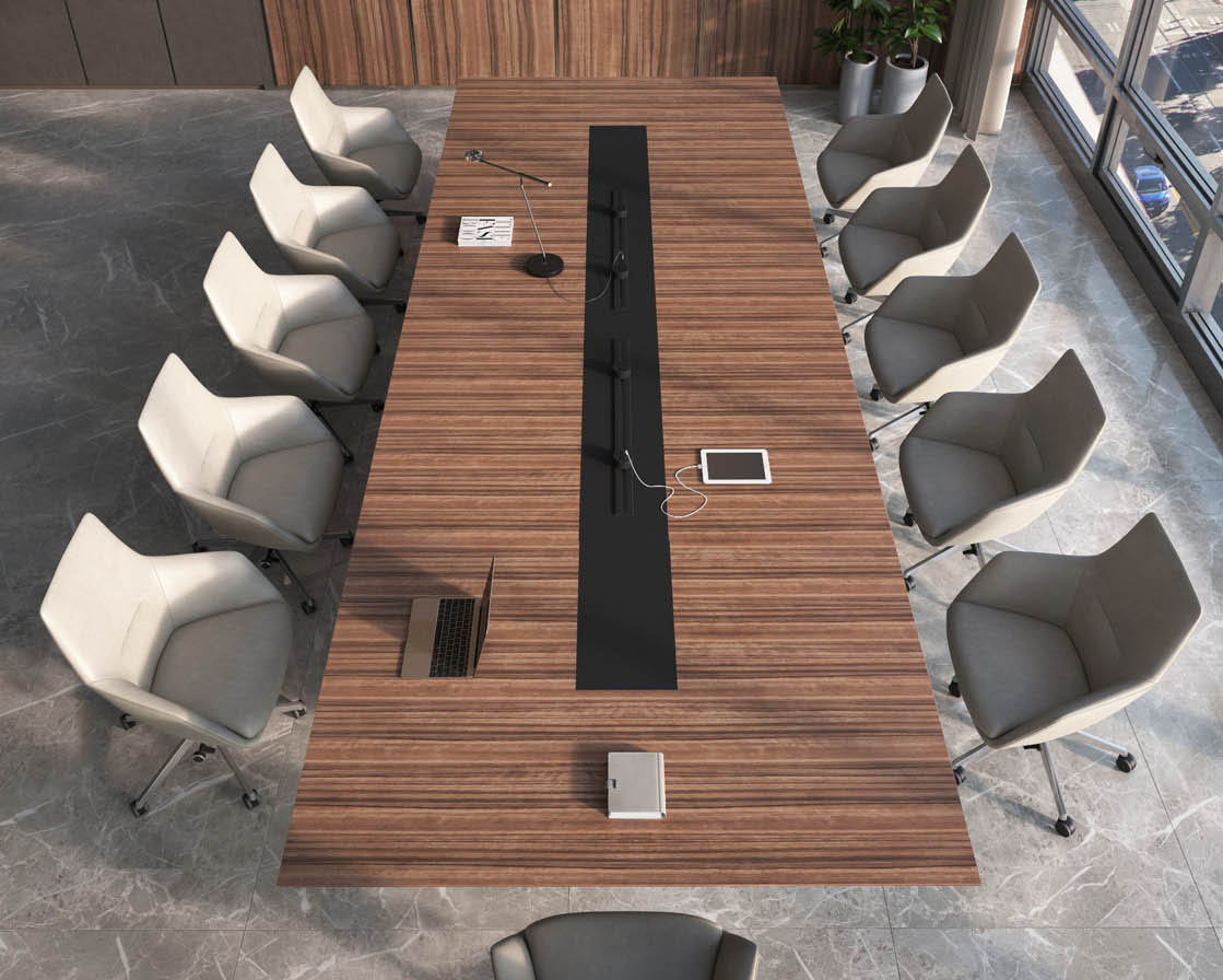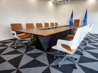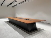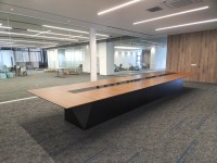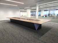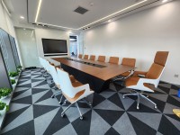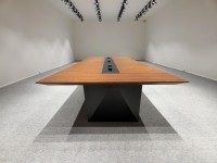 1、台面60mm厚木皮油漆,台面中间扪黑色超纤皮,周边为斜边处理配电力路轨;