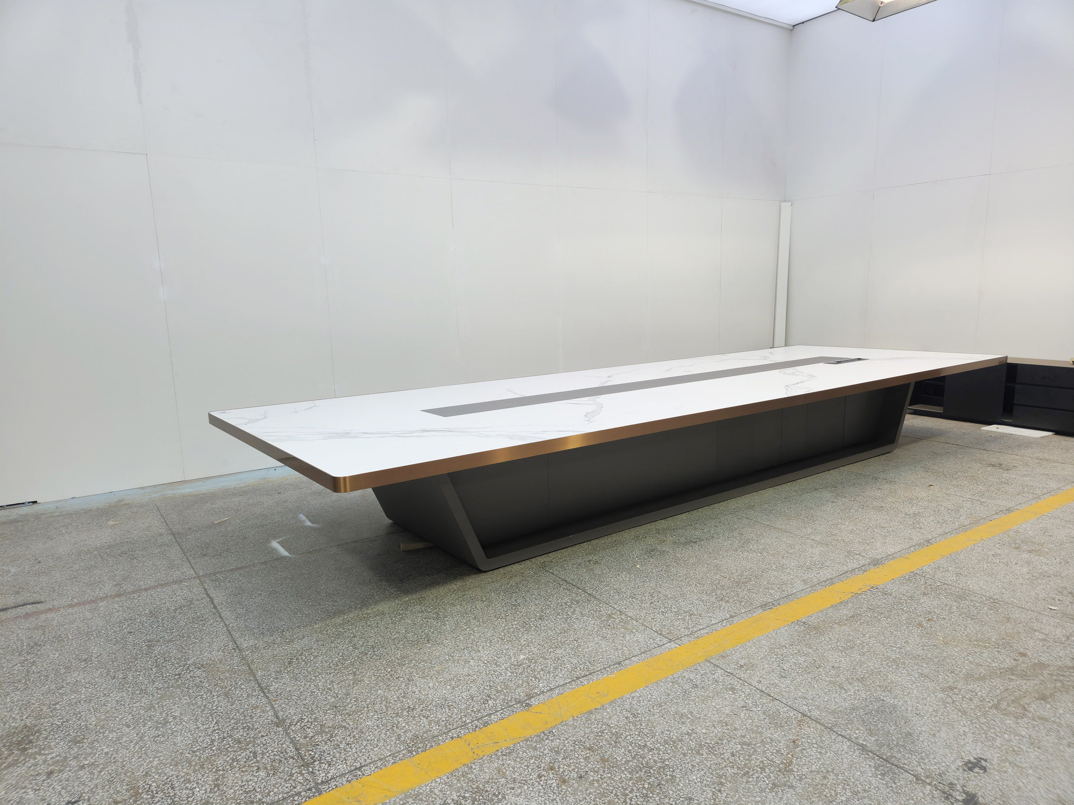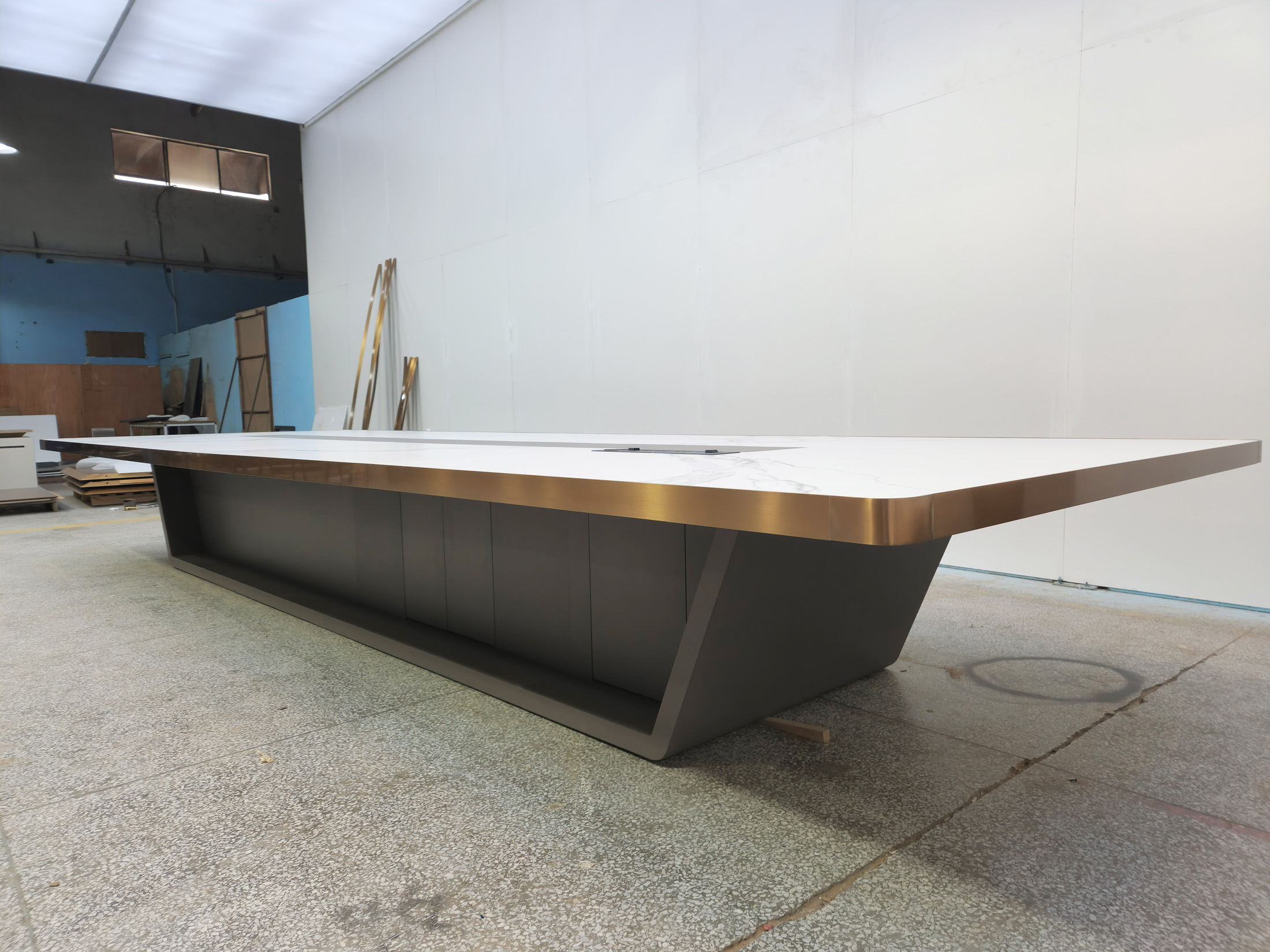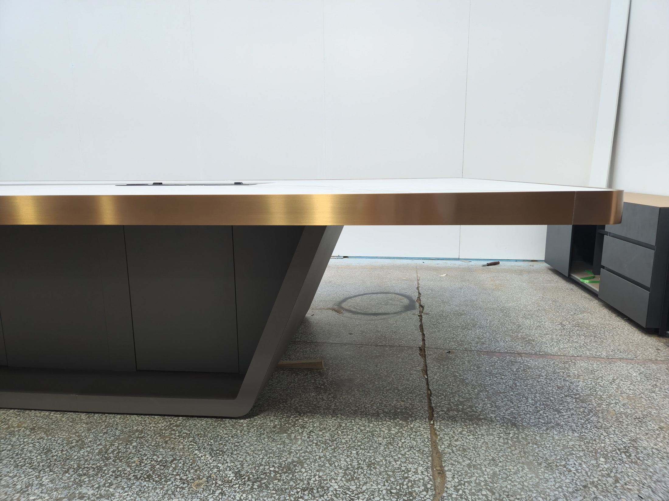 1、台面60mm厚木皮油漆,拉丝玫瑰金包边(选配),配置2条电力路轨含弱电(1USB,1电话,1网络,1高清)配4个强电插座,2、台脚木皮油漆拉丝玫瑰金包边(选配),台底LED灯带,U型台脚。