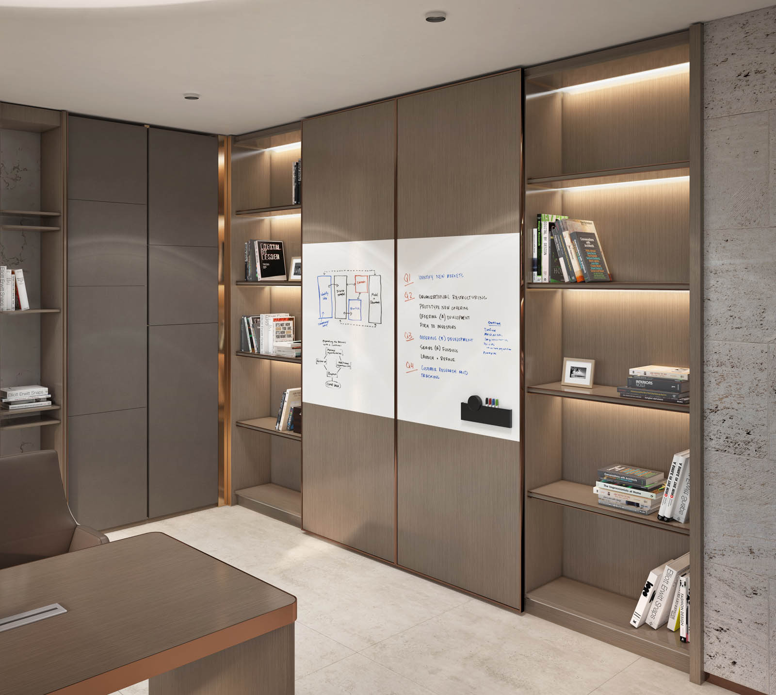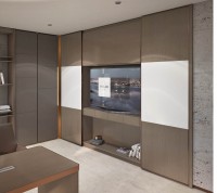 2、意大利进口移门配件,白色为白板(可写字),层板带LED灯(带感应器),中间空格带抽屉,上面可放电视(海福乐路轨)