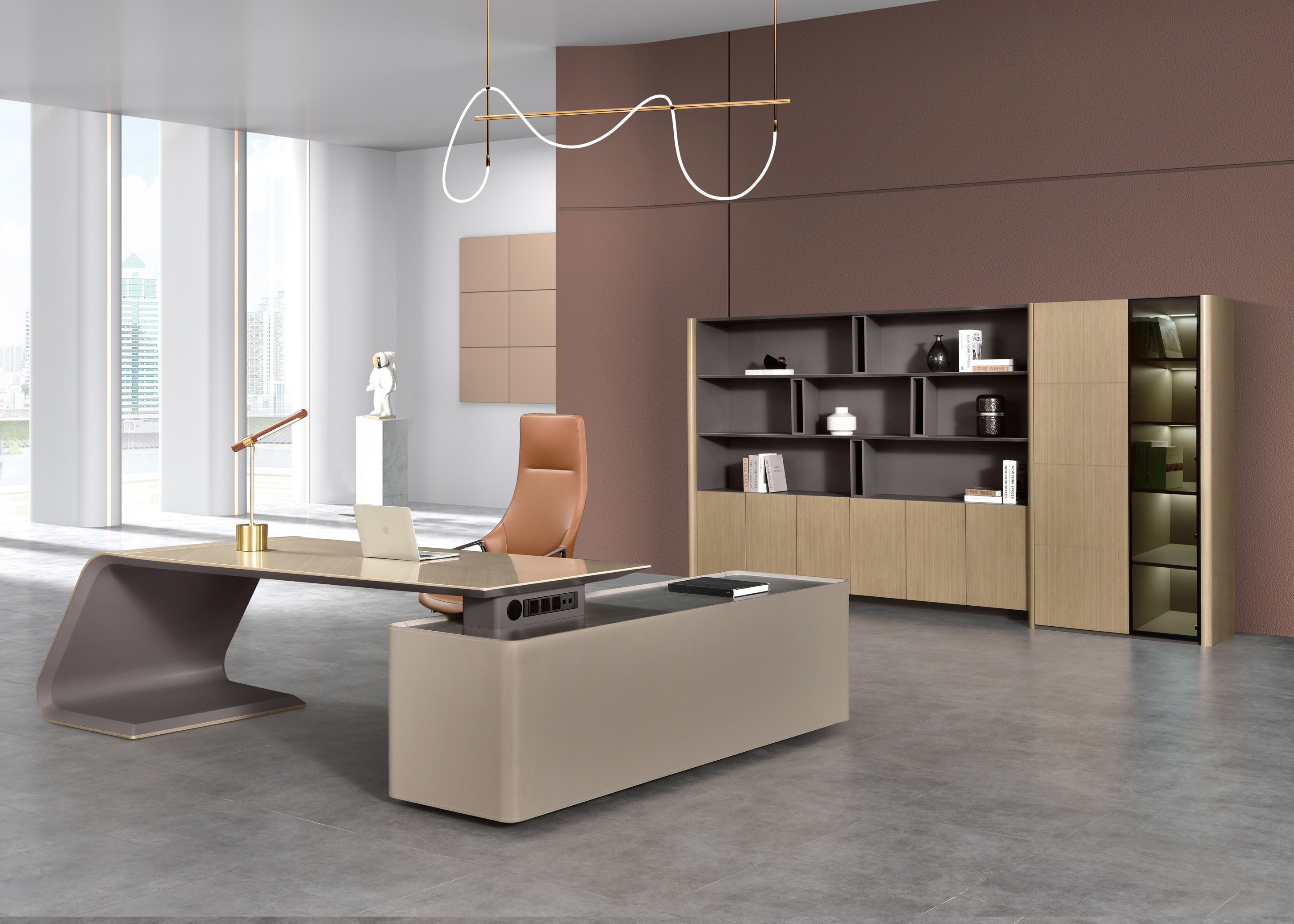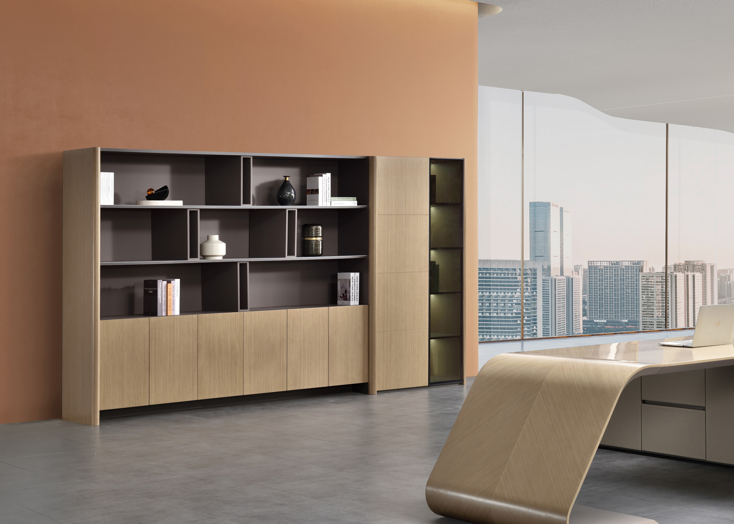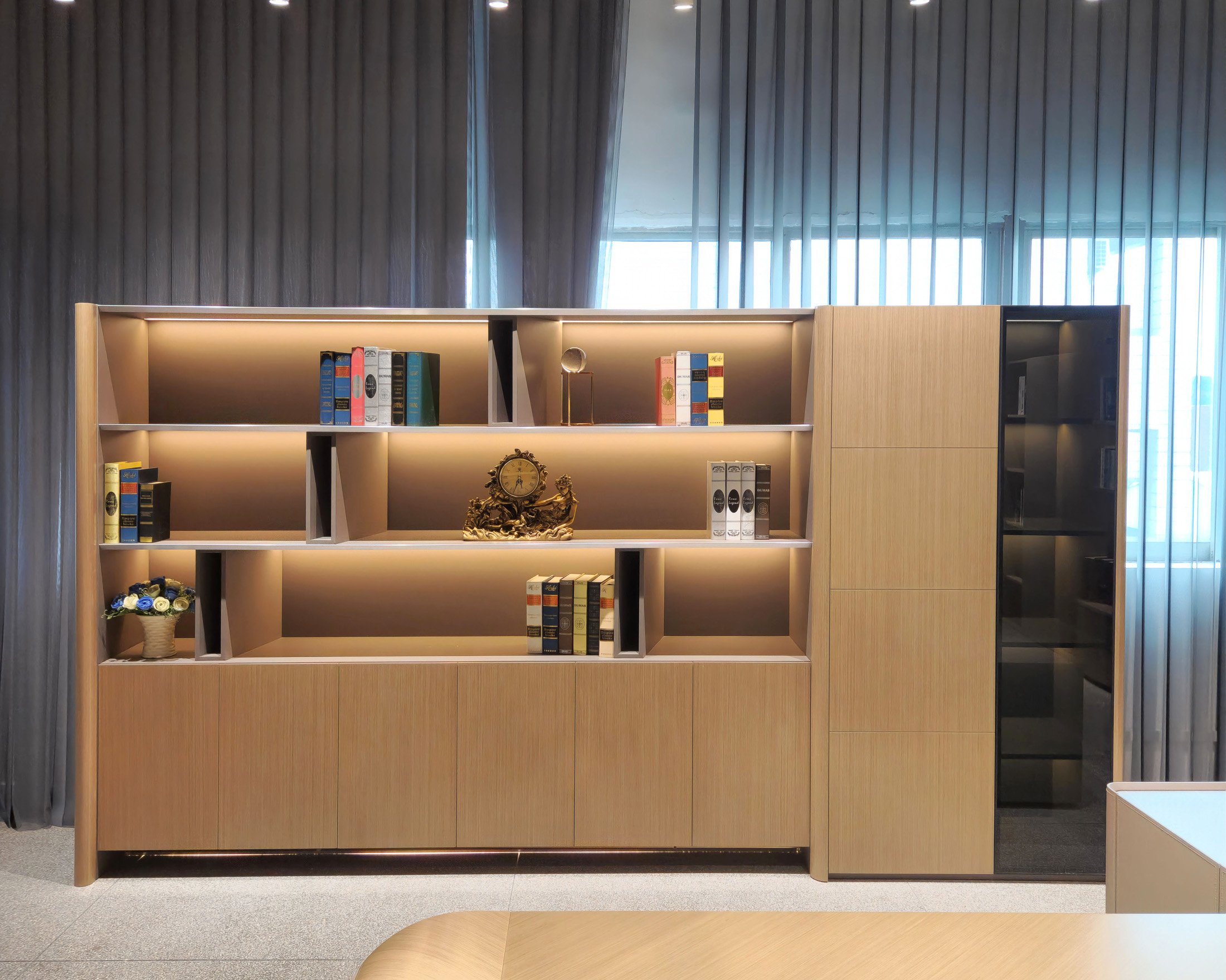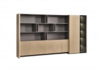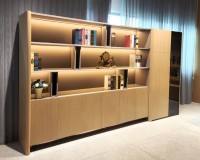 1、空格柜为伦敦灰哑光漆,边柜和矮柜柜内为三胺板,其余木皮色,5厘茶色钢化玻璃。2、边柜侧板50厚倒圆边,按弹门,柜内伸缩衣通,极简铝合金框玻门,柜内层板带LED灯带,空格柜层板镶铝合金边带LED灯带,下掩门柜离地100mm高带LED灯带,海福乐五金。