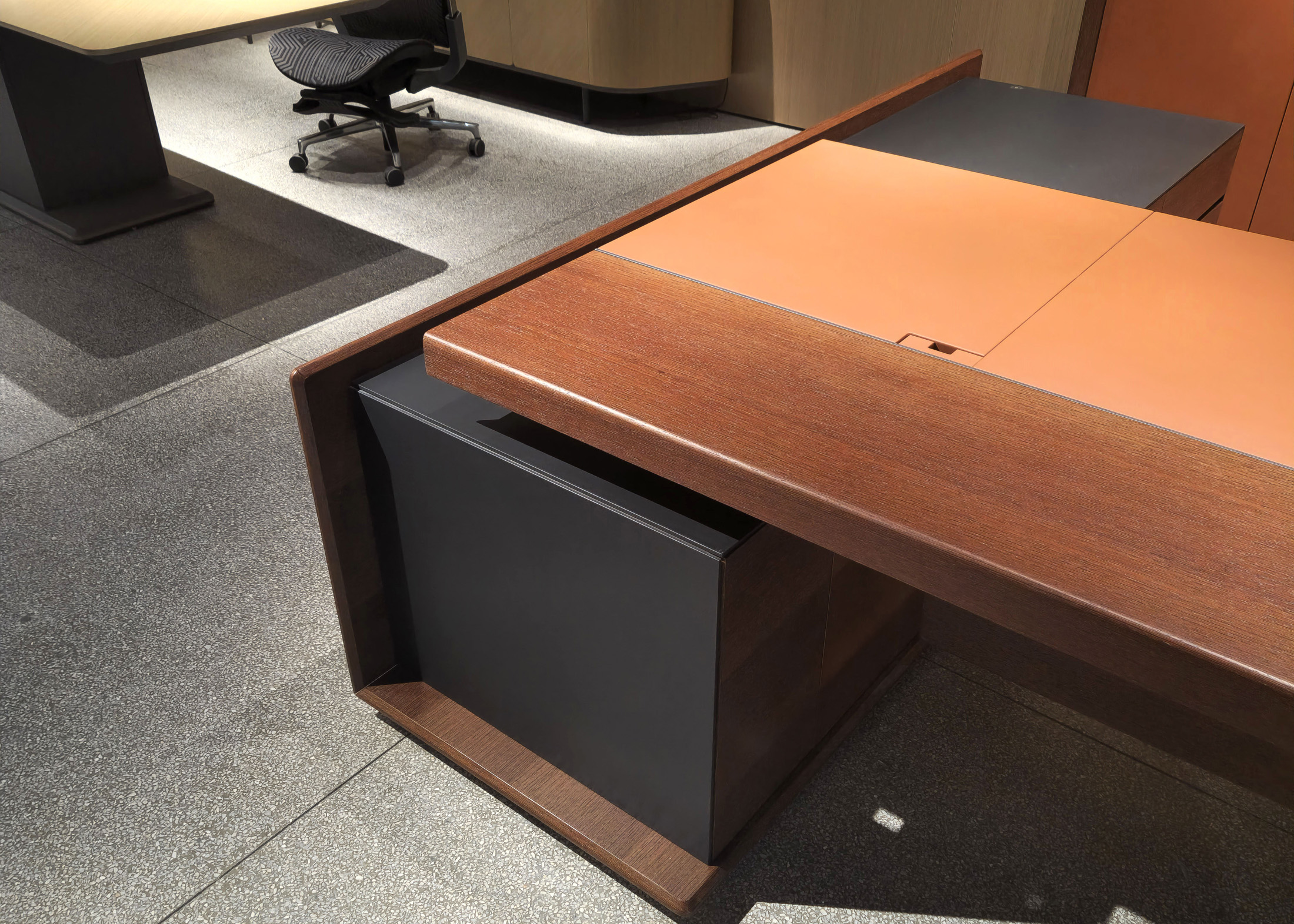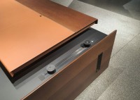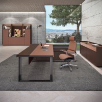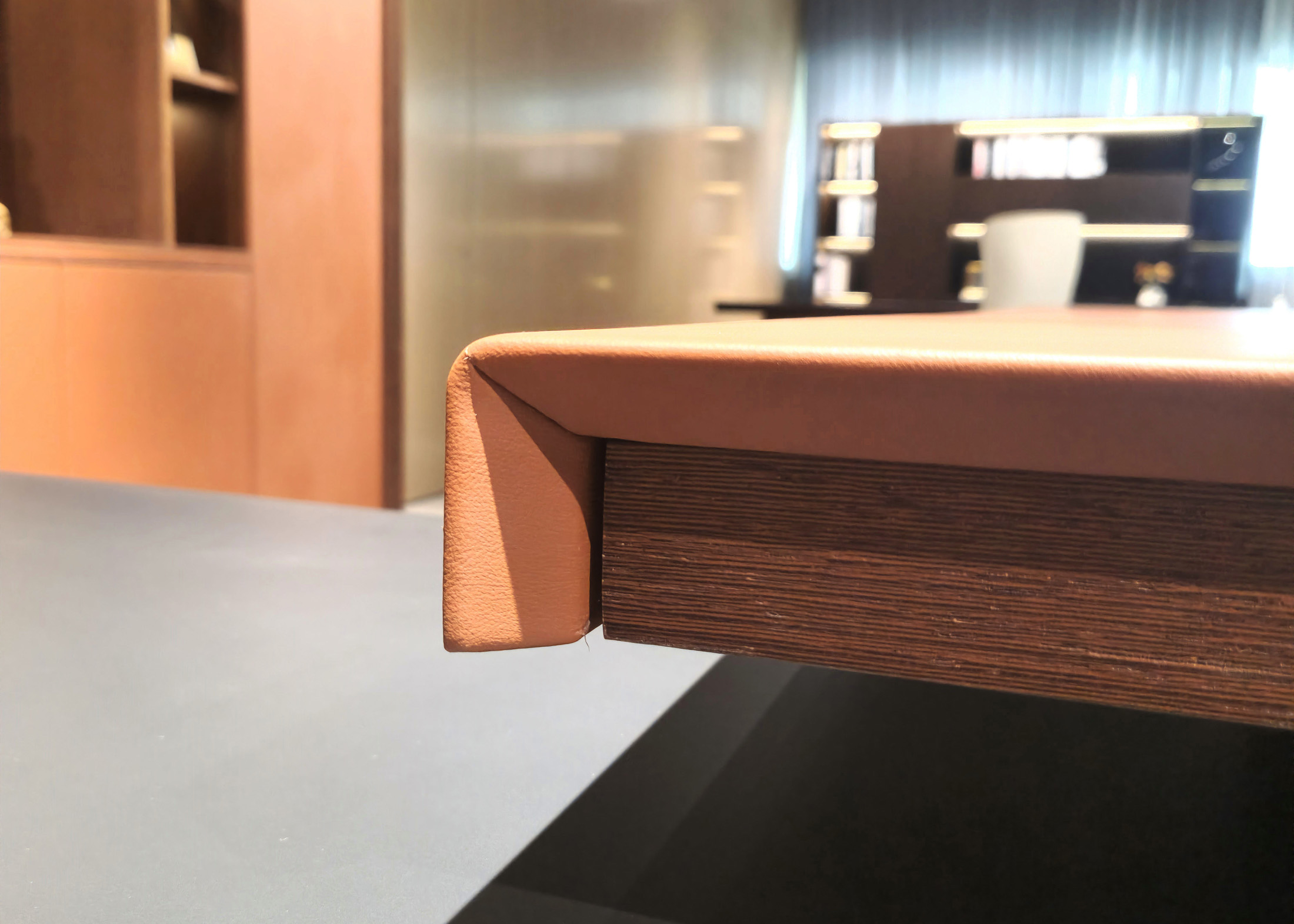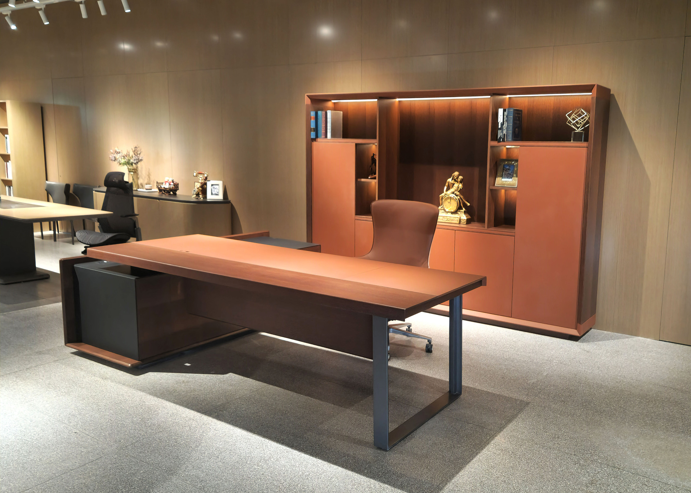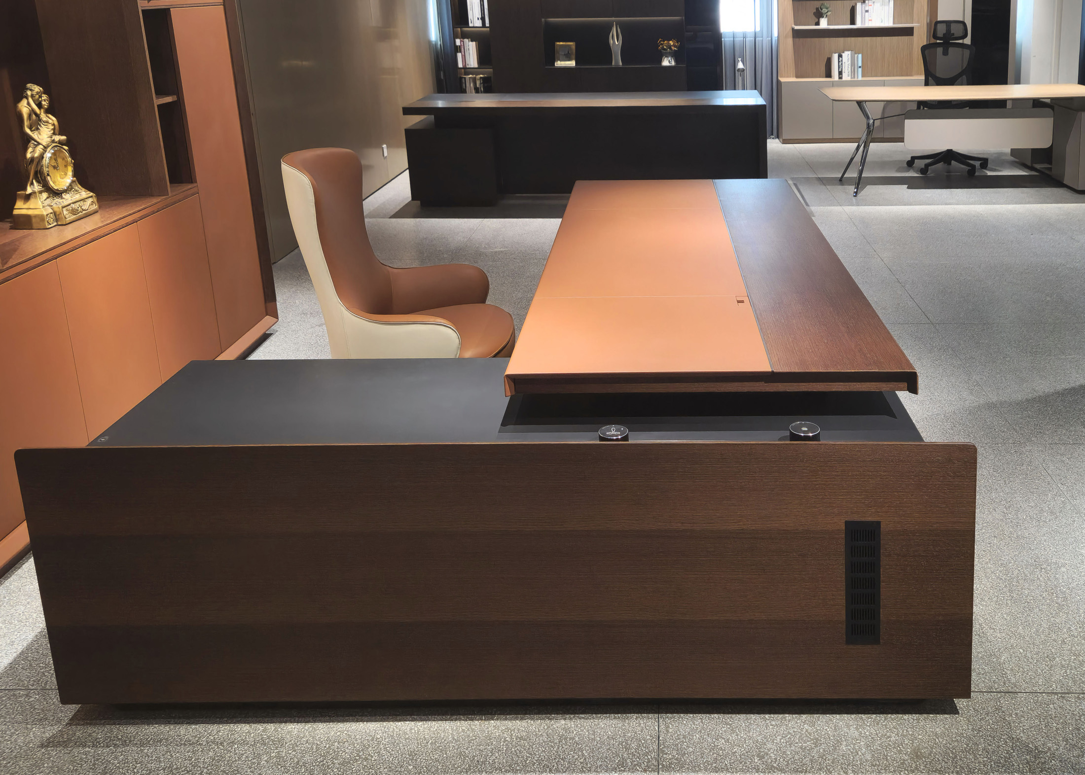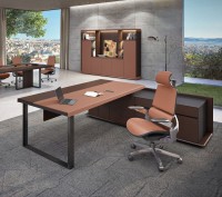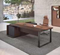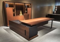 1、台面60mm,一半扪皮一半木皮油漆,中间不锈钢装饰条;2、挡板、副柜抽面、门板、底板、背板木皮油漆,其余三胺板;3、副柜带电力路轨,中间上抽带指纹锁;4、电镀拉丝枪黑不锈钢脚,钢制台架。
