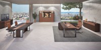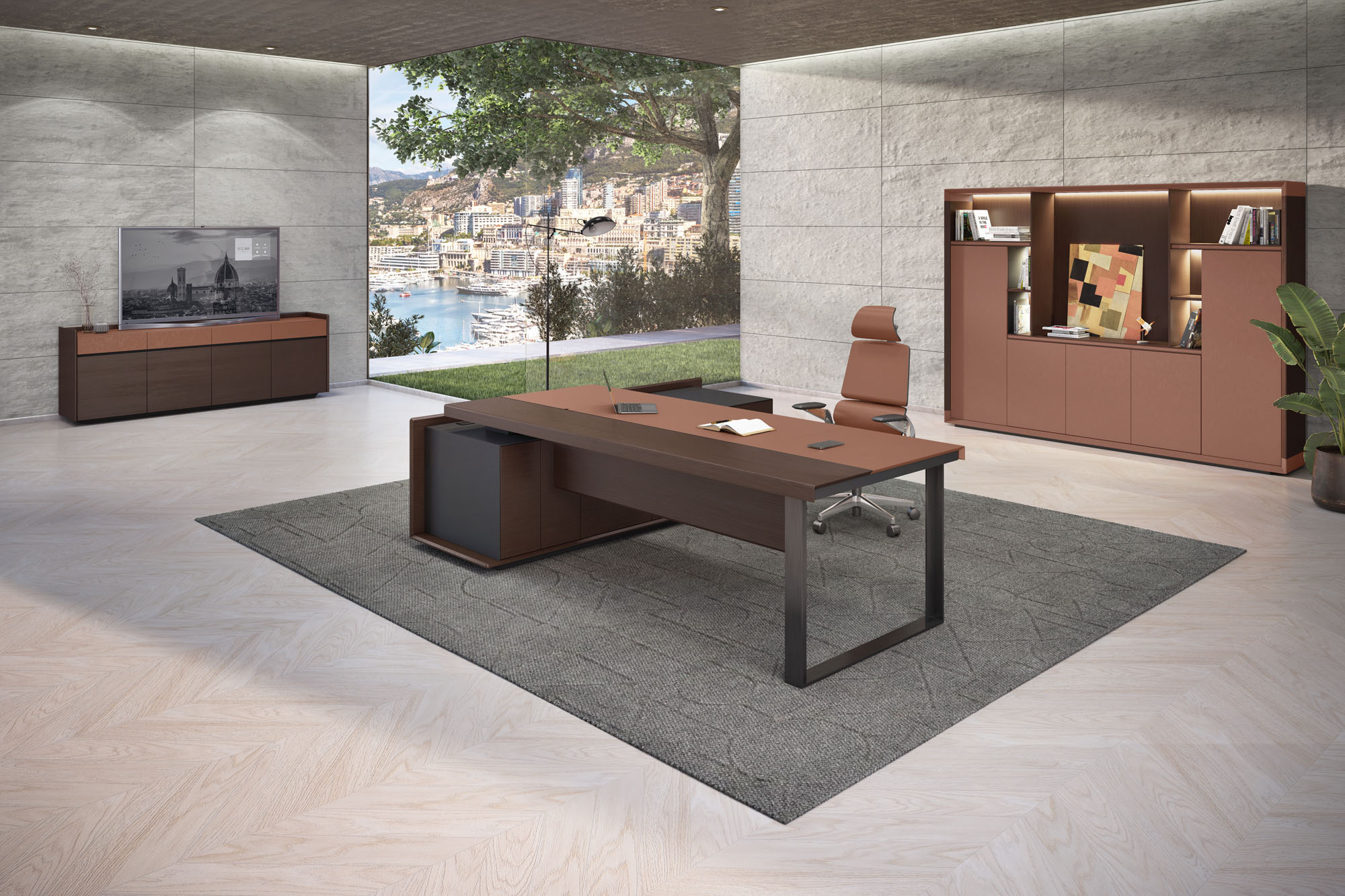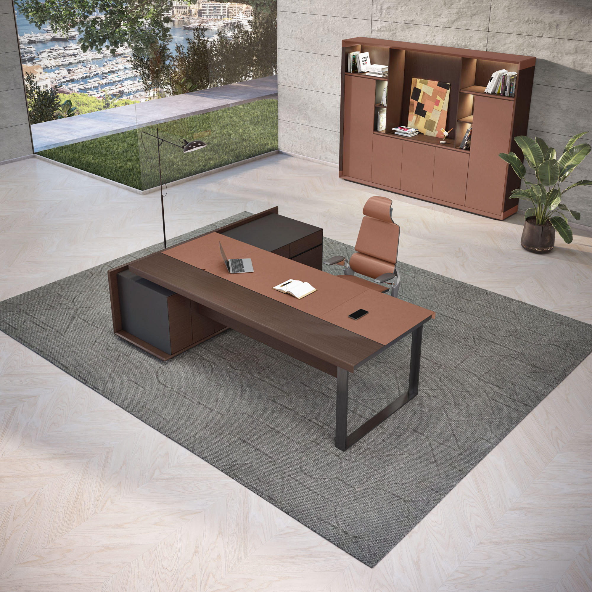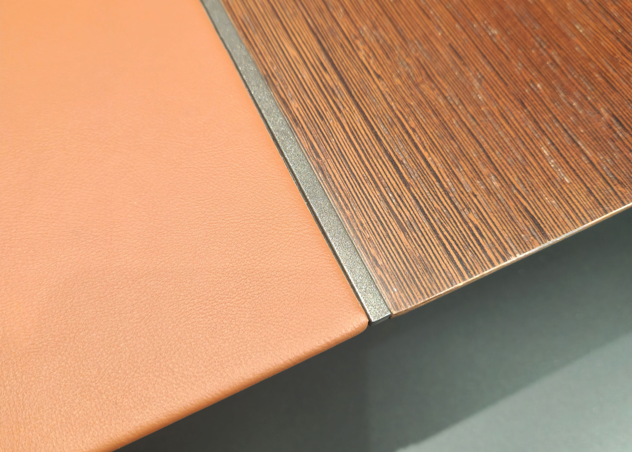 1、台面60mm,一半扪皮一半木皮油漆,中间不锈钢装饰条;2、挡板、副柜抽面、门板、底板、背板木皮油漆,其余三胺板;3、副柜带电力路轨,中间上抽带指纹锁;4、电镀拉丝枪黑不锈钢脚,钢制台架。