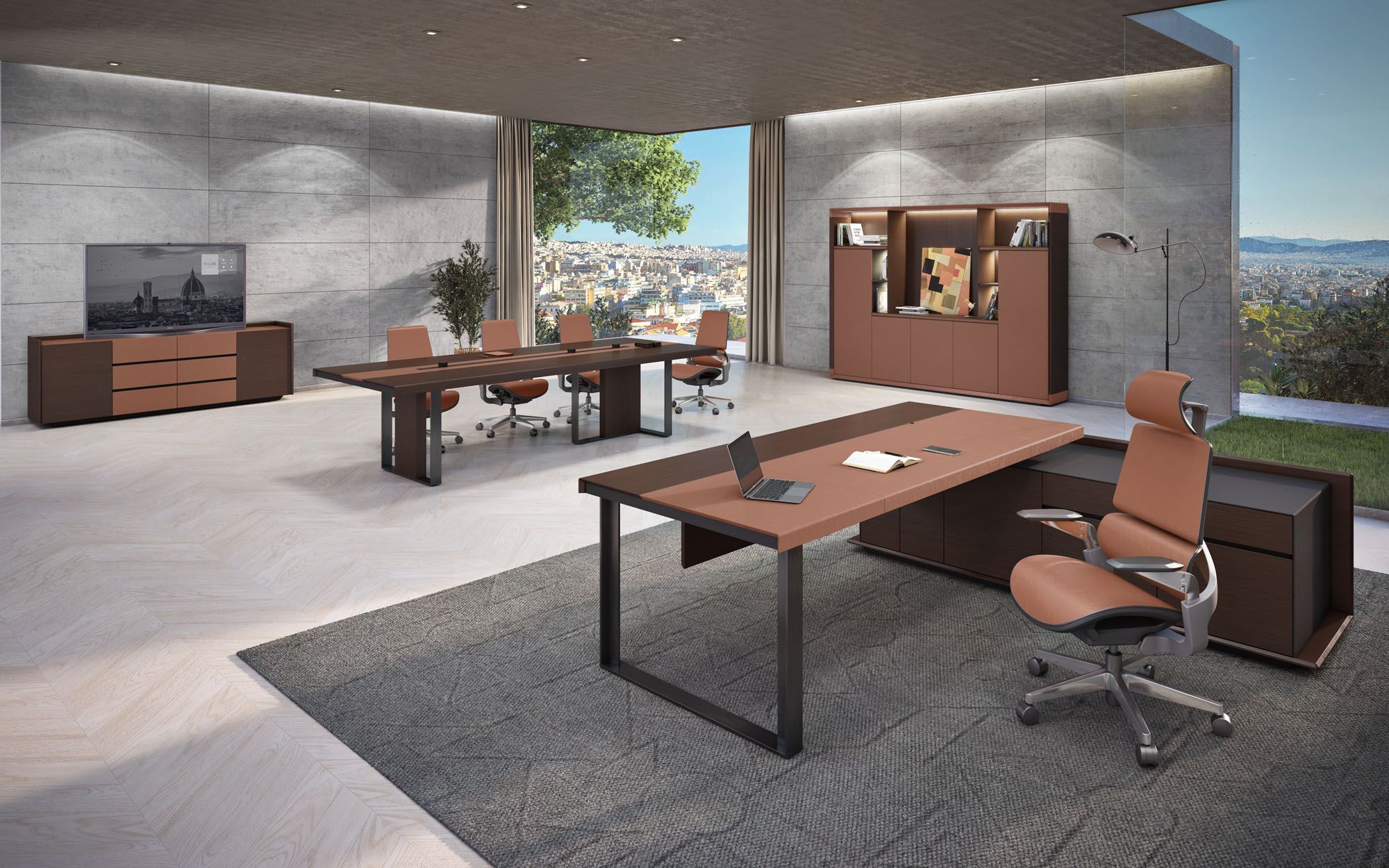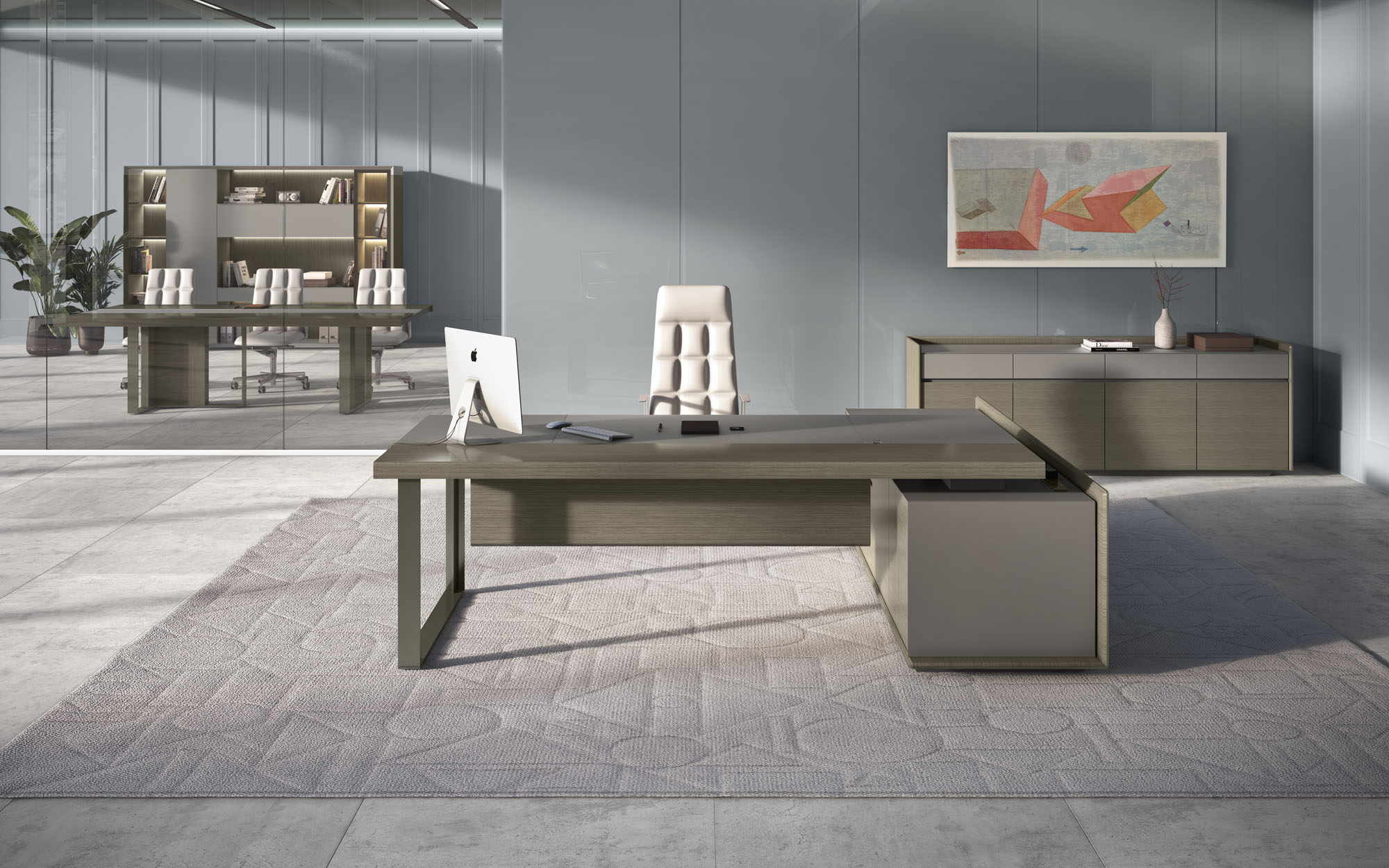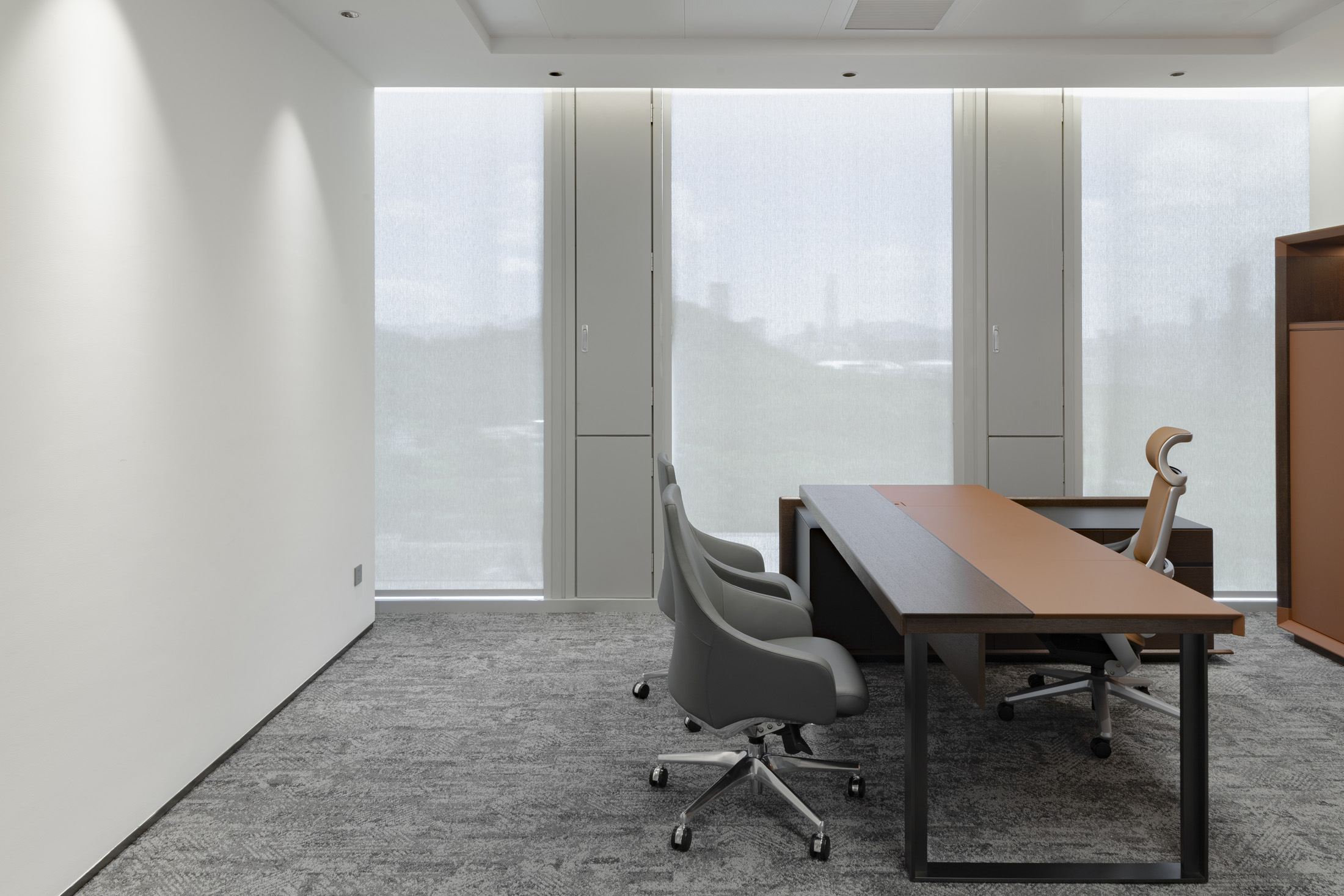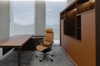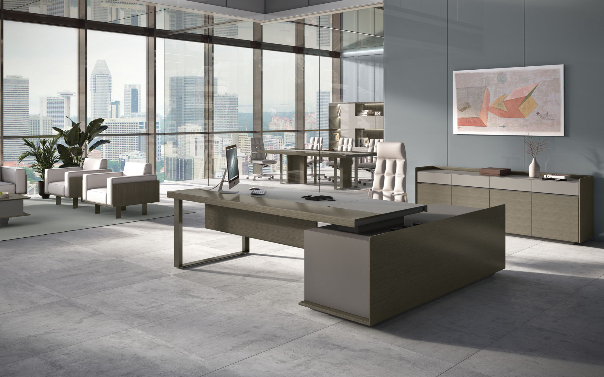 1、台面60mm,一半扪皮一半木皮油漆,中间不锈钢装饰条;2、挡板、副柜抽面、门板、底板、背板木皮油漆,其余三胺板;3、副柜带电力路轨,中间上抽带指纹锁;4、电镀拉丝枪黑不锈钢脚,钢制台架。