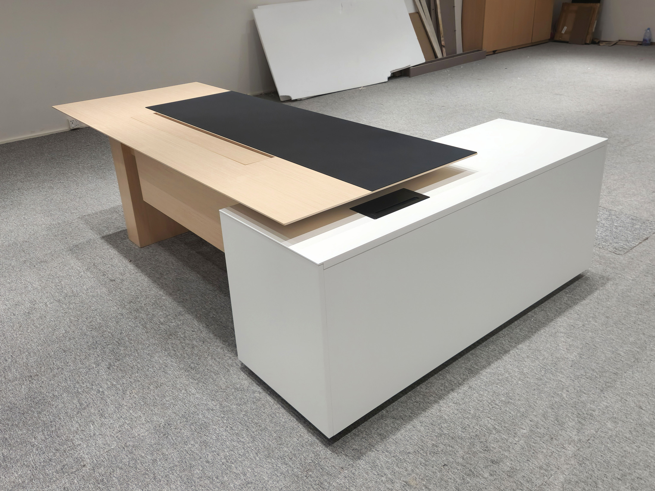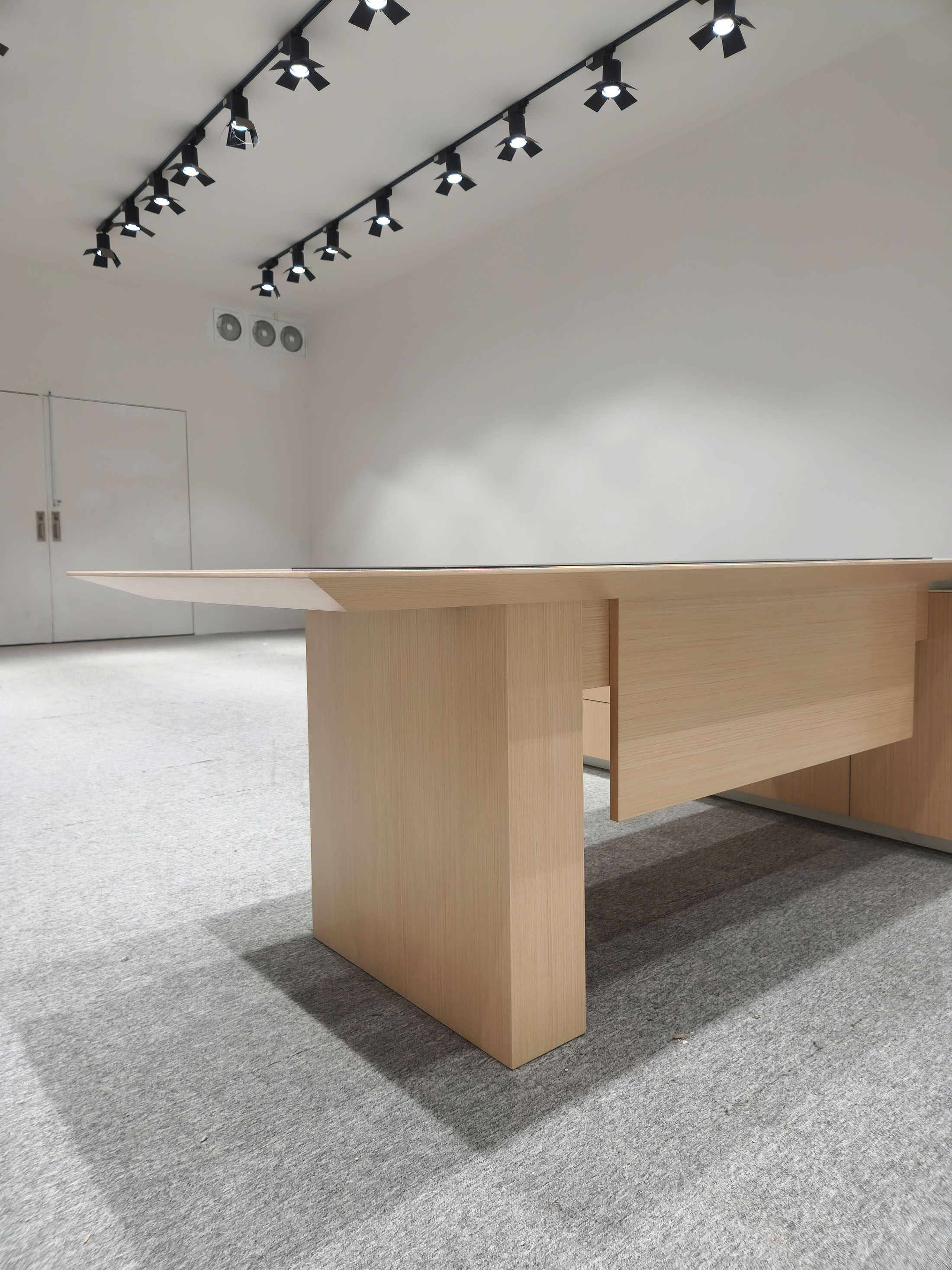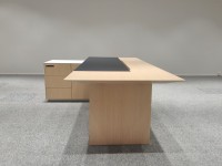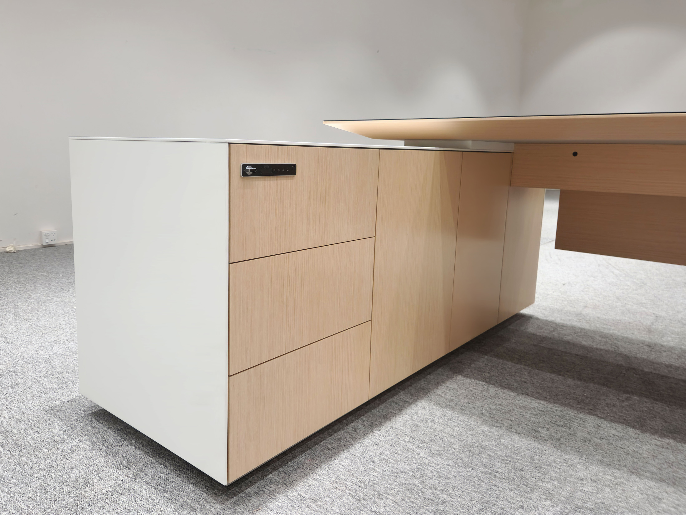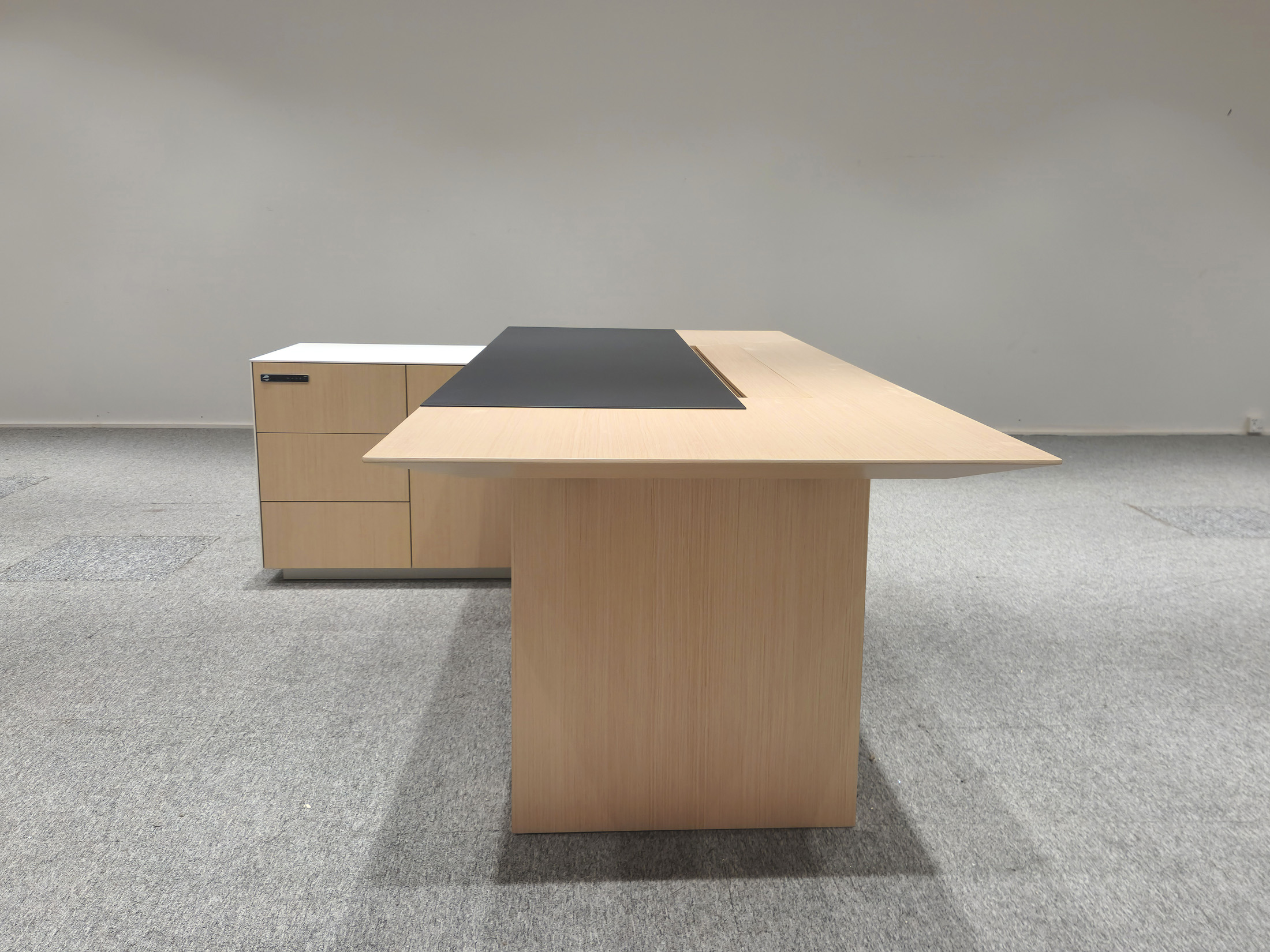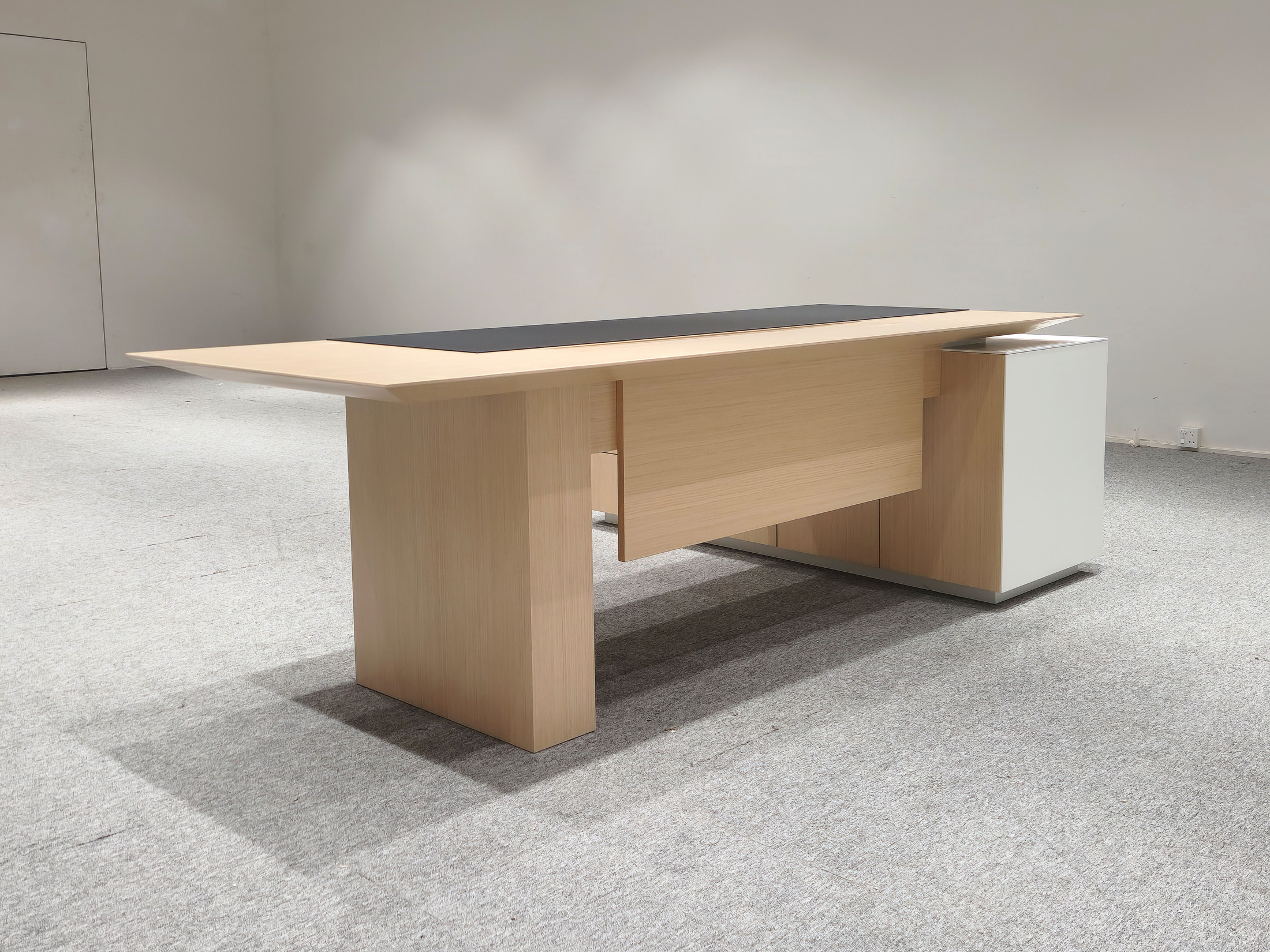 1、台面厚度50mm,木皮油漆;2、脚箱、副柜为木皮油漆,副柜柜面配一个集成线盒;3、门板和抽面扪皮,柜内三胺板。