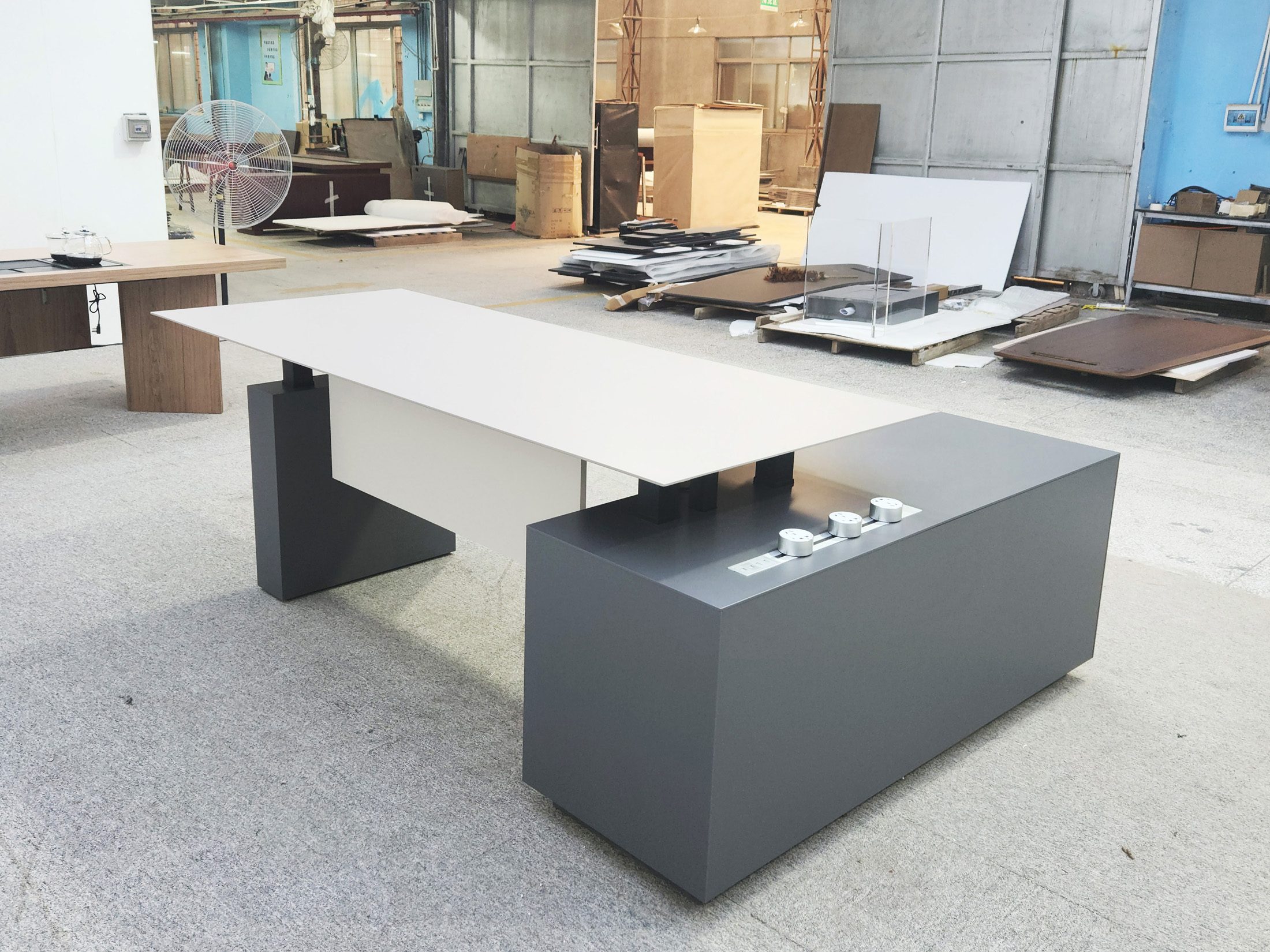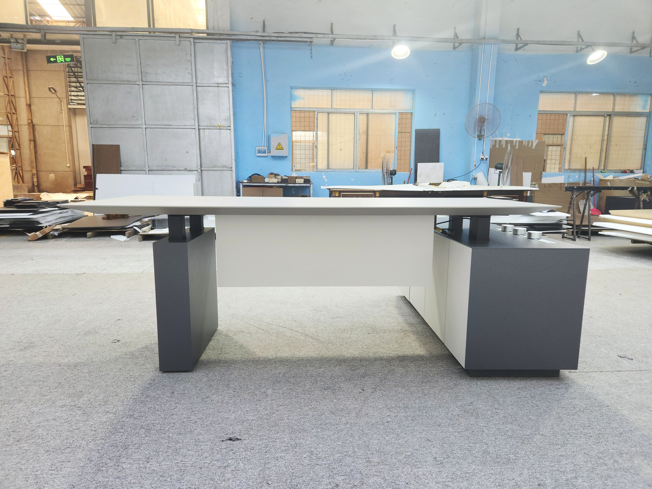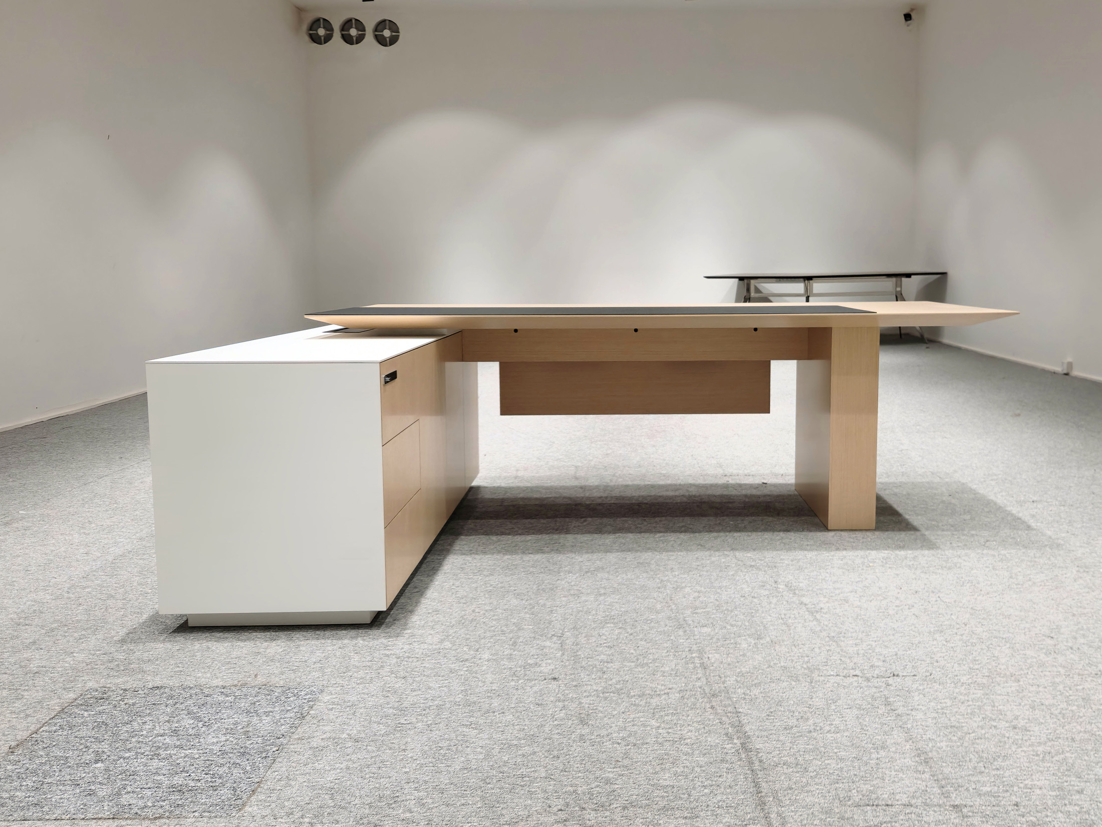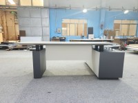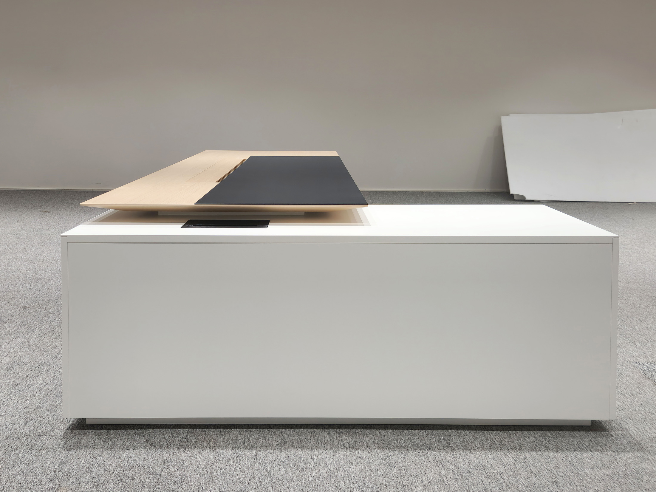 1、台面厚度50mm,木皮油漆;2、脚箱、副柜为木皮油漆,副柜柜面配一个集成线盒;3、门板和抽面扪皮,柜内三胺板。