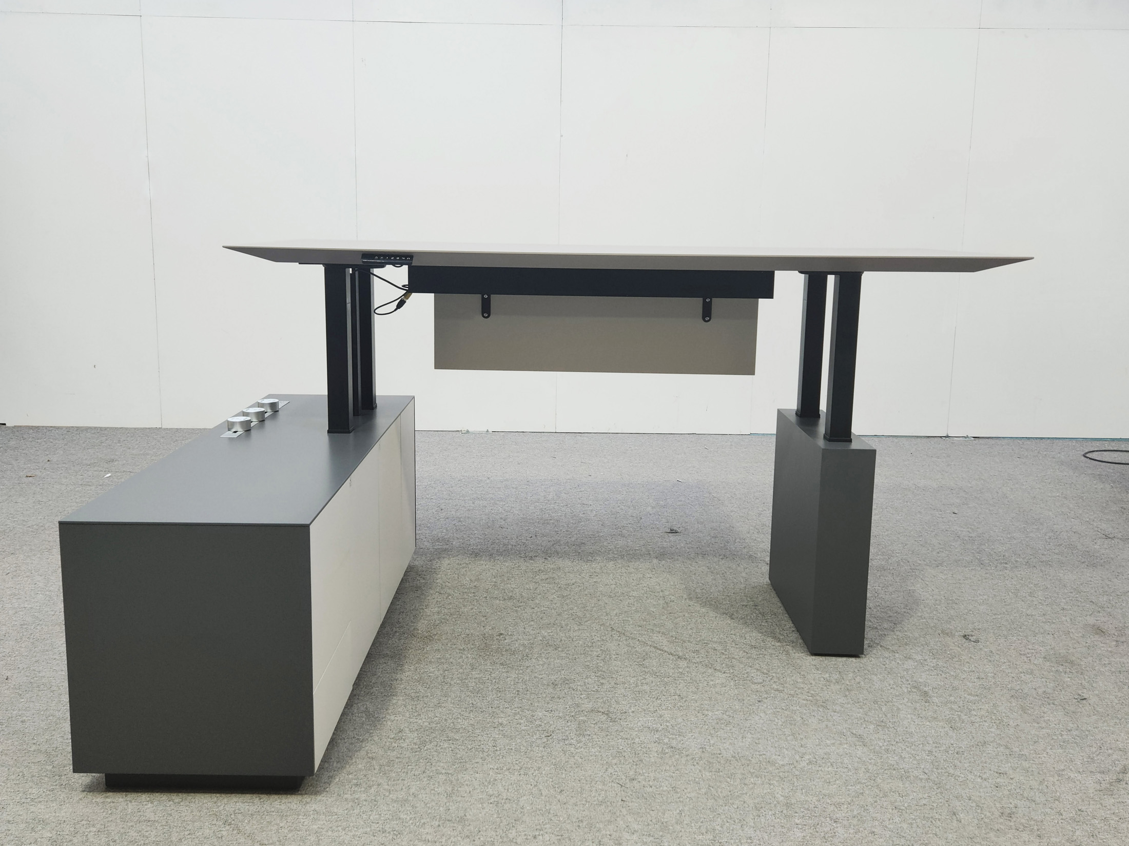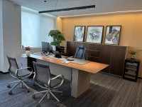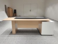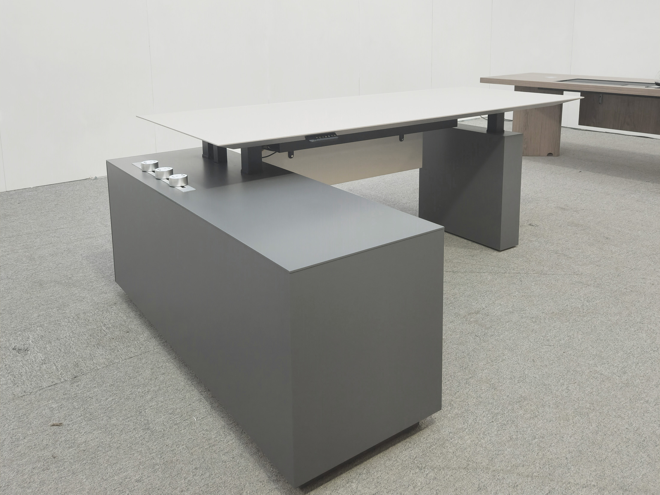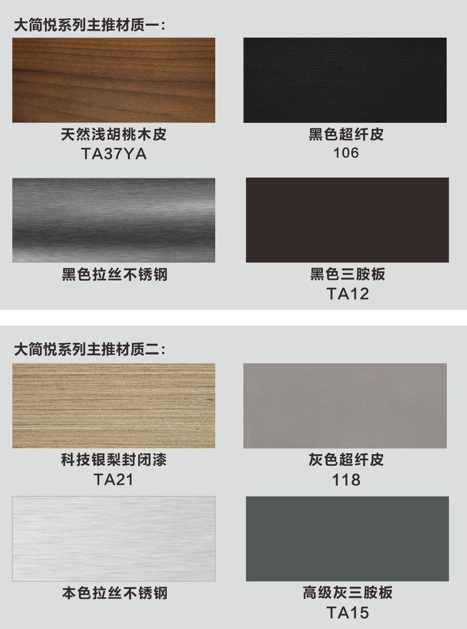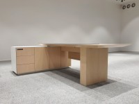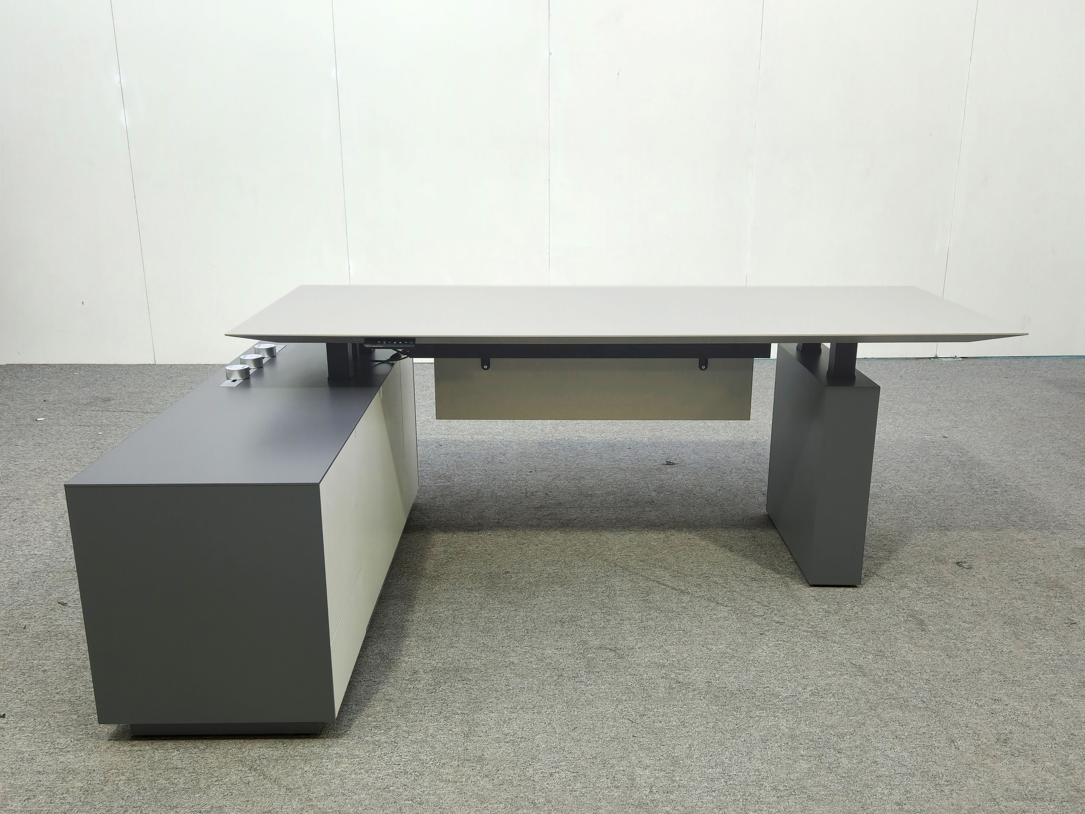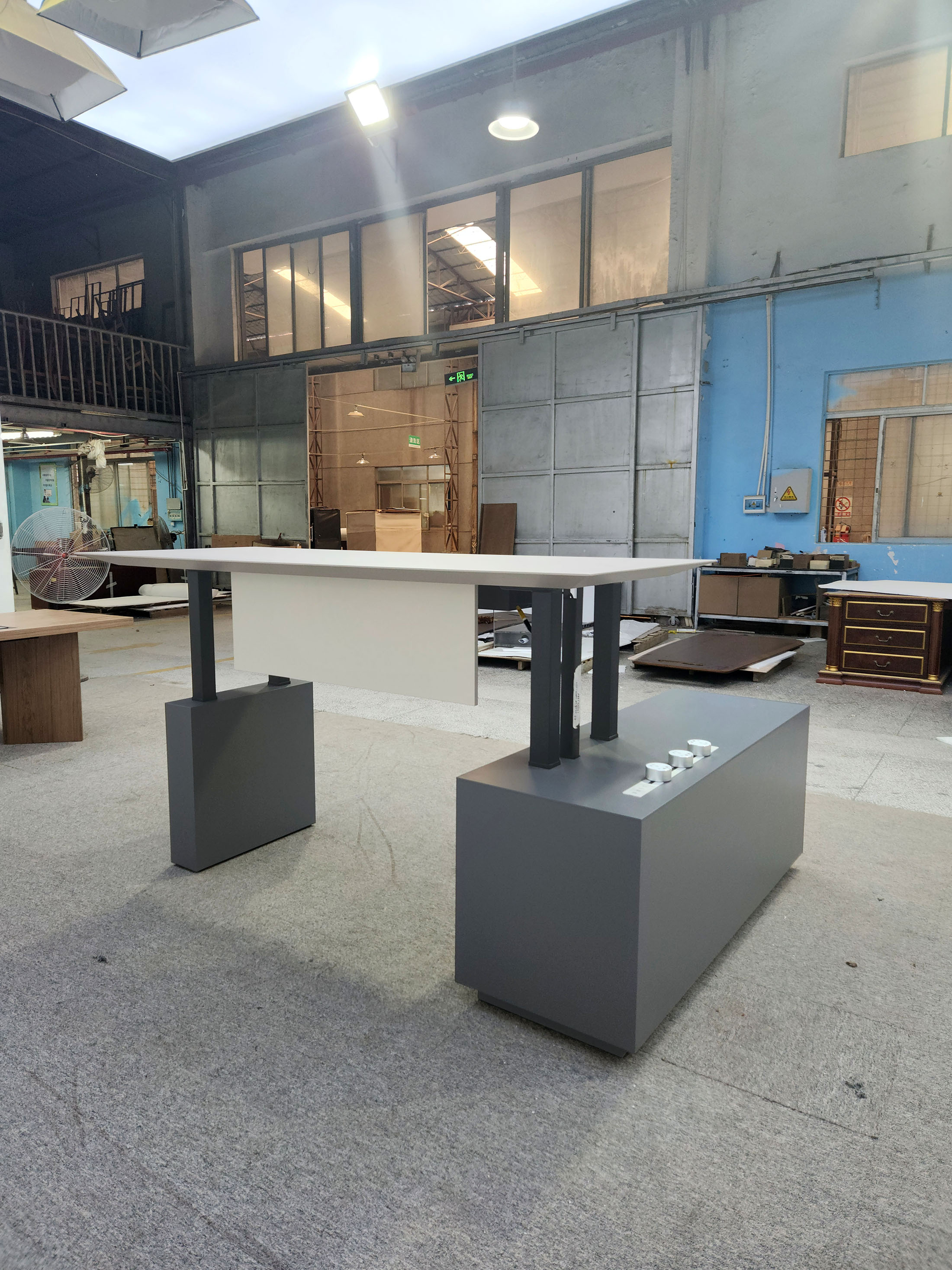 1、台面厚度50mm,木皮油漆;2、脚箱、副柜为木皮油漆,副柜柜面配一个集成线盒;3、门板和抽面扪皮,柜内三胺板。