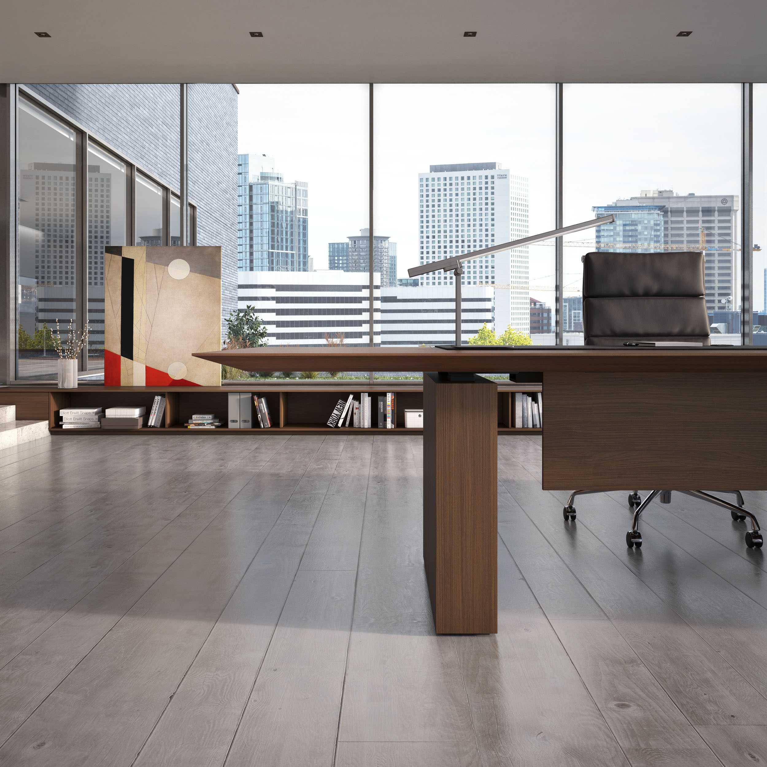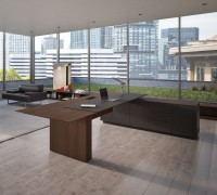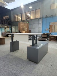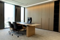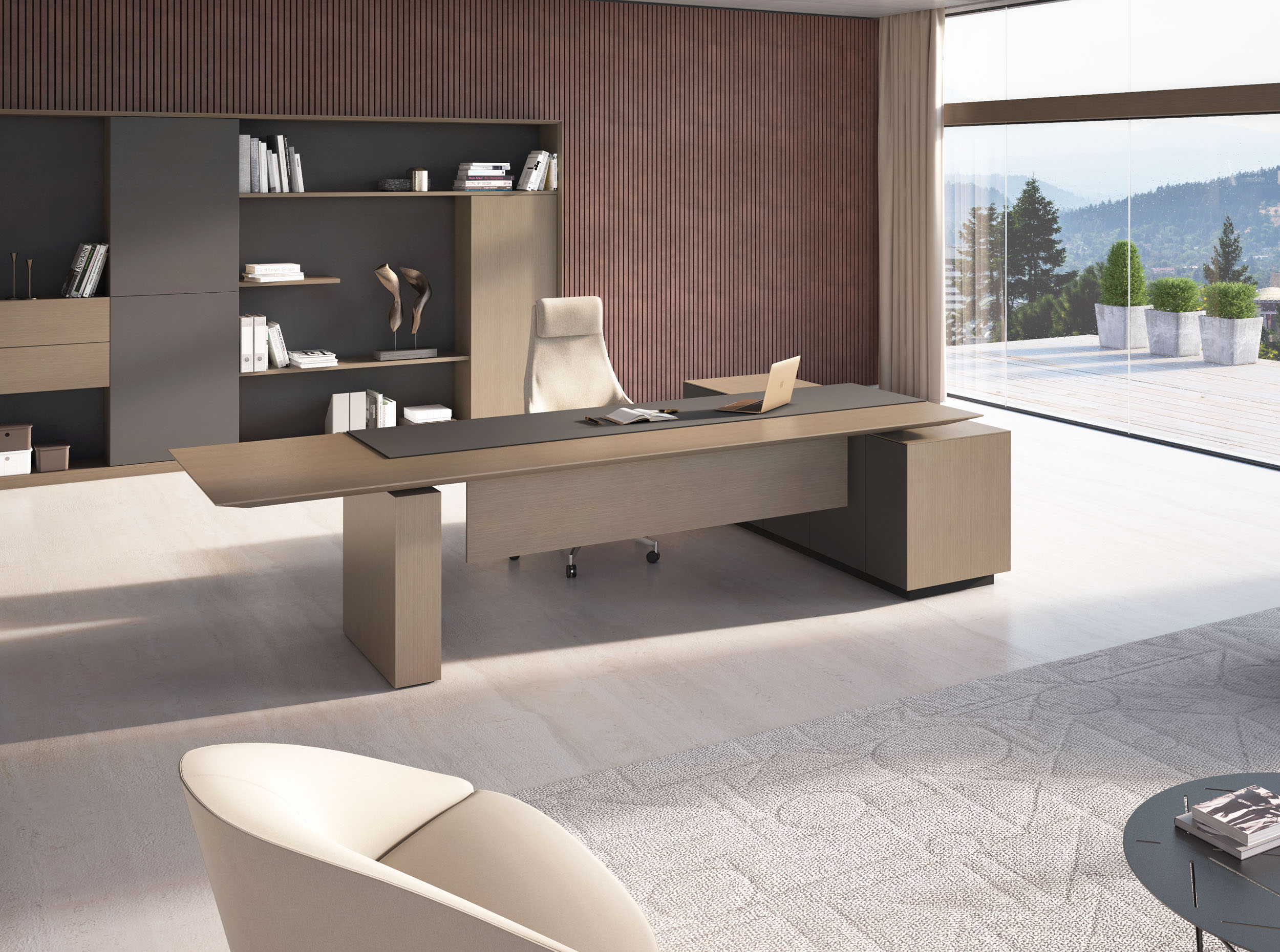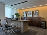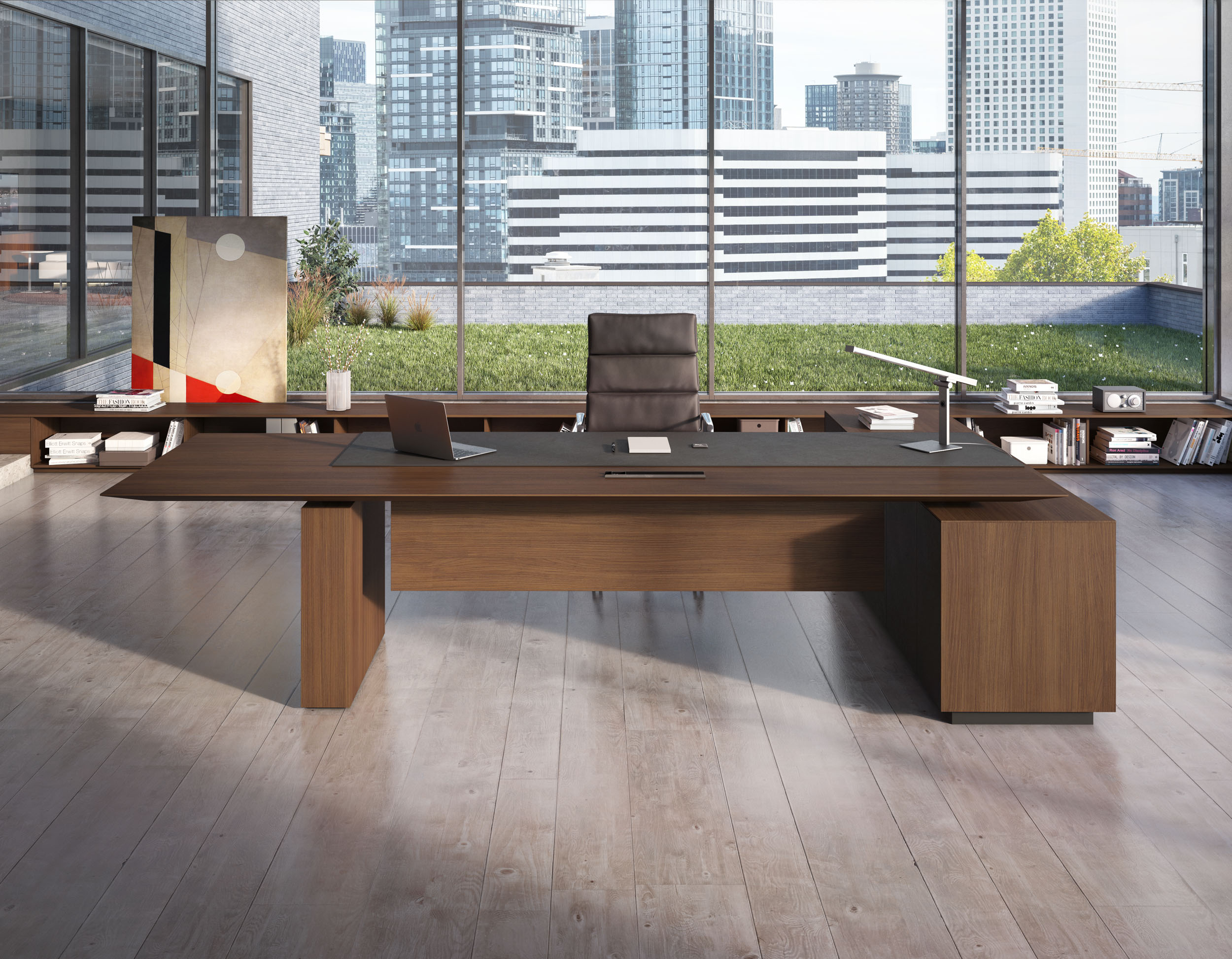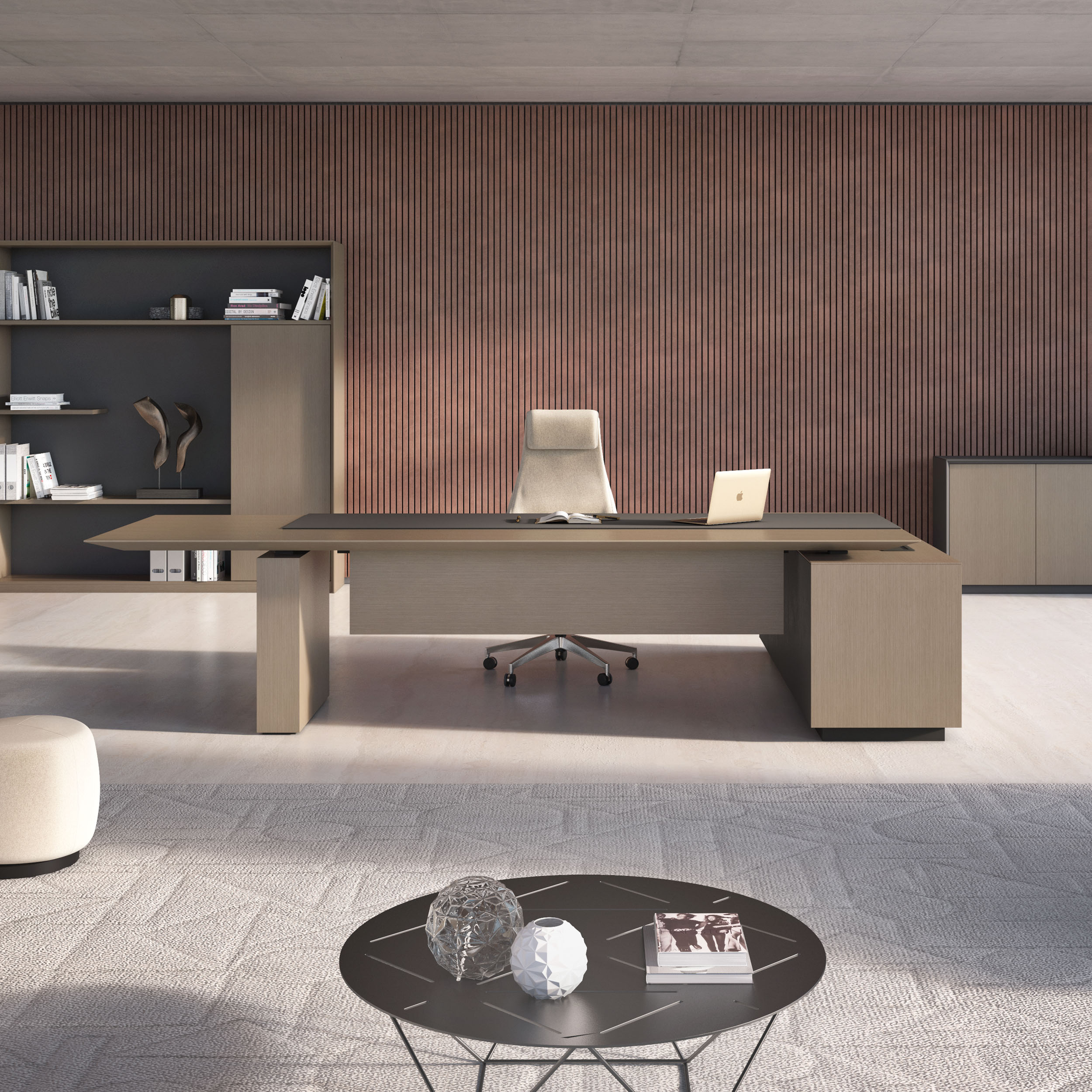 1、台面厚度50mm,木皮油漆;2、脚箱、副柜为木皮油漆,副柜柜面配一个集成线盒;3、门板和抽面扪皮,柜内三胺板。