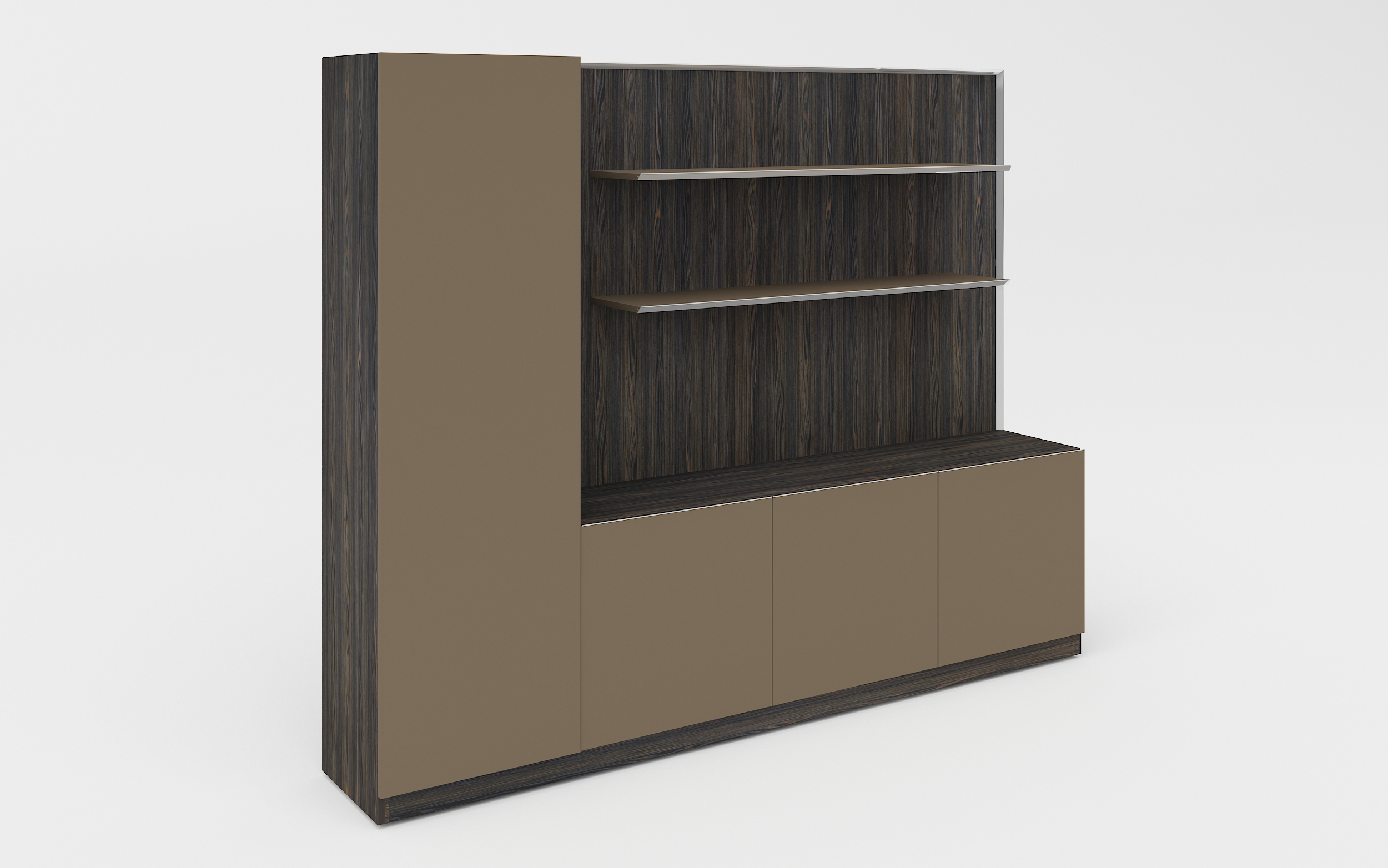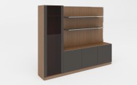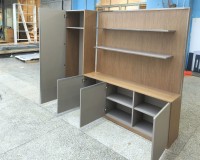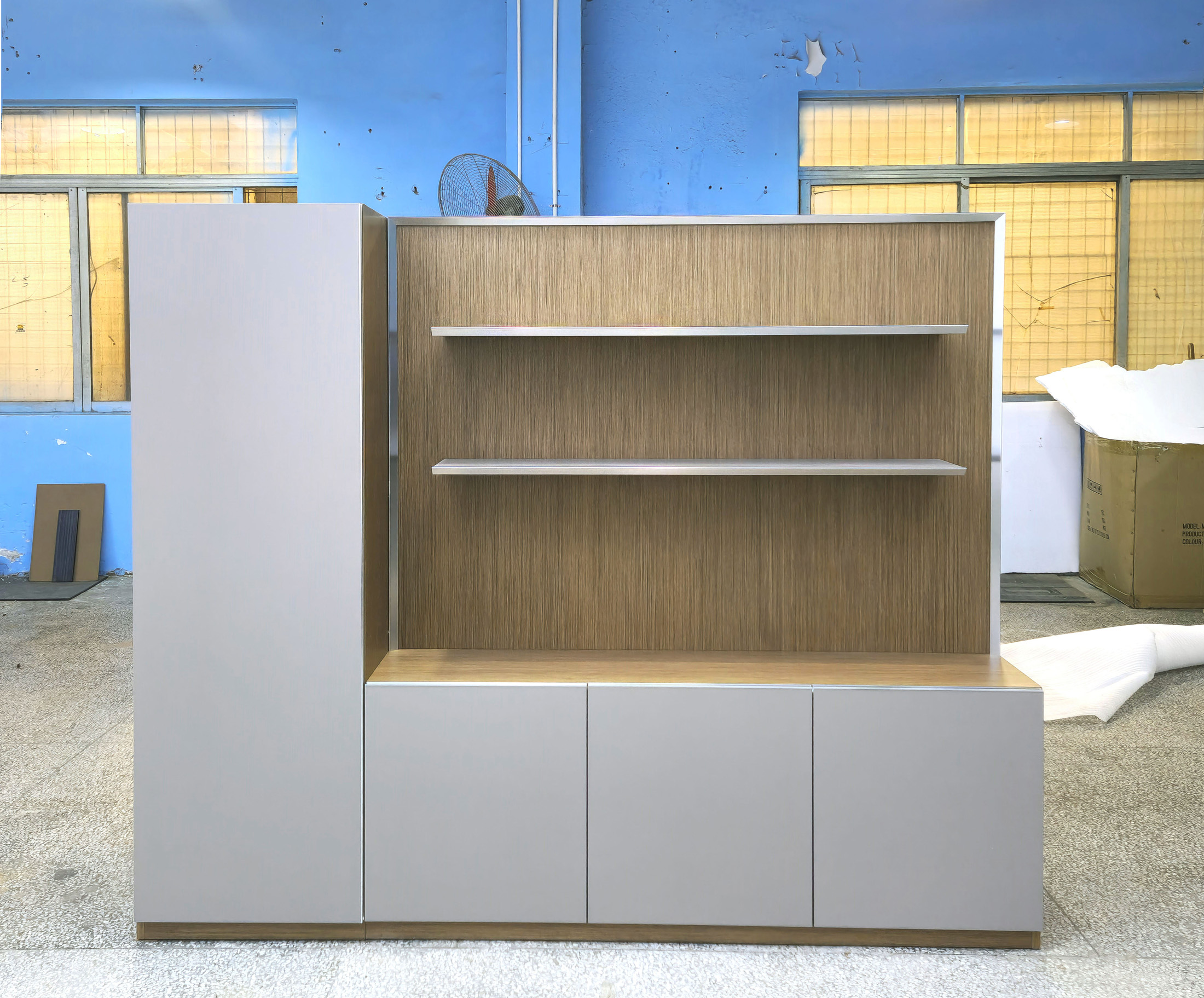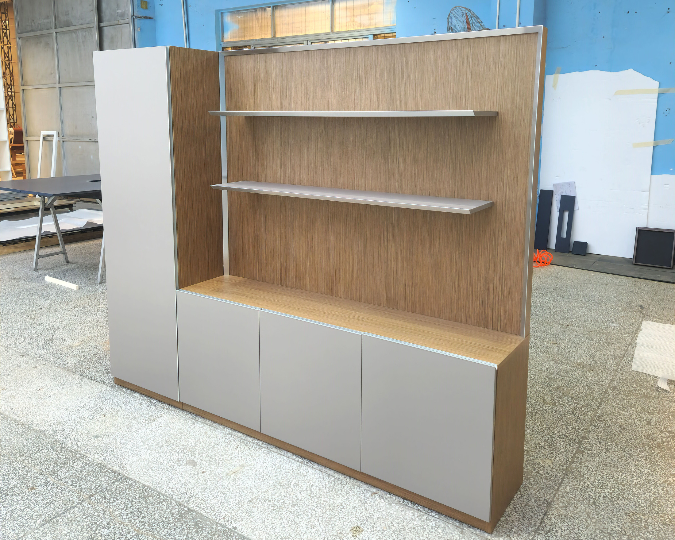 2、掩门高柜配伸缩挂衣杆,单木门板为隐藏铝边拉手,空格柜侧板和层板前面为铝装饰边。