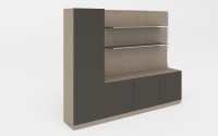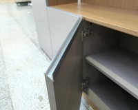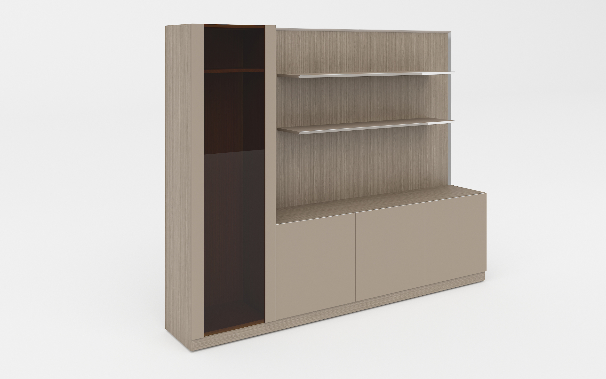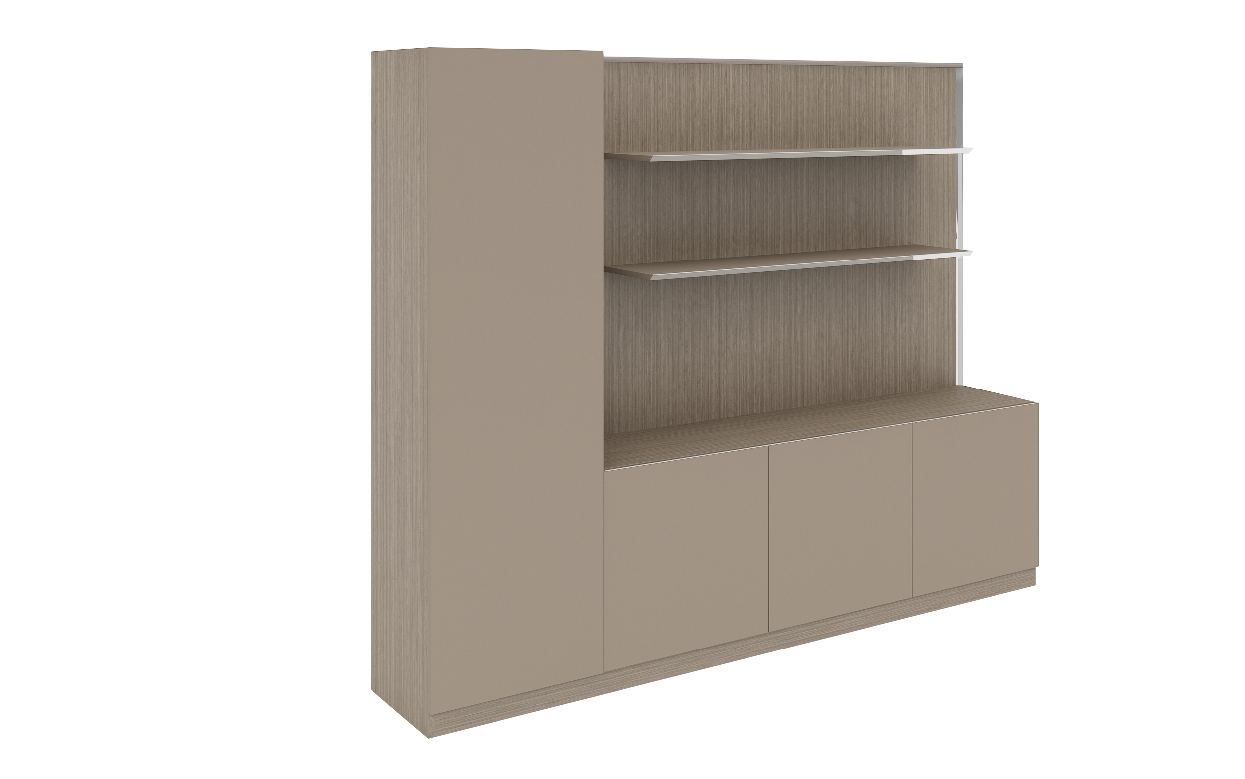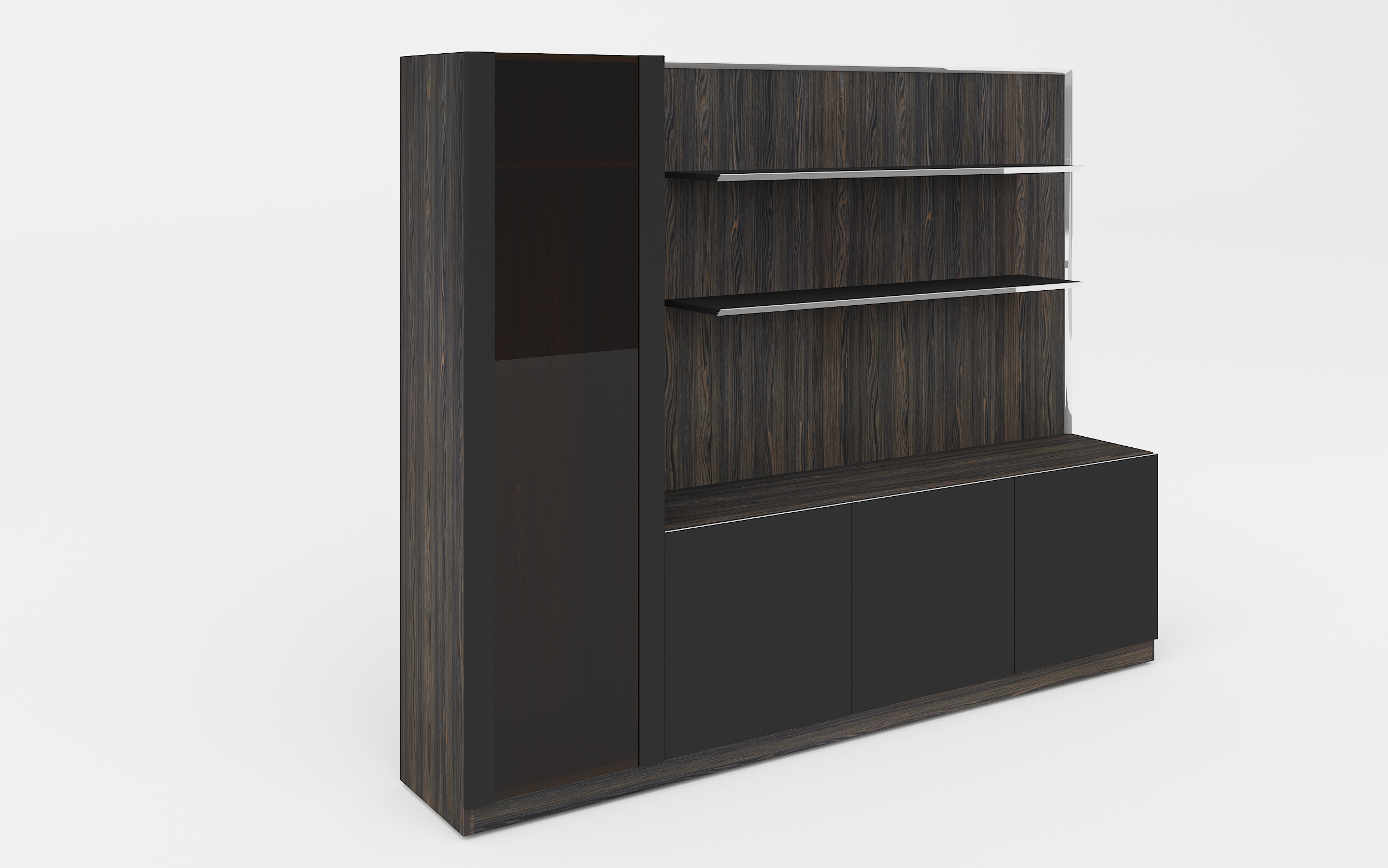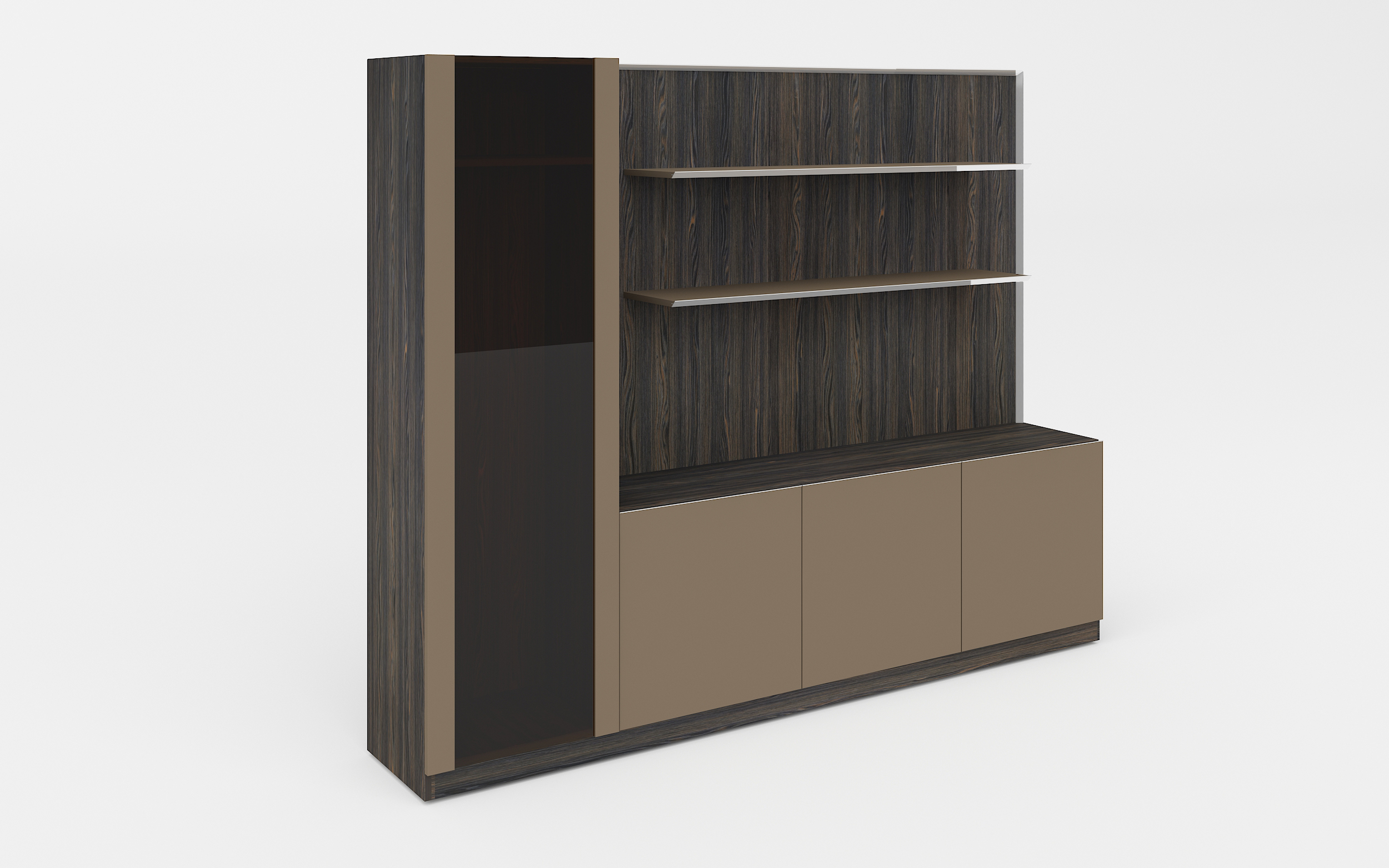 2、掩门高柜配伸缩挂衣杆,单木门板为隐藏铝边拉手,空格柜侧板和层板前面为铝装饰边。