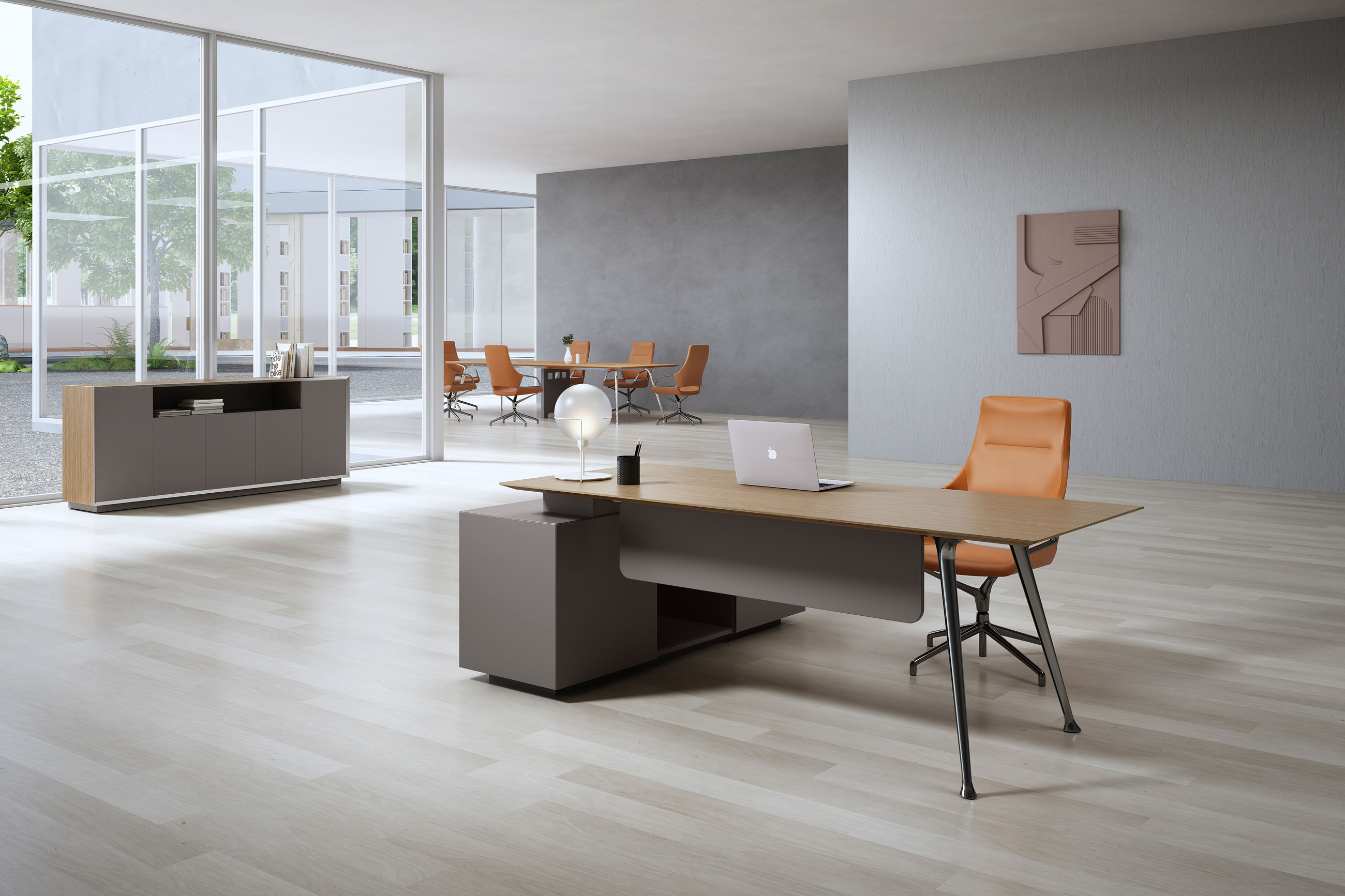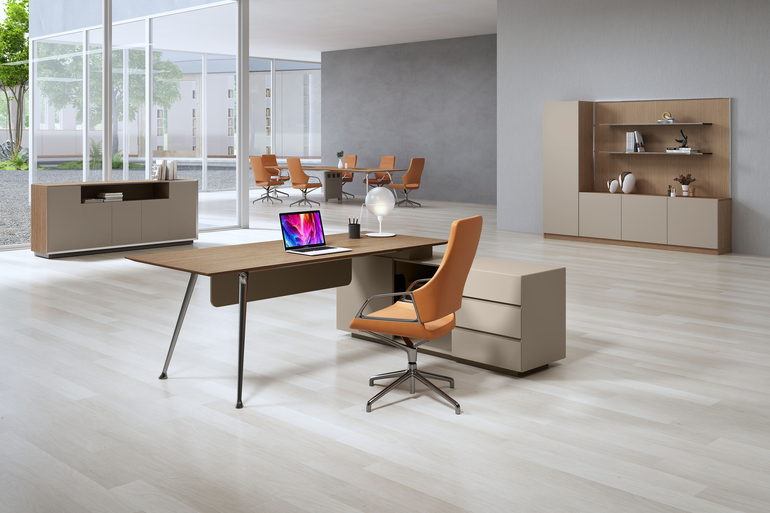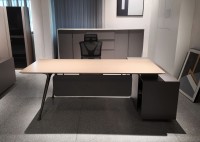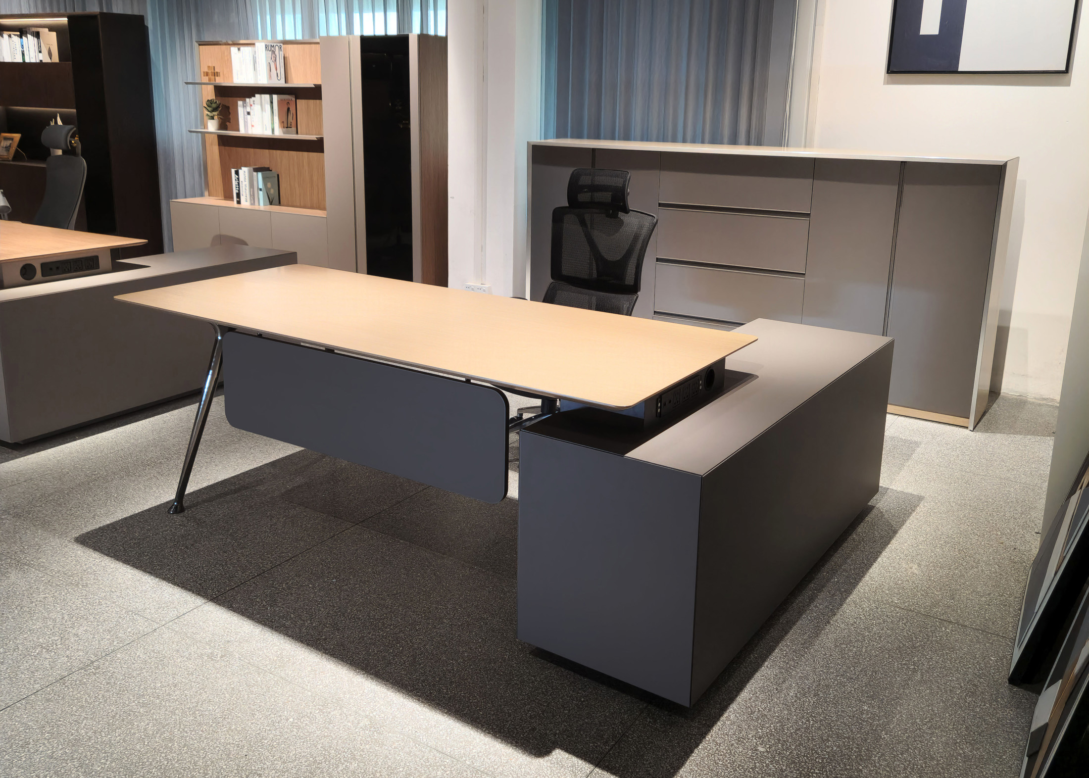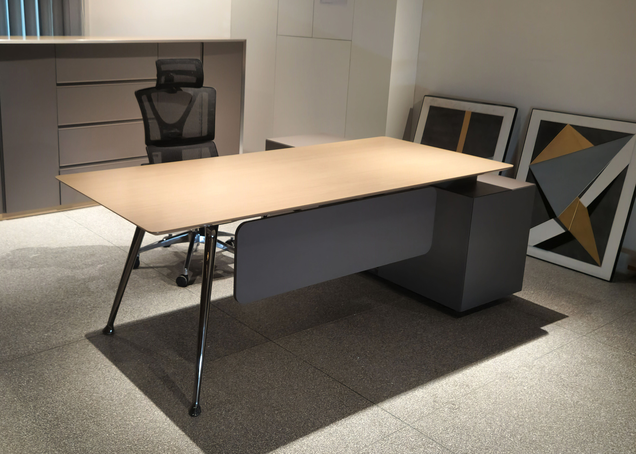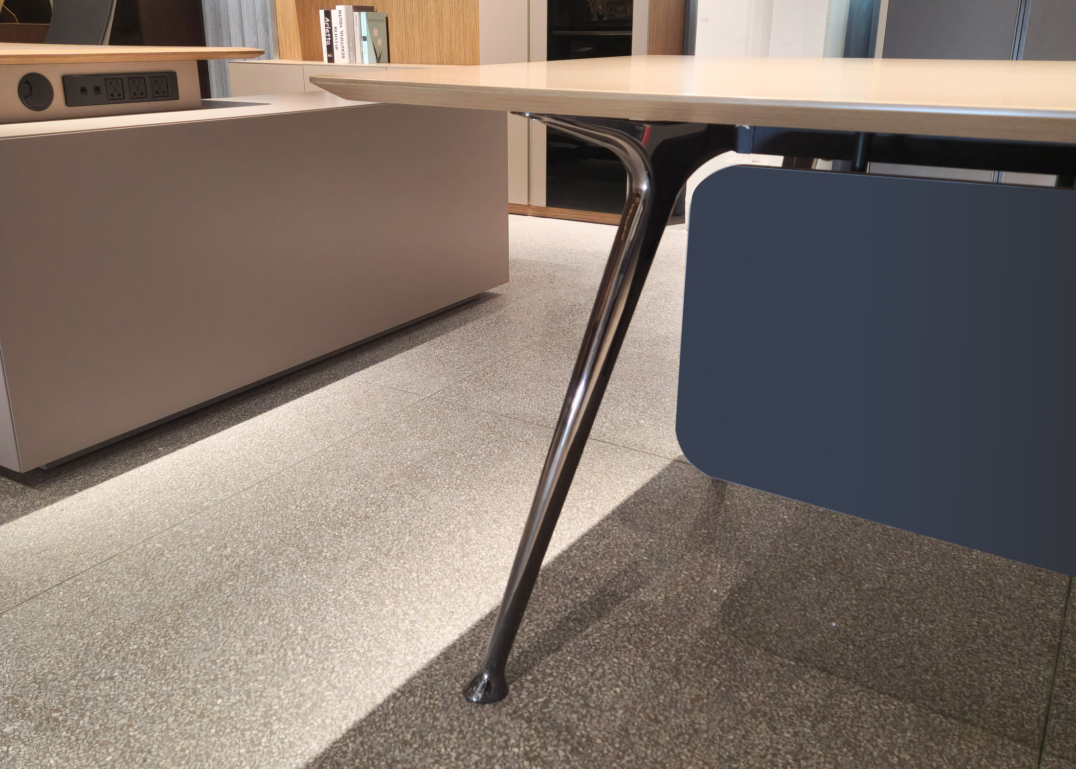 1、台面为木纹色,厚度26mm,其余为三胺板;2、电镀铸铝脚,副柜走线至地面;3、台底五金为黑色。