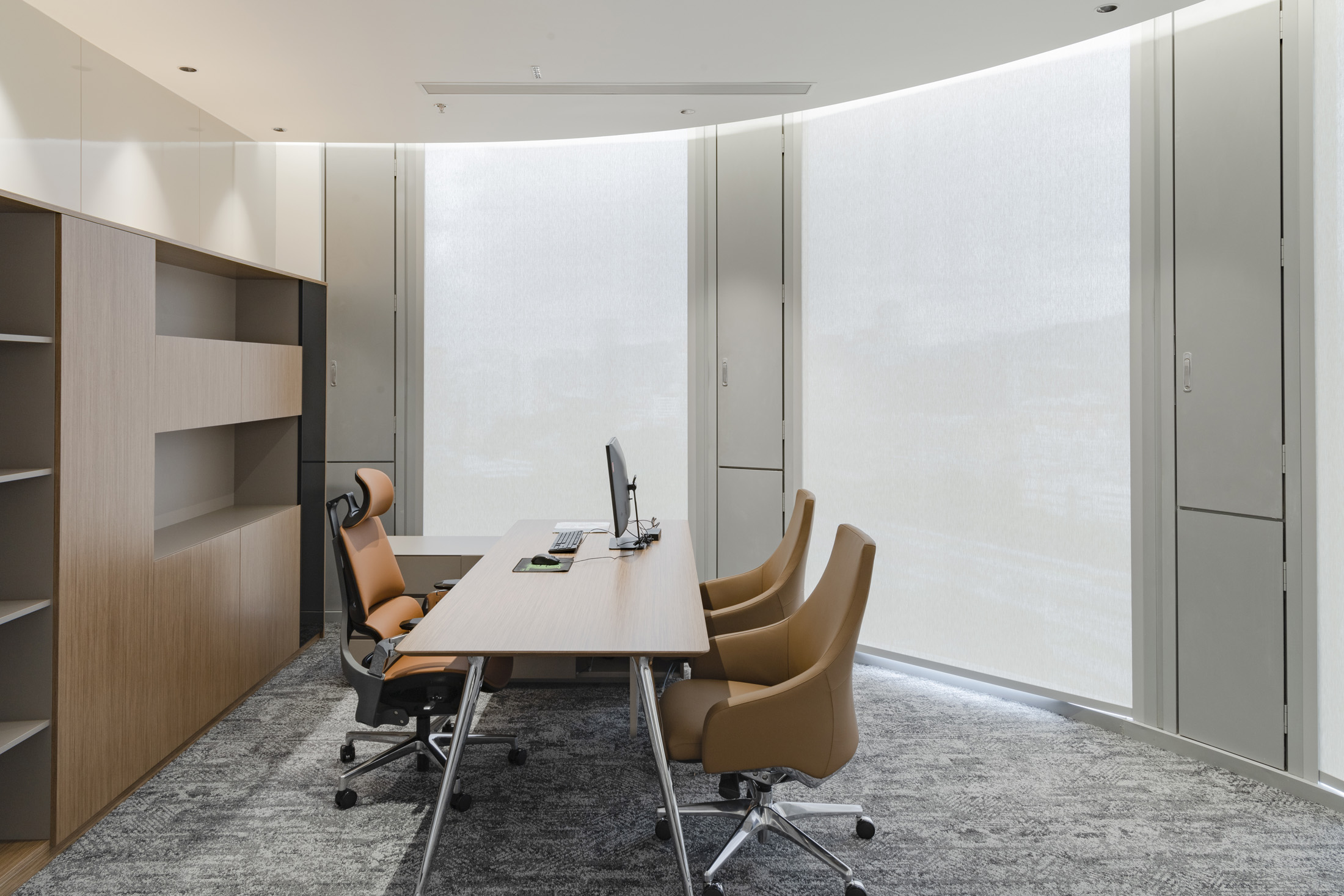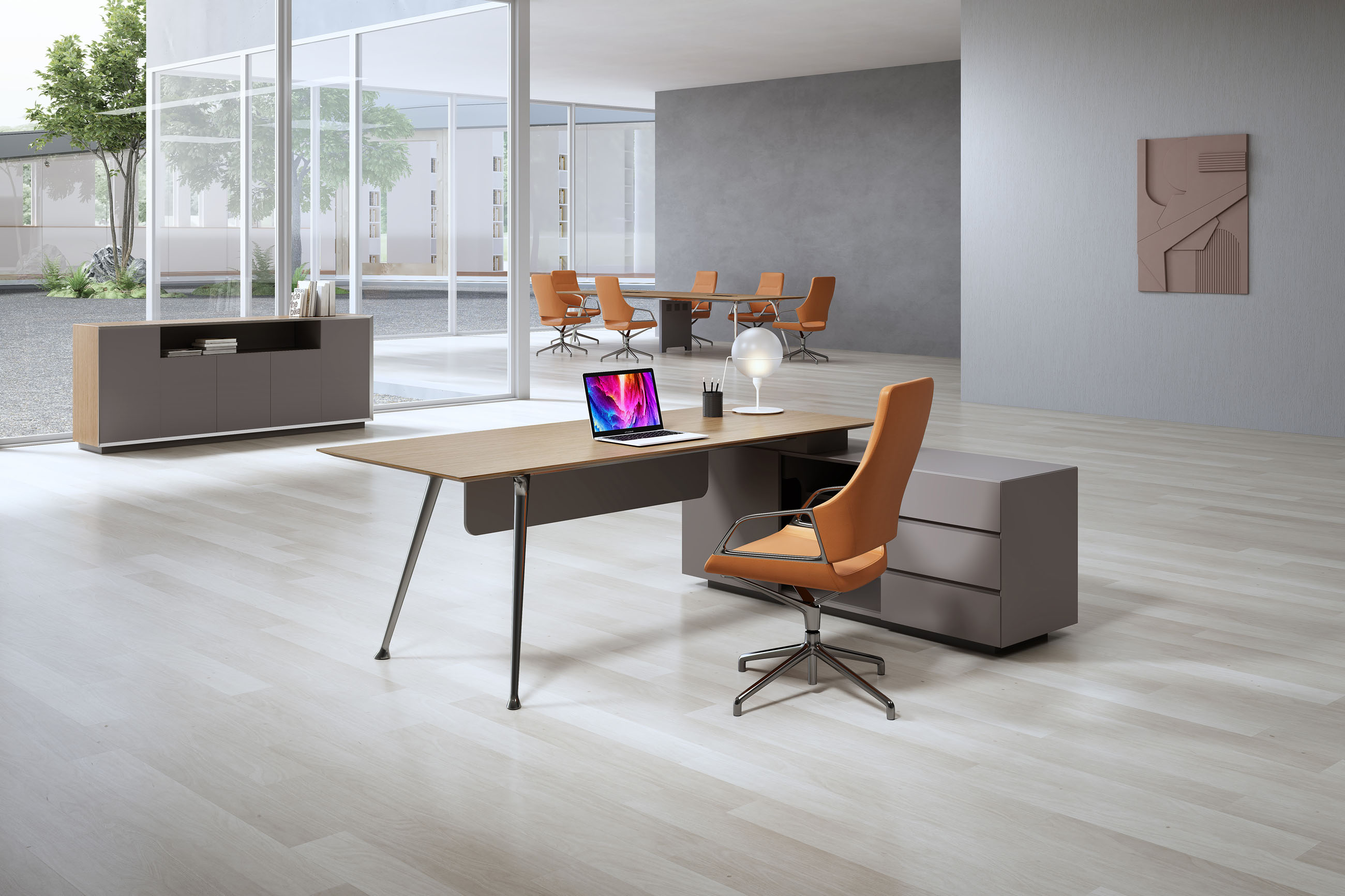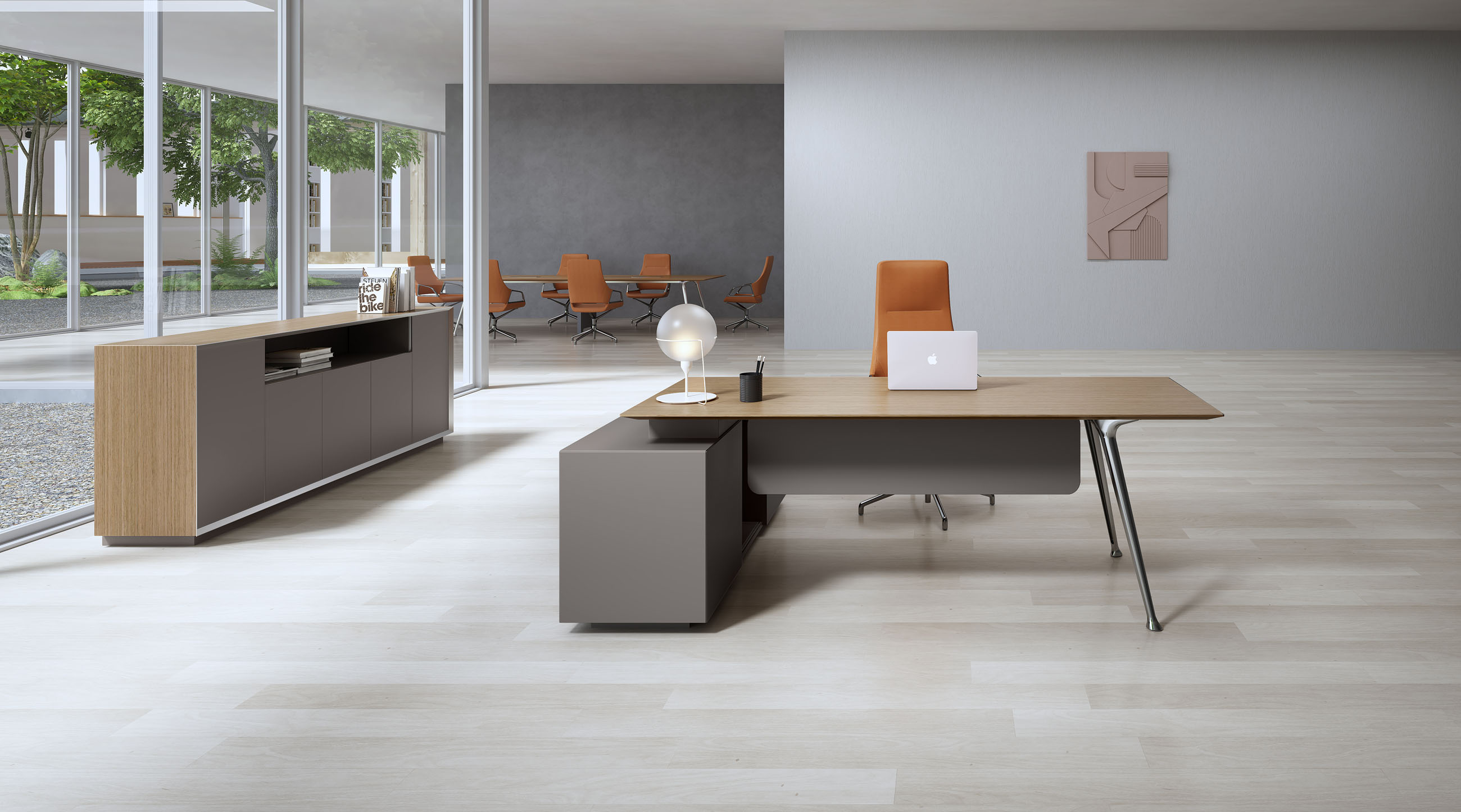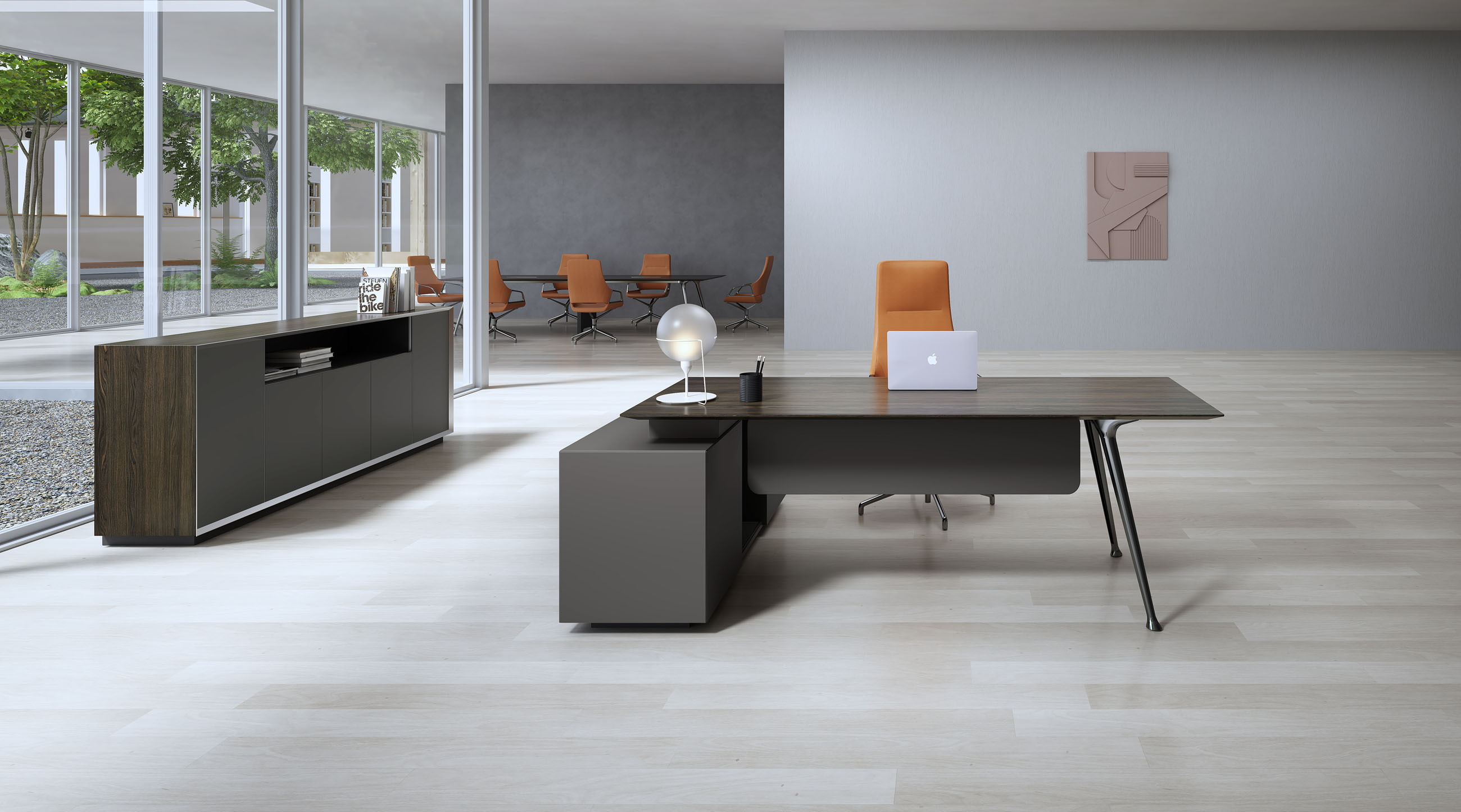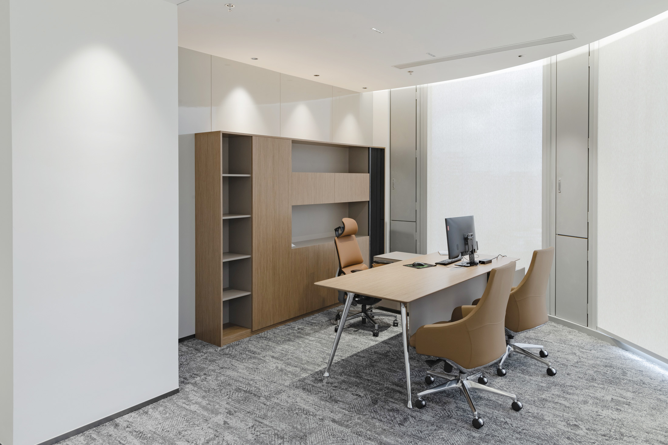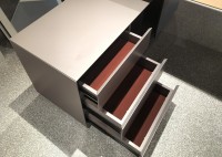 1、台面为木纹色,厚度26mm,其余为三胺板;2、电镀铸铝脚,副柜走线至地面;3、台底五金为黑色。