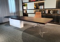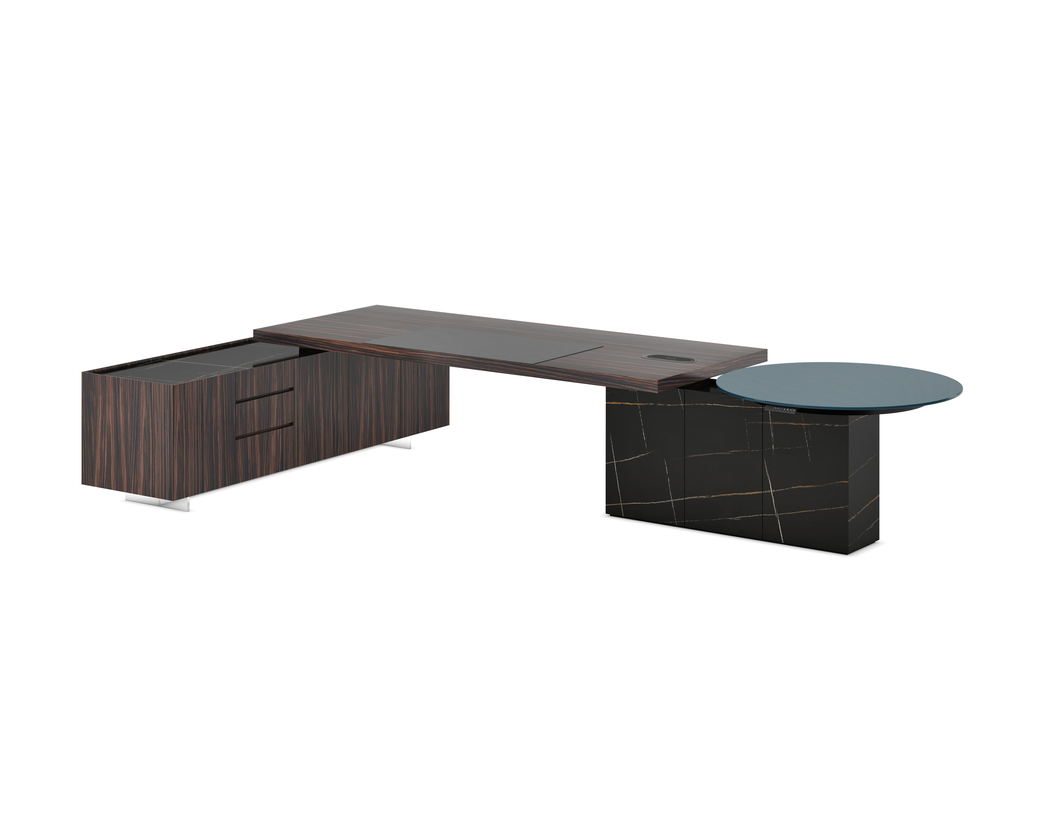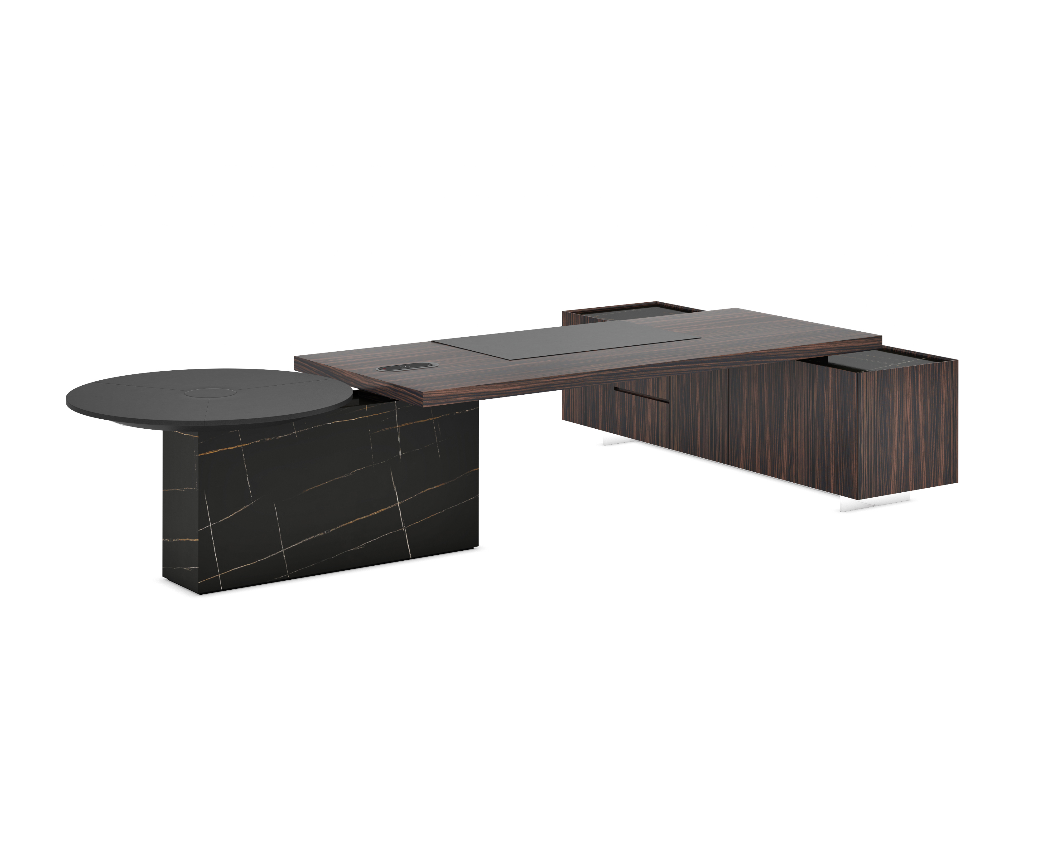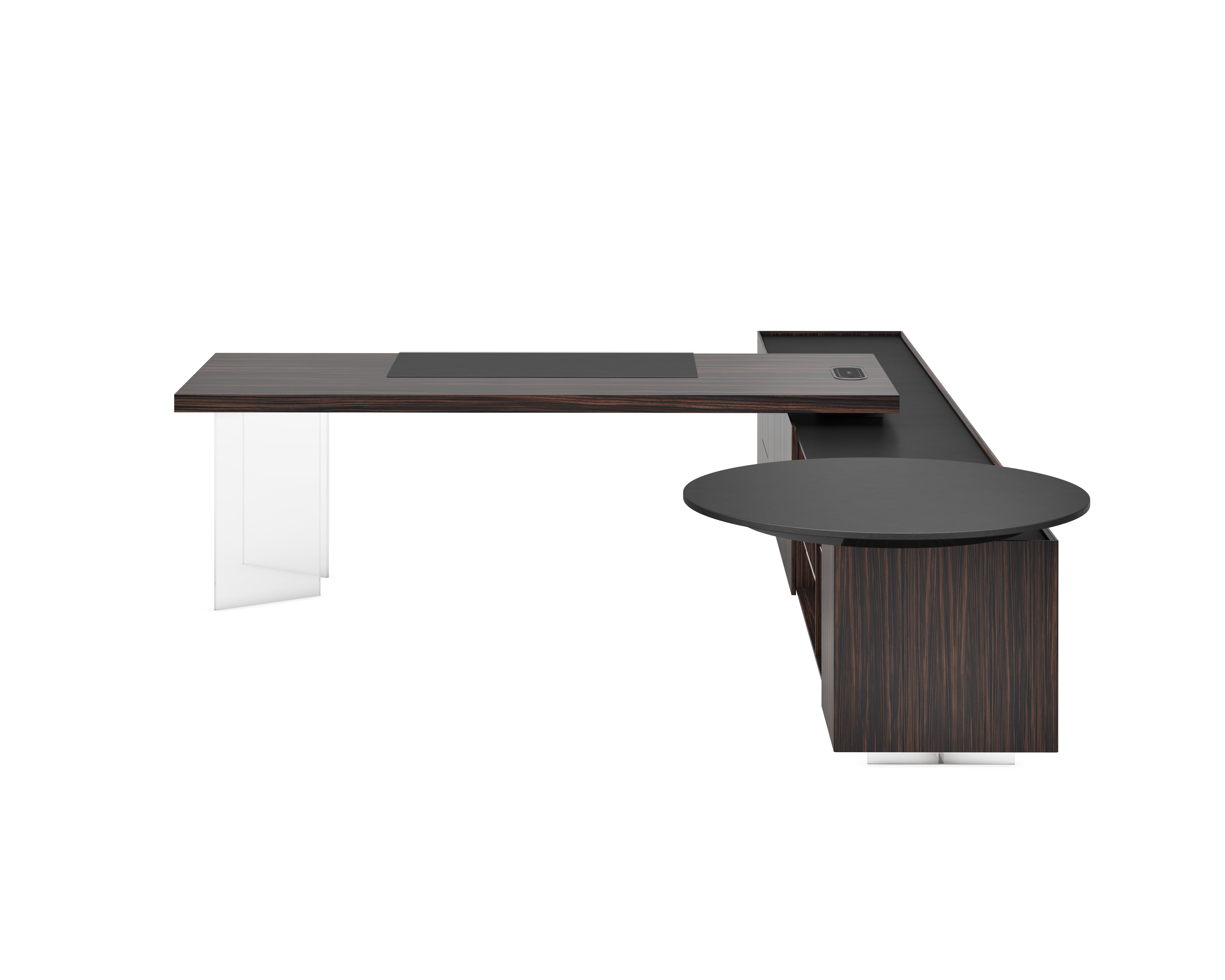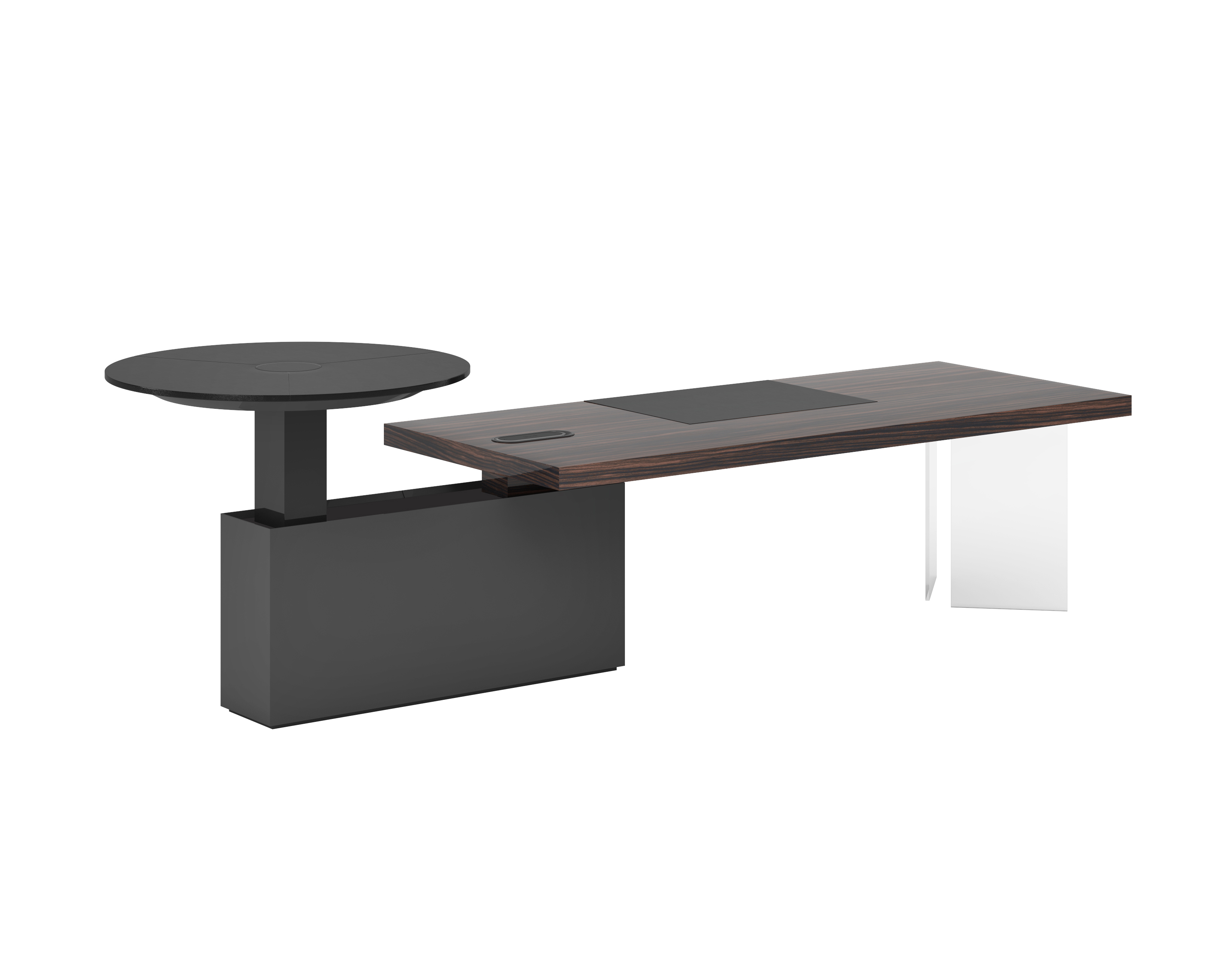 1、台面为60mm厚木纹色,配超级电源、活动皮垫;2、圆台台面扪皮15mm,大立柱升降器;3、超白亚克力脚支撑脚,副柜为木纹色,柜面为岩板,脚箱为岩板 / 实色漆。