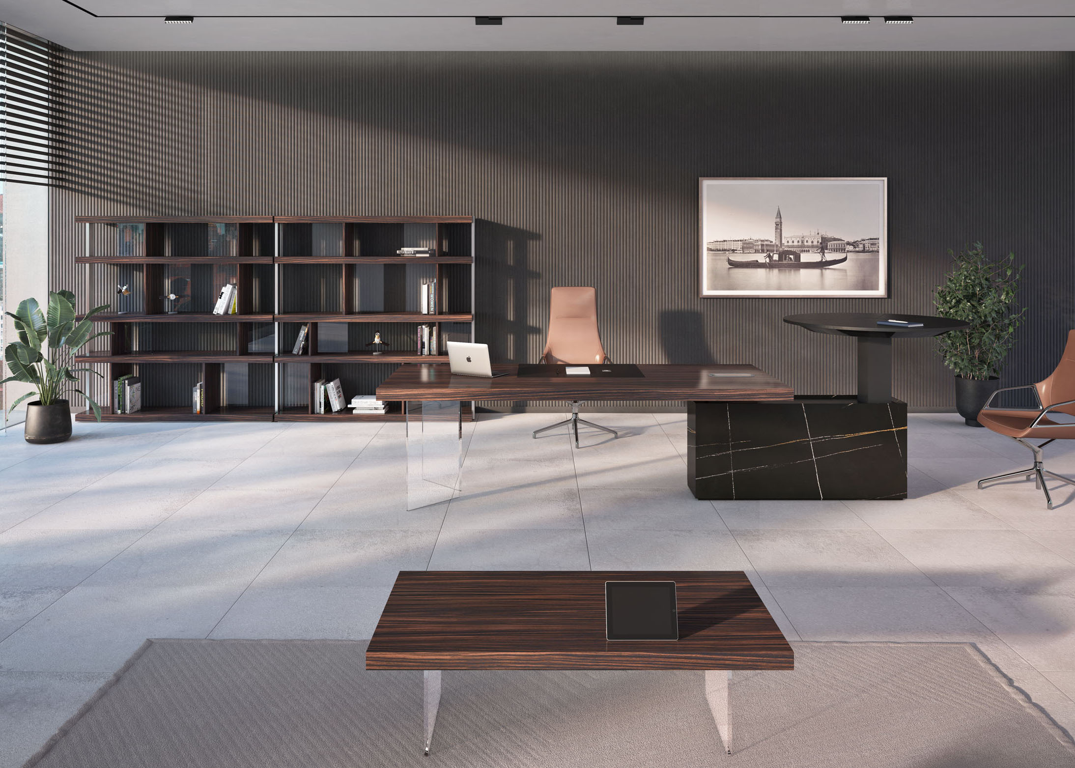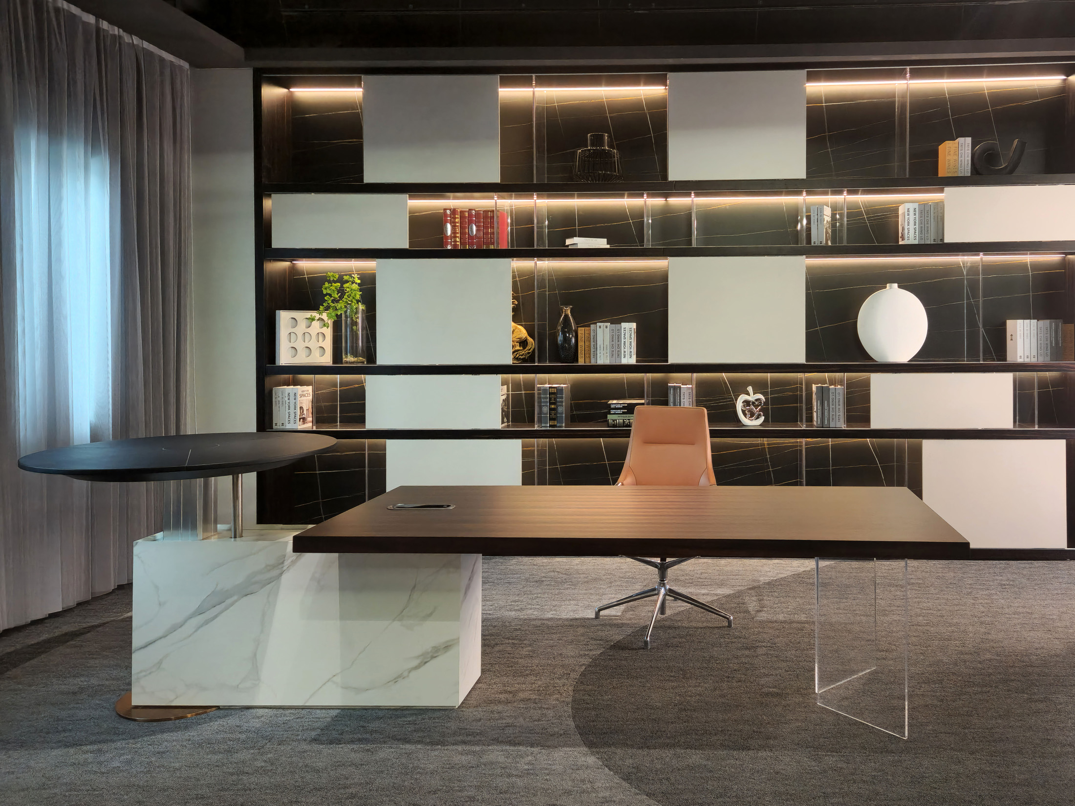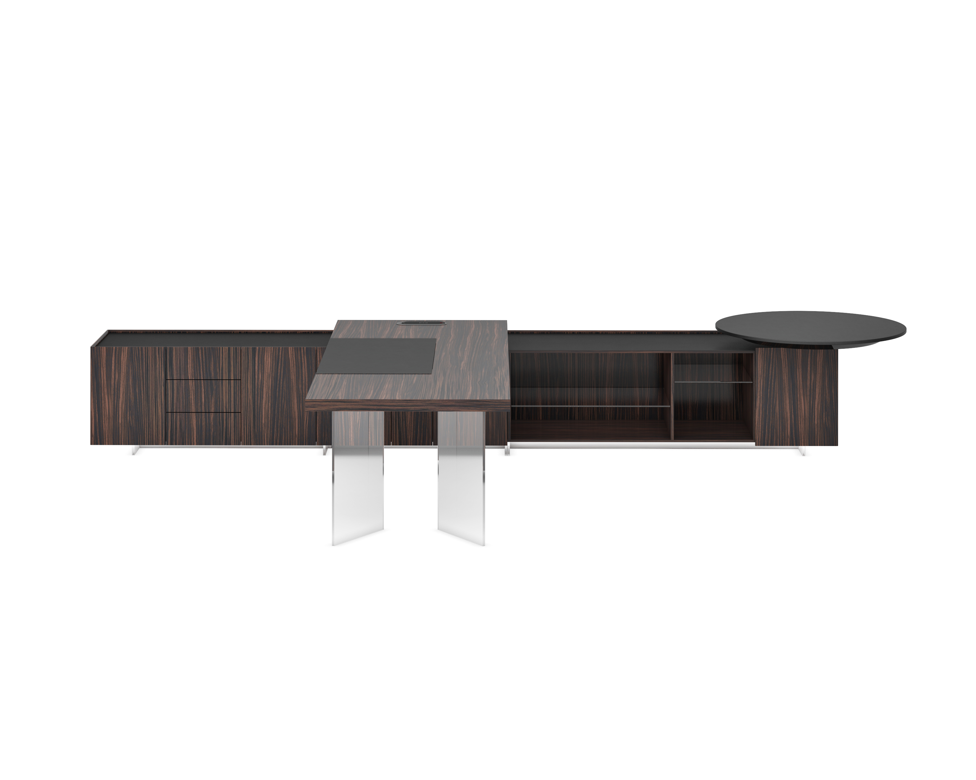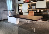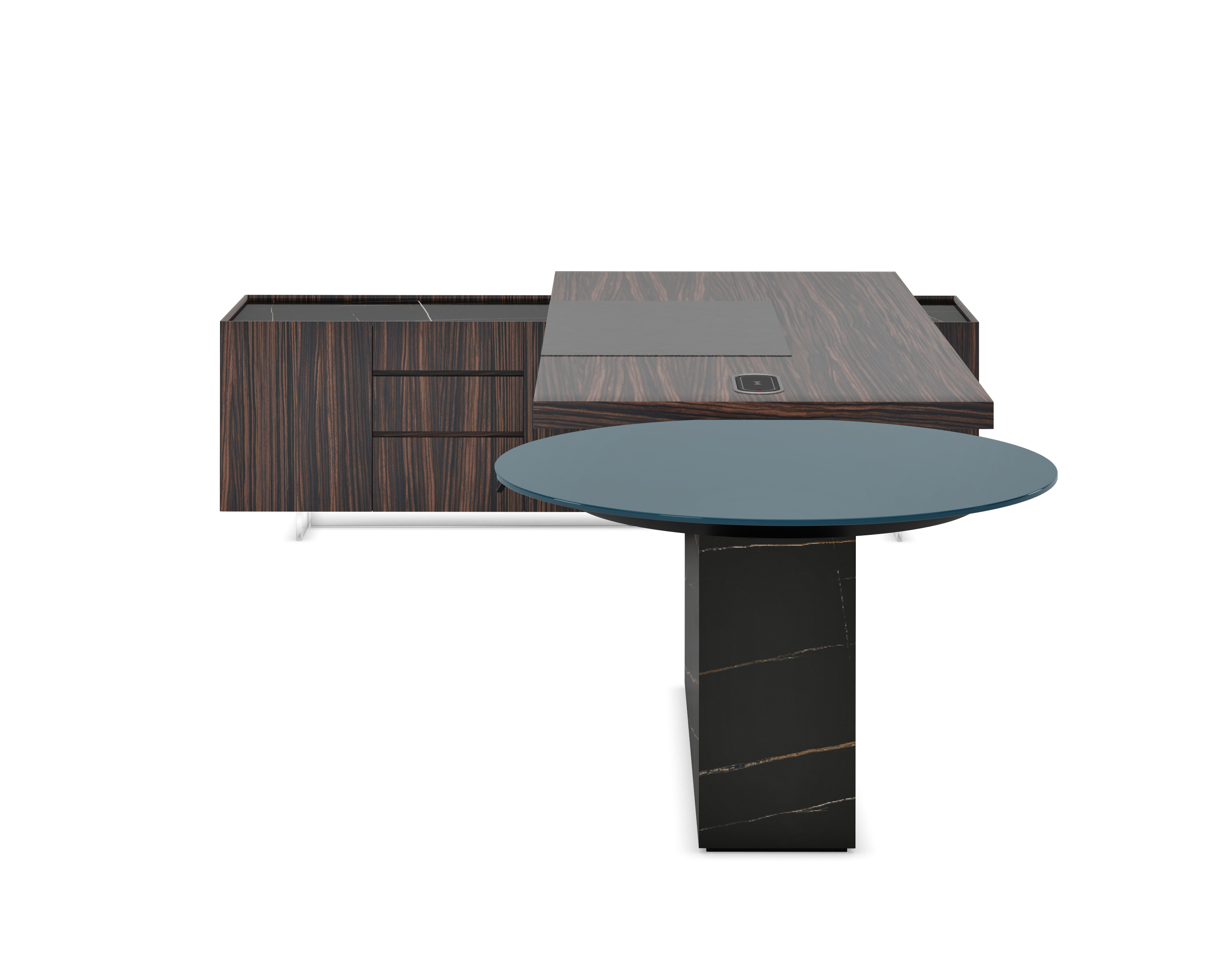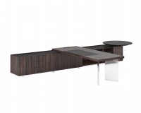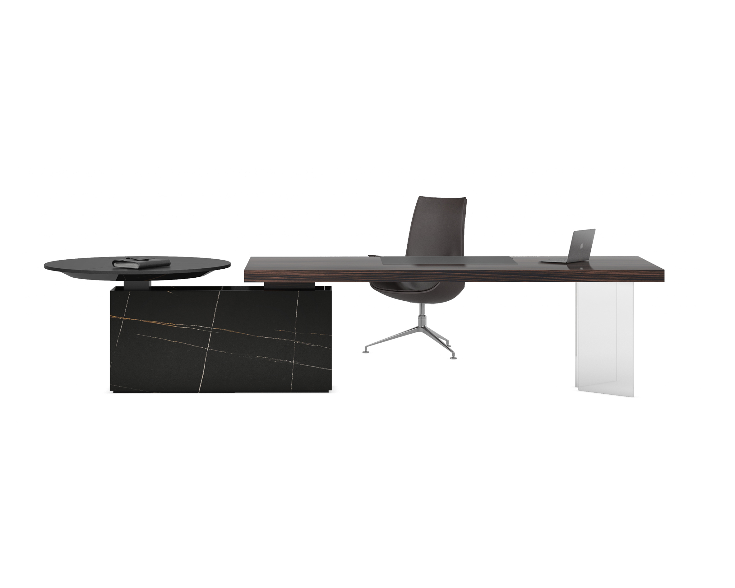 1、台面为60mm厚木纹色,配超级电源、活动皮垫;2、圆台台面扪皮15mm,大立柱升降器;3、超白亚克力脚支撑脚,副柜为木纹色,柜面为岩板,脚箱为岩板 / 实色漆。