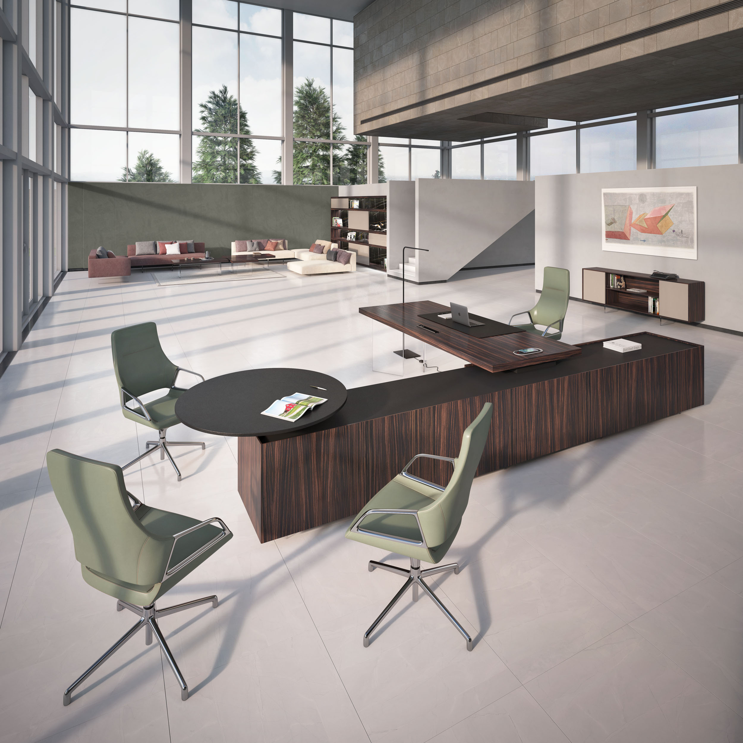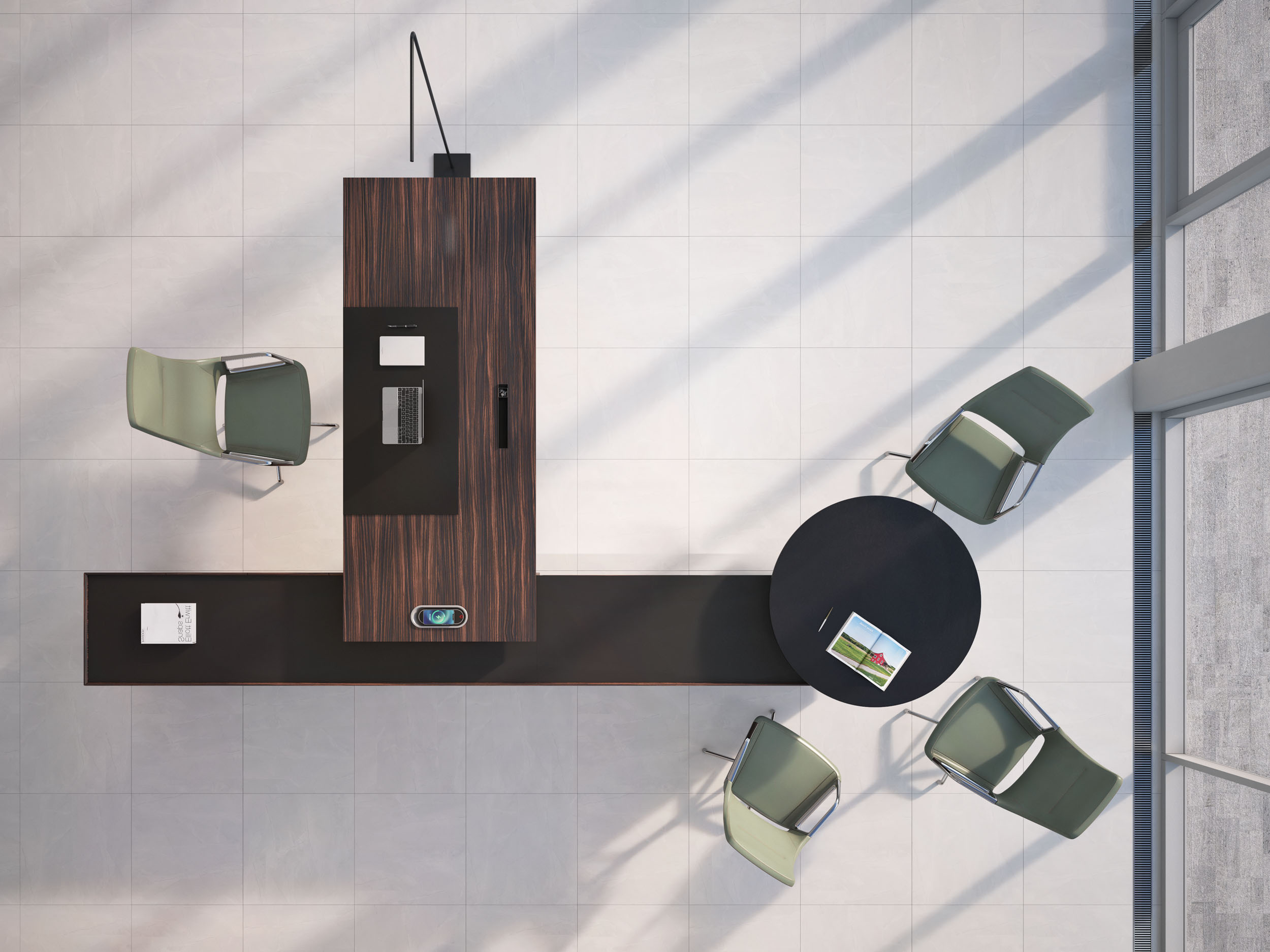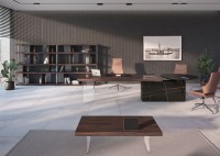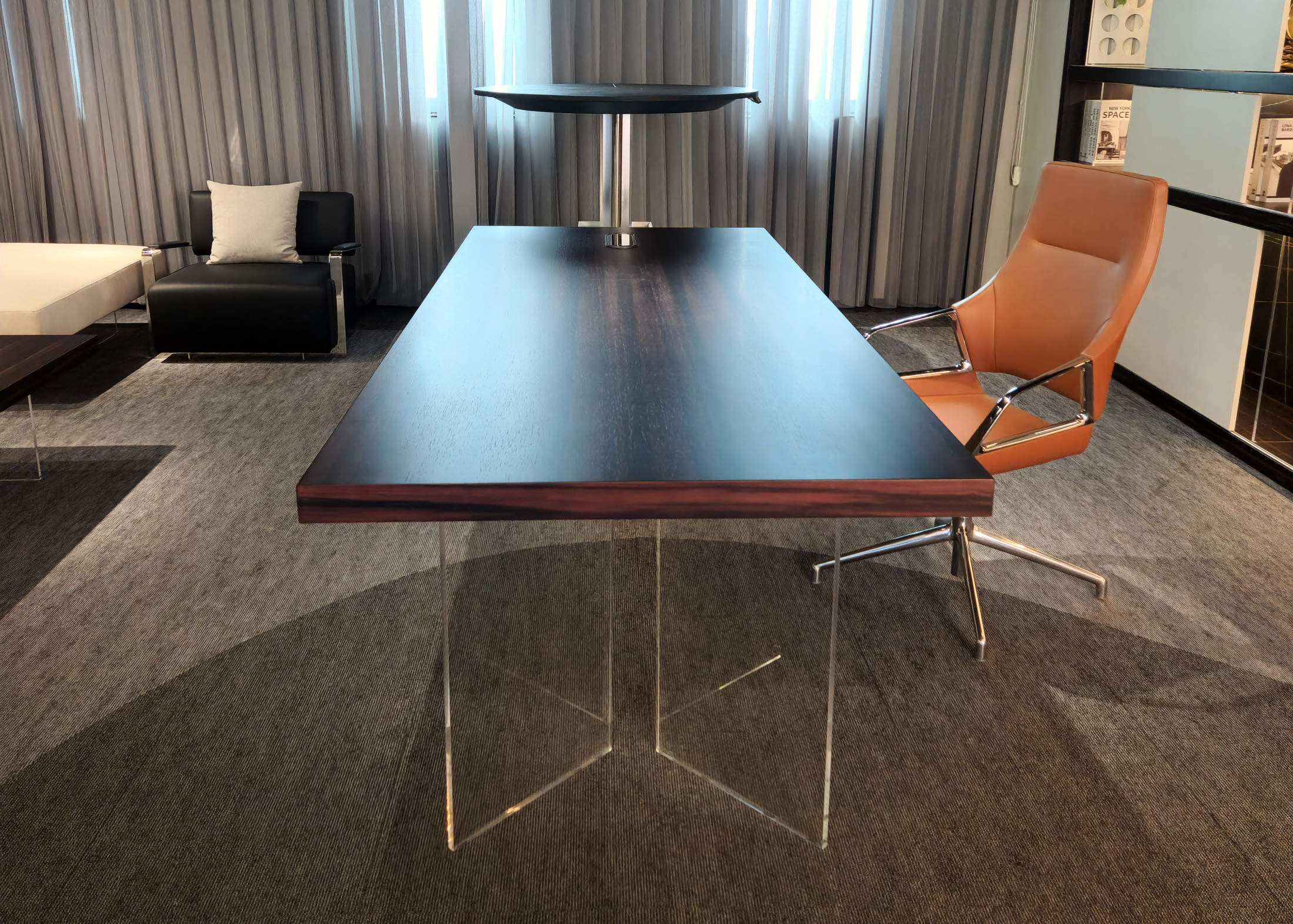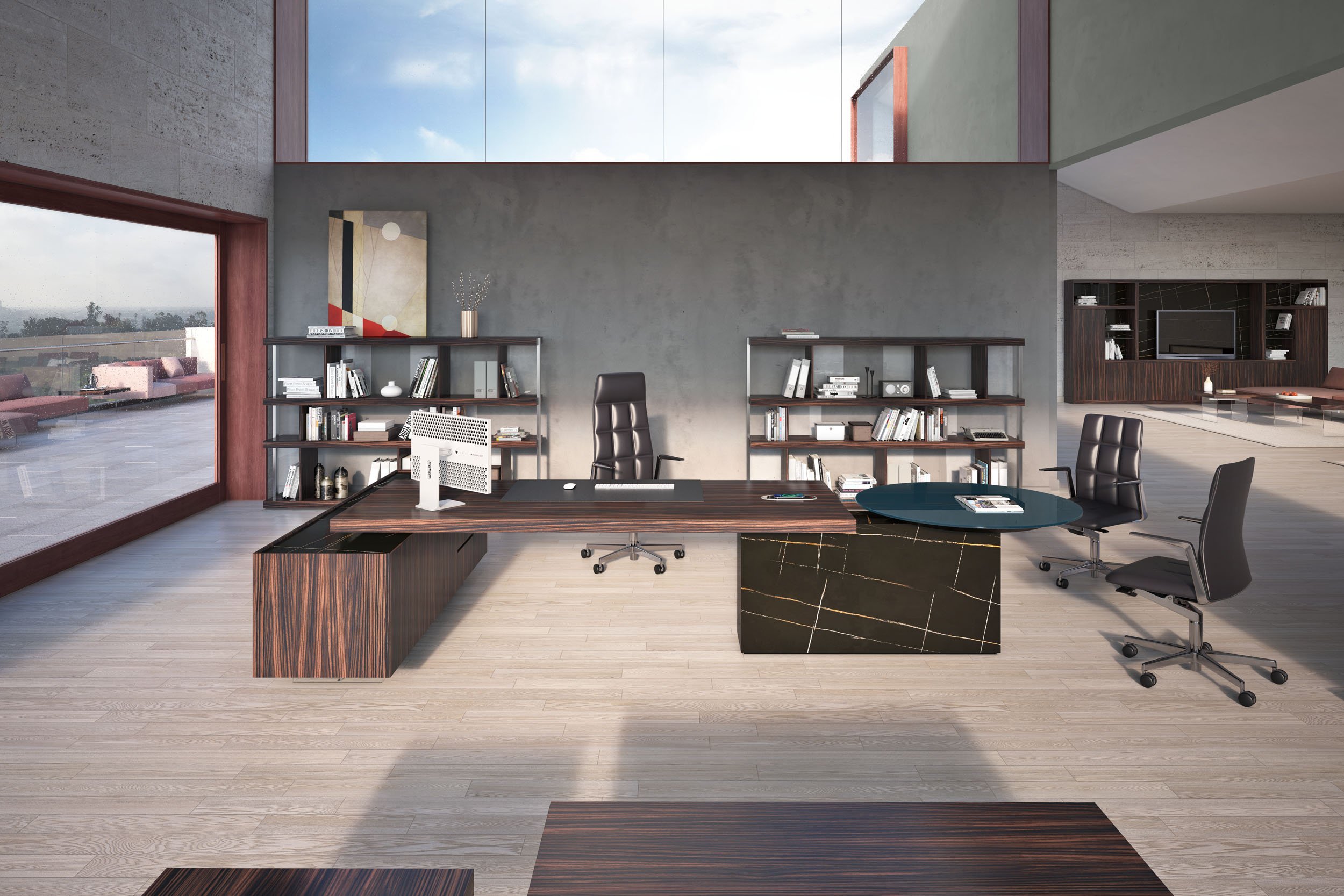 1、台面为60mm厚木纹色,配超级电源、活动皮垫;2、圆台台面扪皮15mm,大立柱升降器;3、超白亚克力脚支撑脚,副柜为木纹色,柜面为岩板,脚箱为岩板 / 实色漆。
