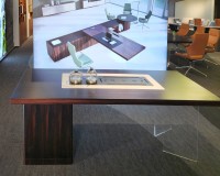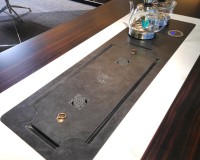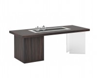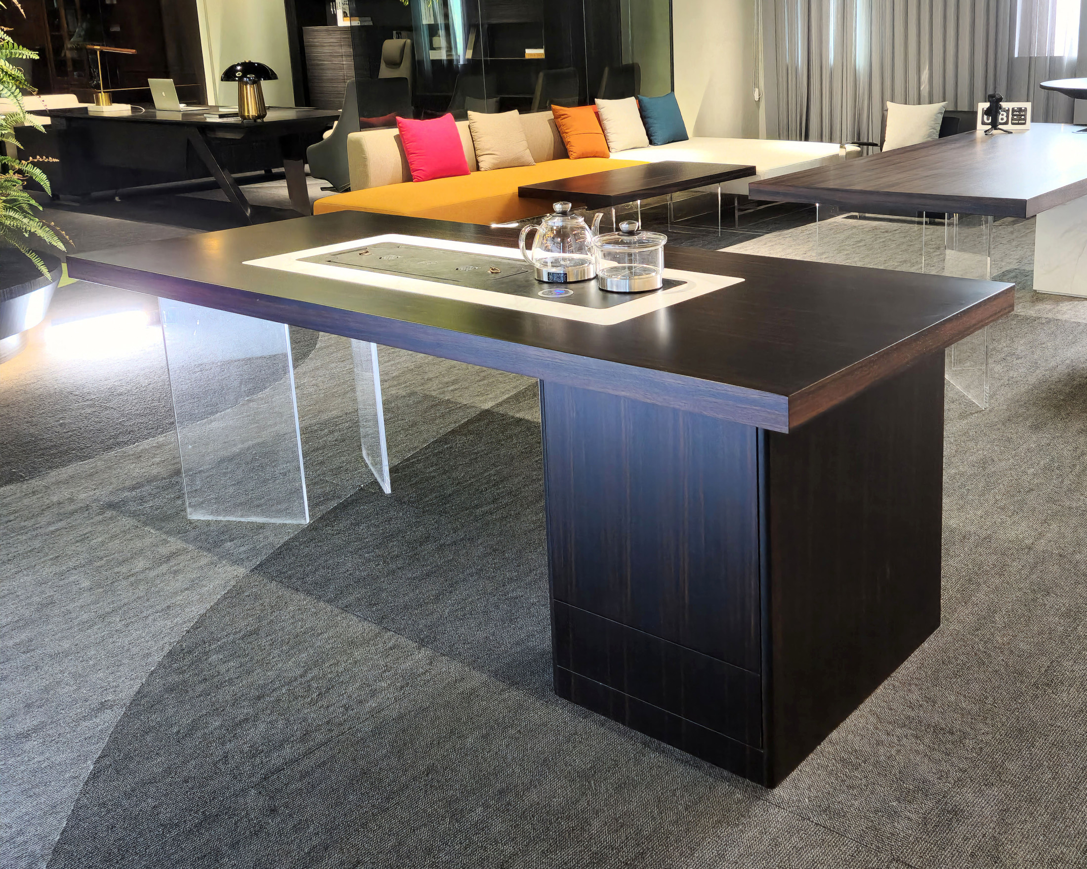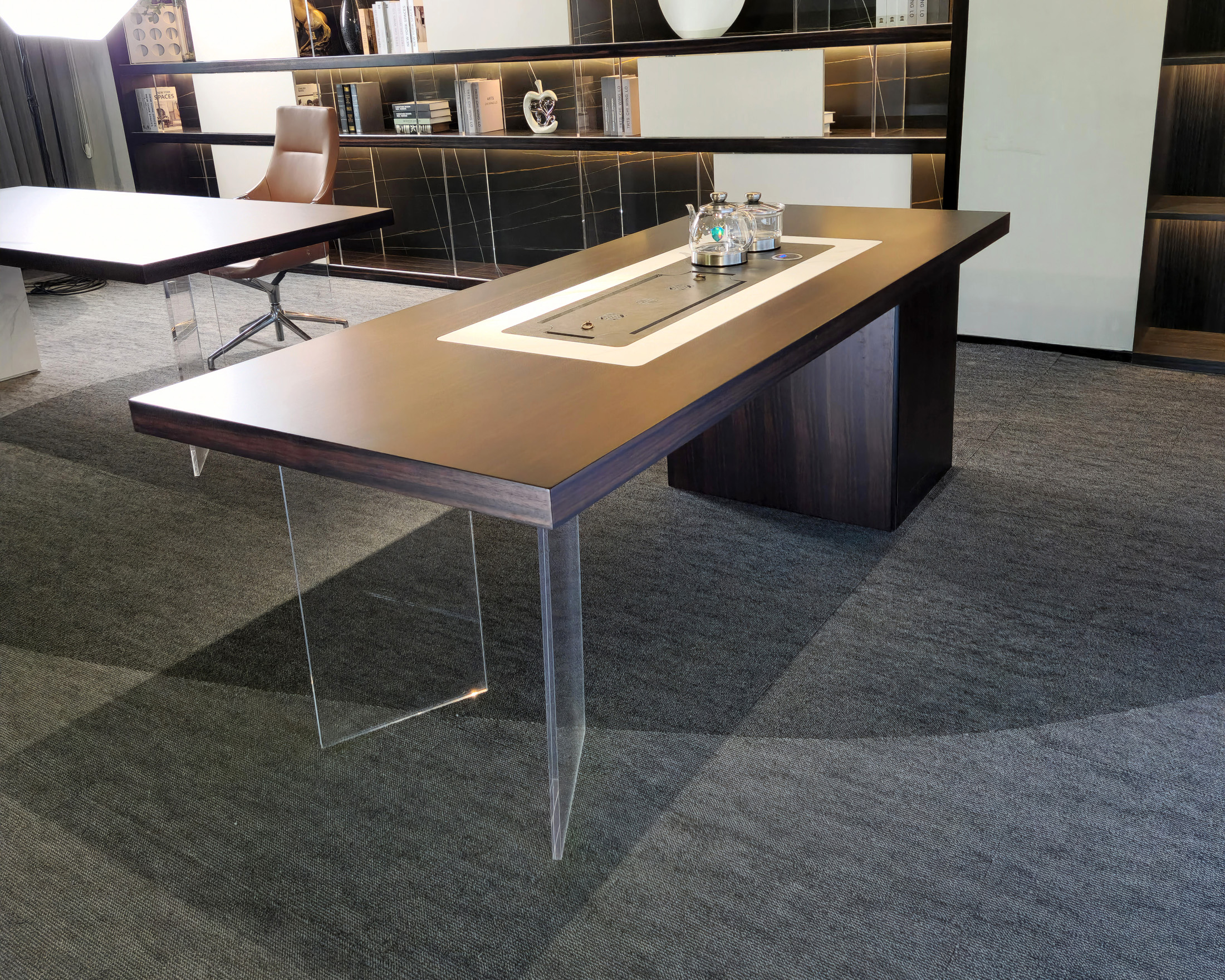 1、台面厚60mm,台面、脚箱为木纹色;2、超白亚克力脚;3、岩板茶盘(配电子炉和水壶,无线充),柜子内配一个插座(3强电,2USB),虹吸式上水系统。