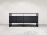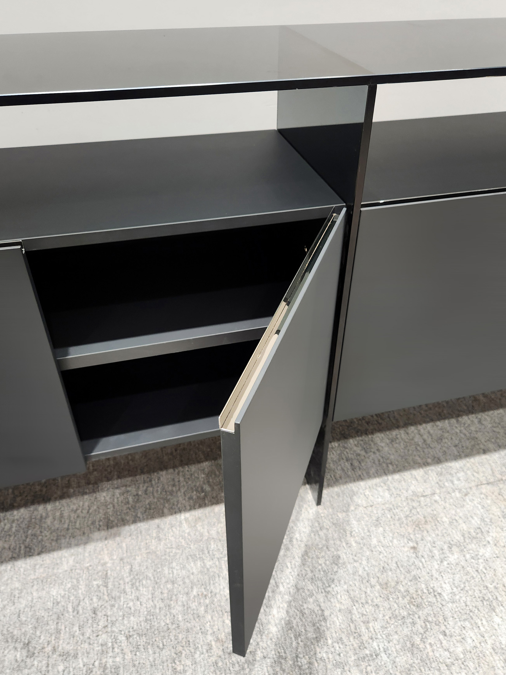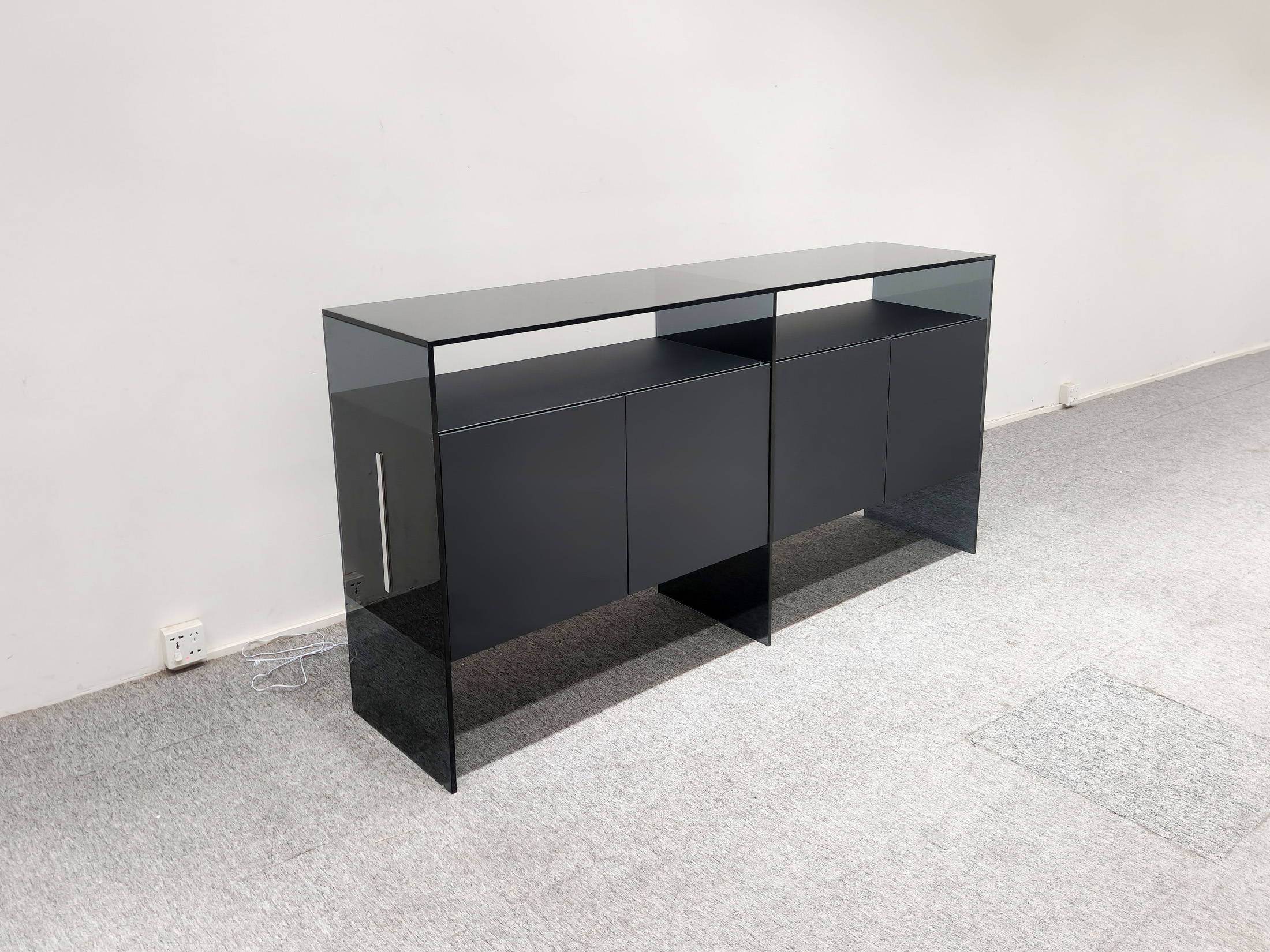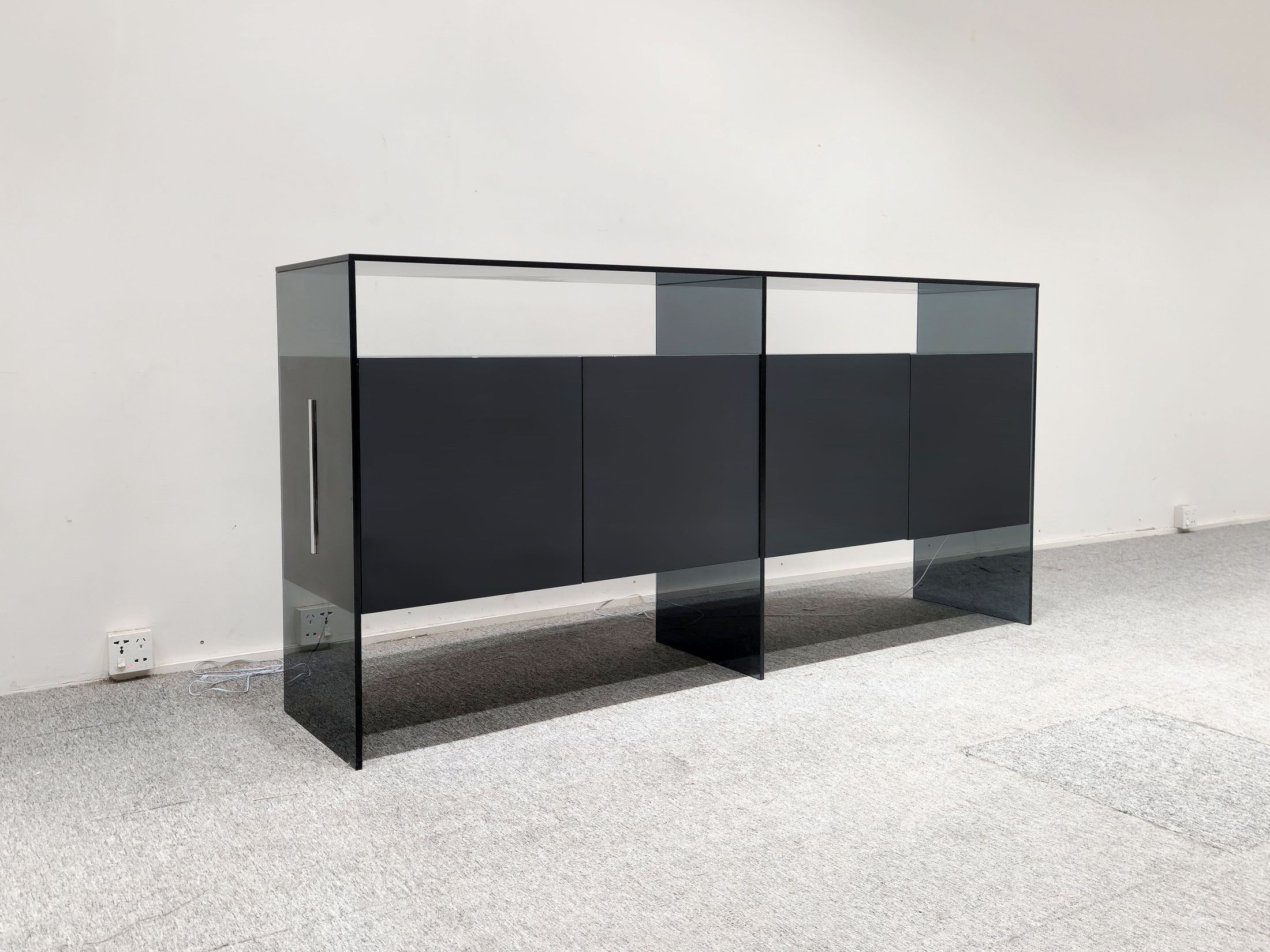1、柜面、两侧面、中间支撑脚为12厘半透明钢化灰玻;
