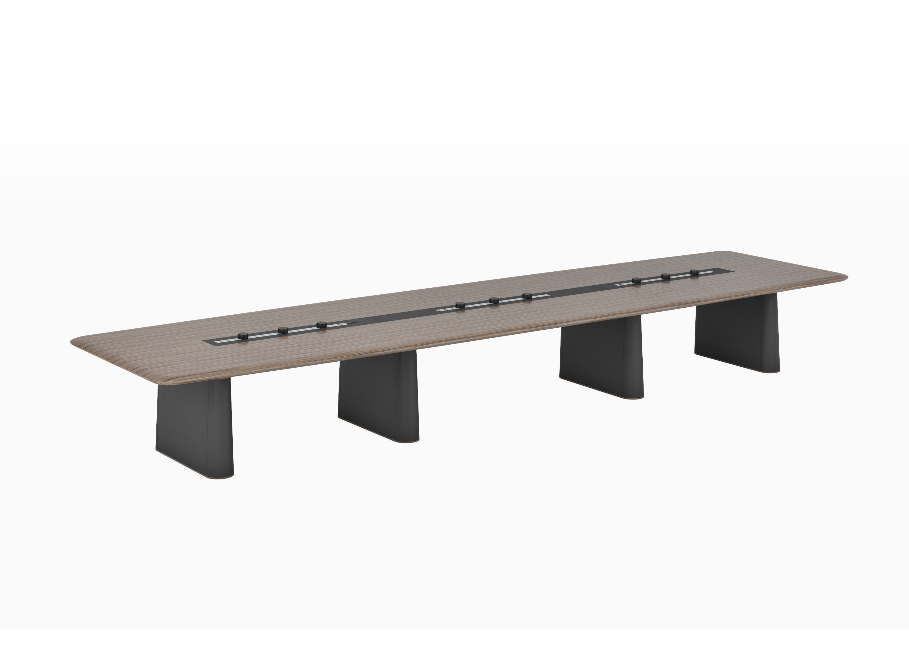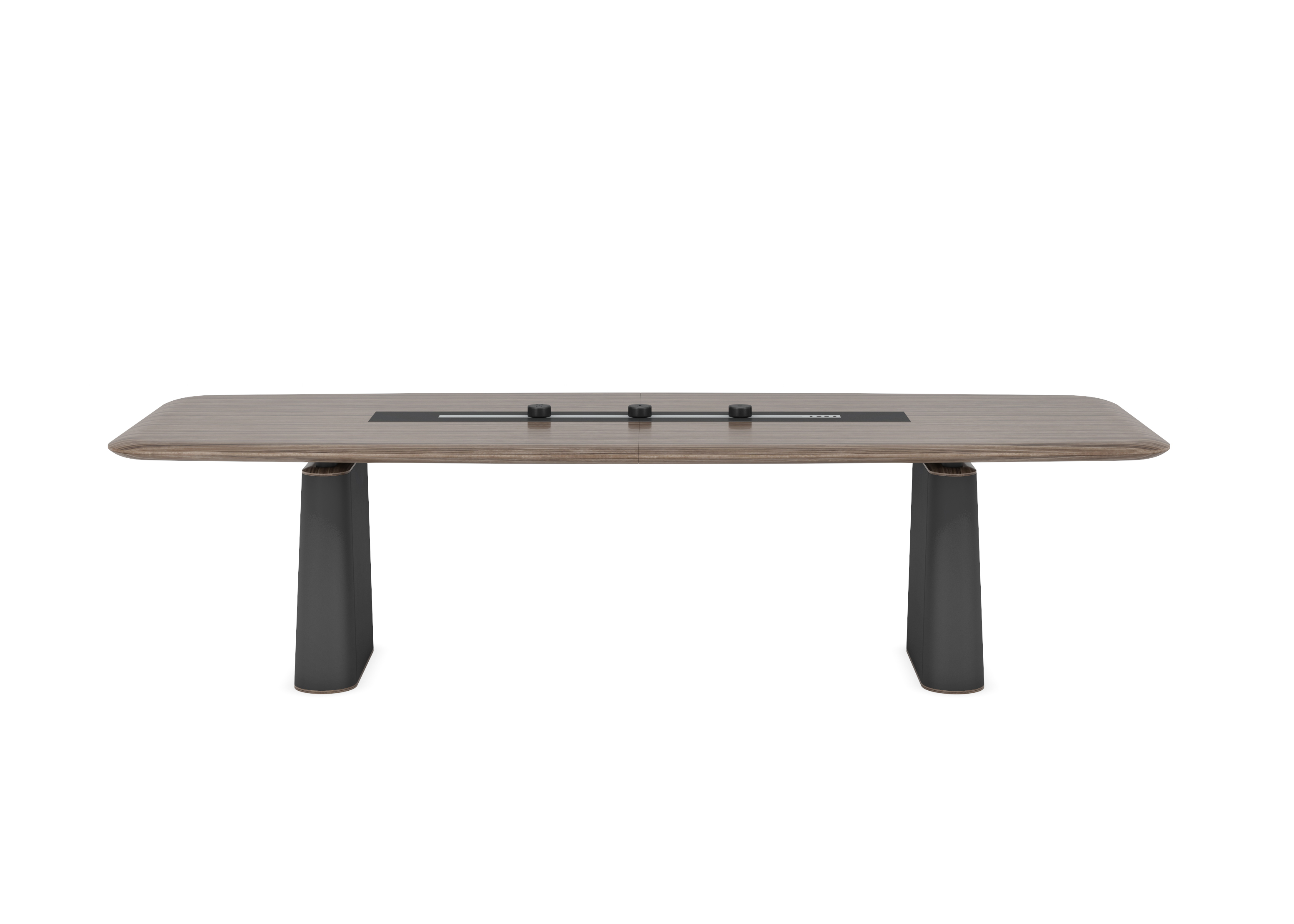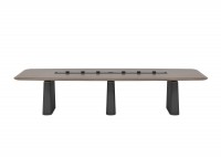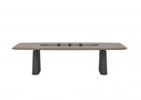 1、台面52mm厚,配电力路轨。2、锥形台脚支撑(台脚上线)。3、台面木皮+实色漆。4、台脚顶,底板木皮,其余实色漆。5、主要基材刨花板和中纤板。