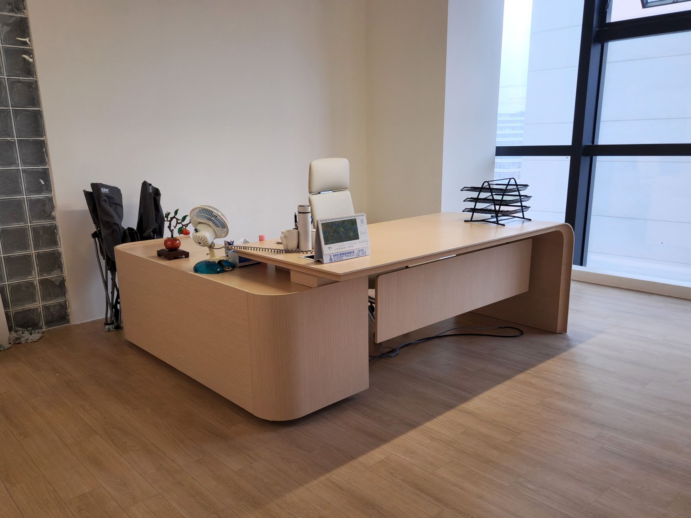 1、主台50mm厚木皮油漆,配集成线盒(配置为2强电+Type (A+C)+电话+网络+高清)黑色/银色可选;2、副柜木皮油漆,抽屉档条为三胺板,副柜配按弹式门。
