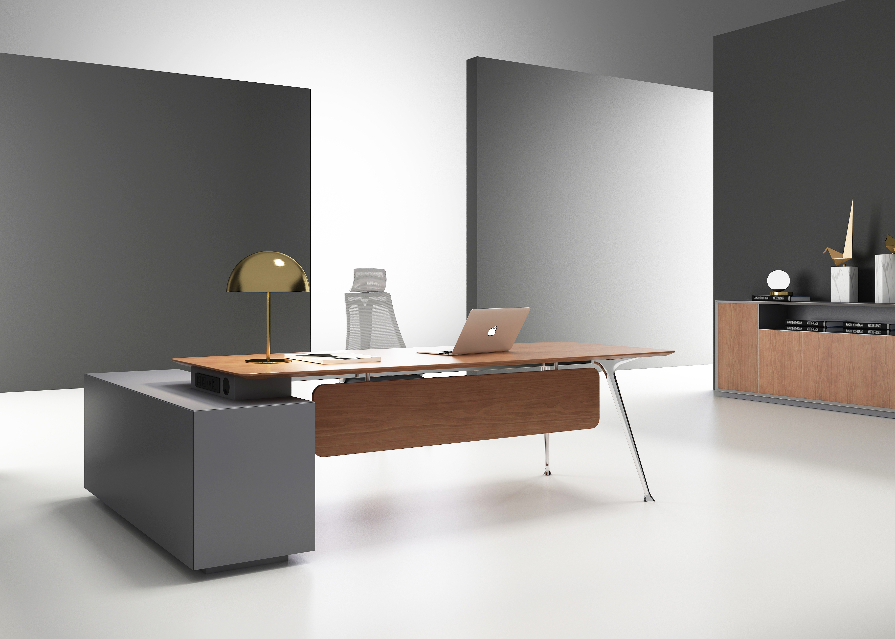 1、台面、挡板、副柜抽面、移门为木纹色,其余为三胺板;2、台底架五金为黑色, 电镀铸铝脚,副柜走线至地面。