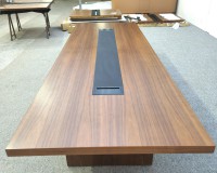 1、台面厚60mm木皮油漆,台面中间为黑色皮垫,线槽为三胺板,配2个集成插座;2、台脚为木皮油漆,台脚上线。