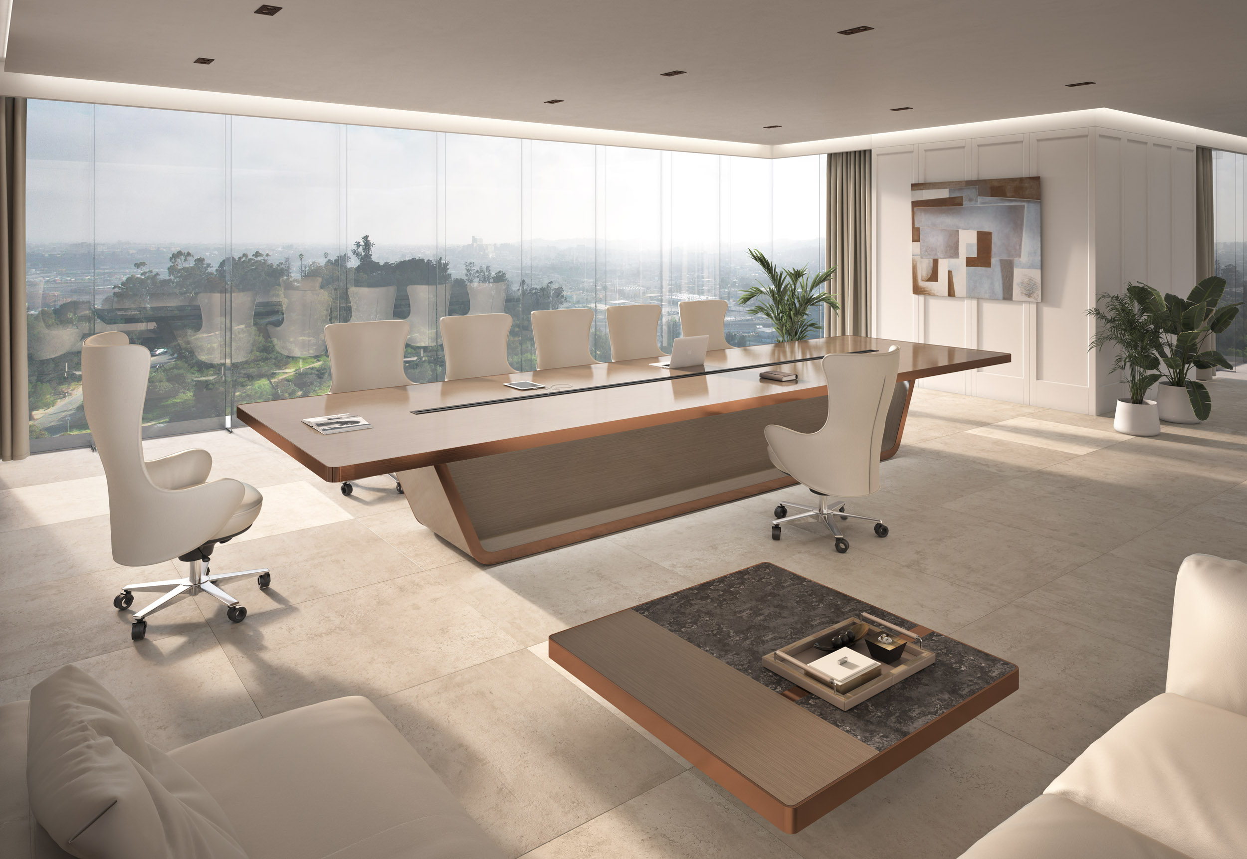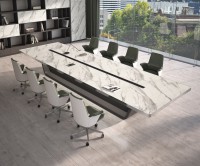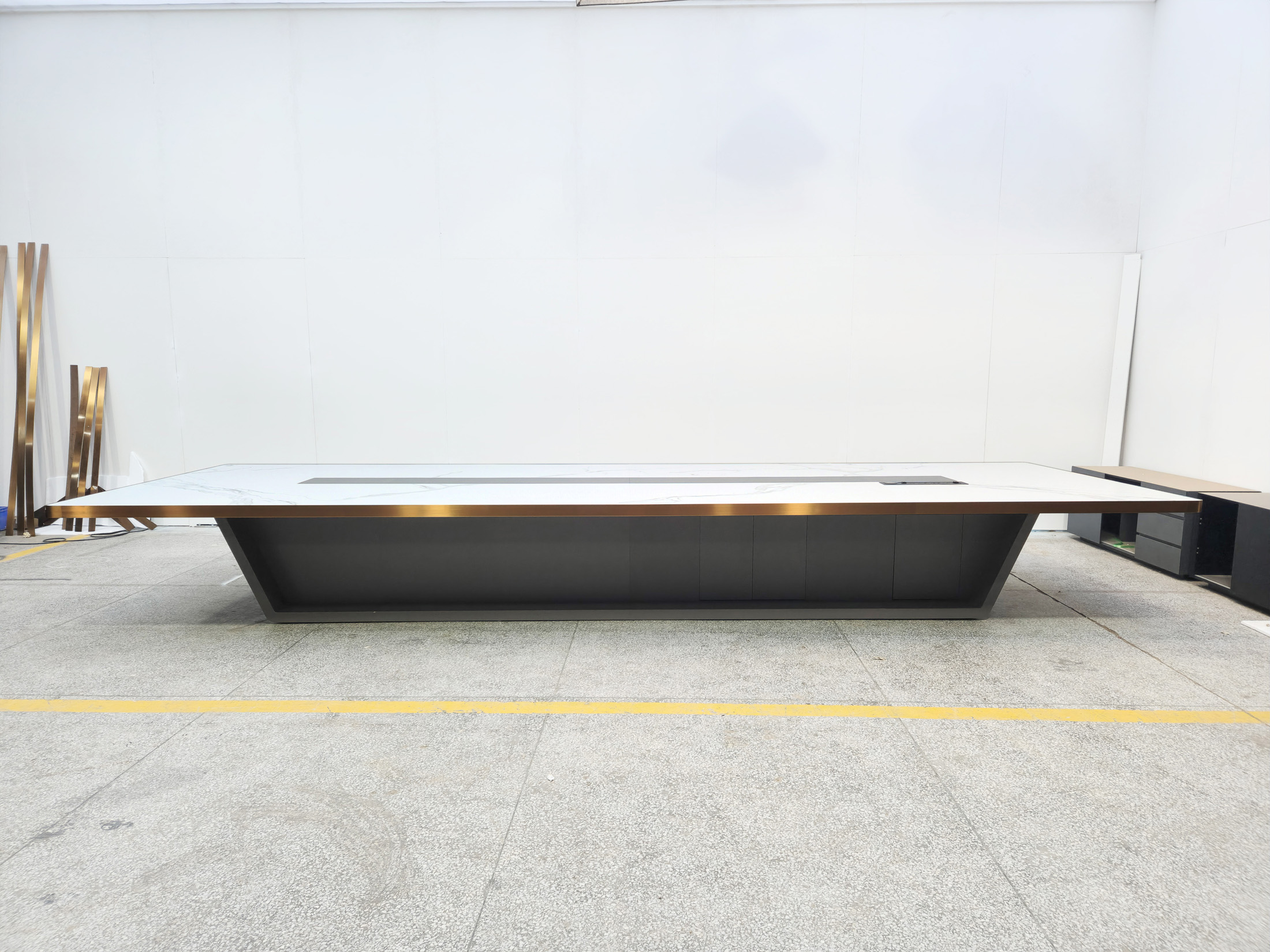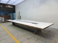 1、台面60mm厚木皮油漆,拉丝玫瑰金包边(选配),配置2条电力路轨含弱电(1USB,1电话,1网络,1高清)配4个强电插座,2、台脚木皮油漆拉丝玫瑰金包边(选配),台底LED灯带,U型台脚。