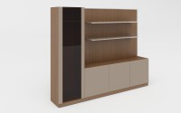 2、掩门高柜配伸缩挂衣杆,单木门板为隐藏铝边拉手,空格柜侧板和层板前面为铝装饰边。