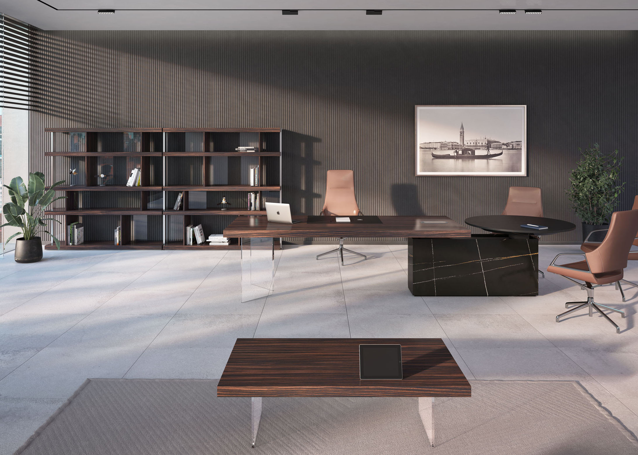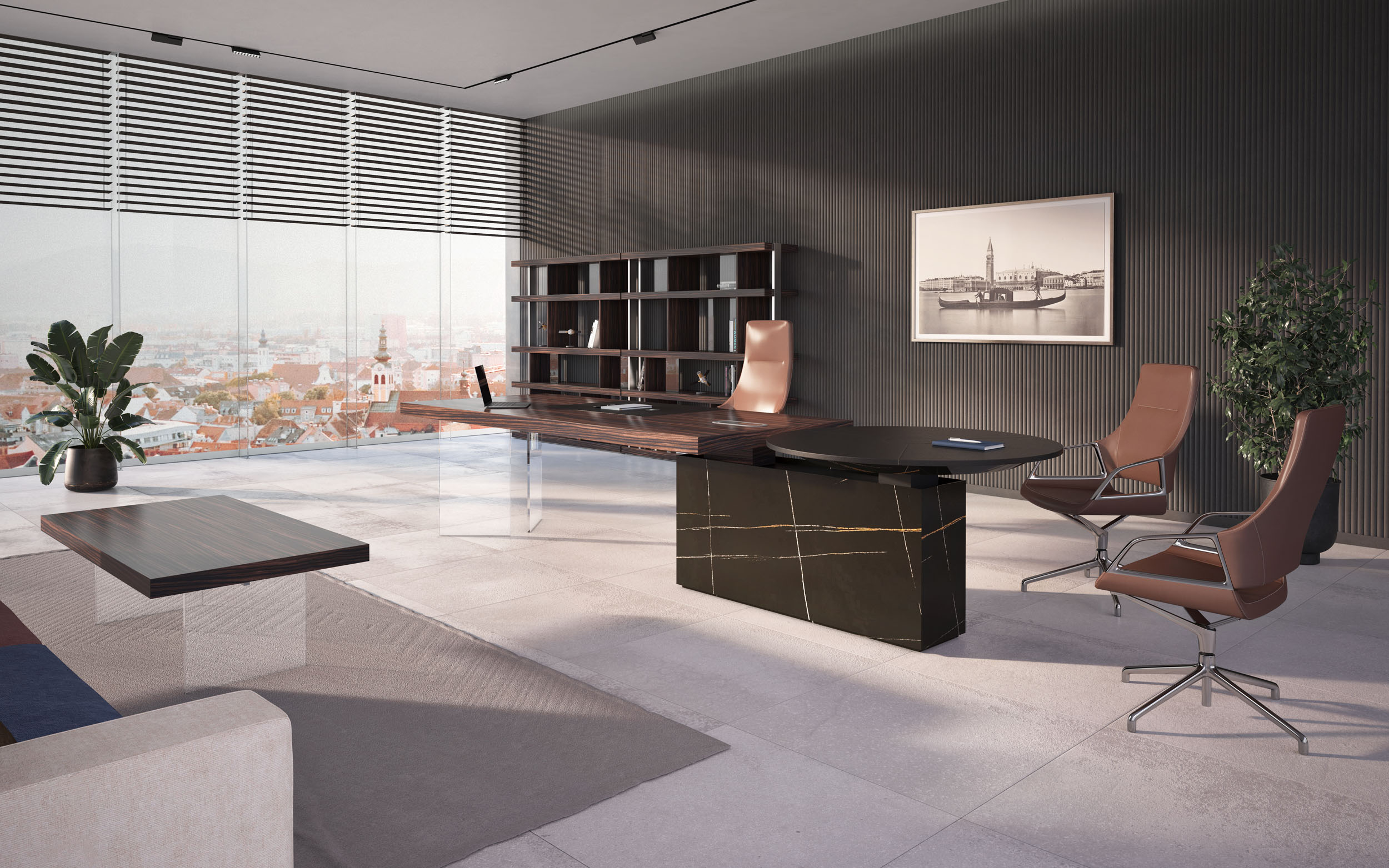 1、台面为60mm厚木纹色,配超级电源、活动皮垫;2、圆台台面扪皮15mm,大立柱升降器;3、超白亚克力脚支撑脚,副柜为木纹色,柜面为岩板,脚箱为岩板 / 实色漆。